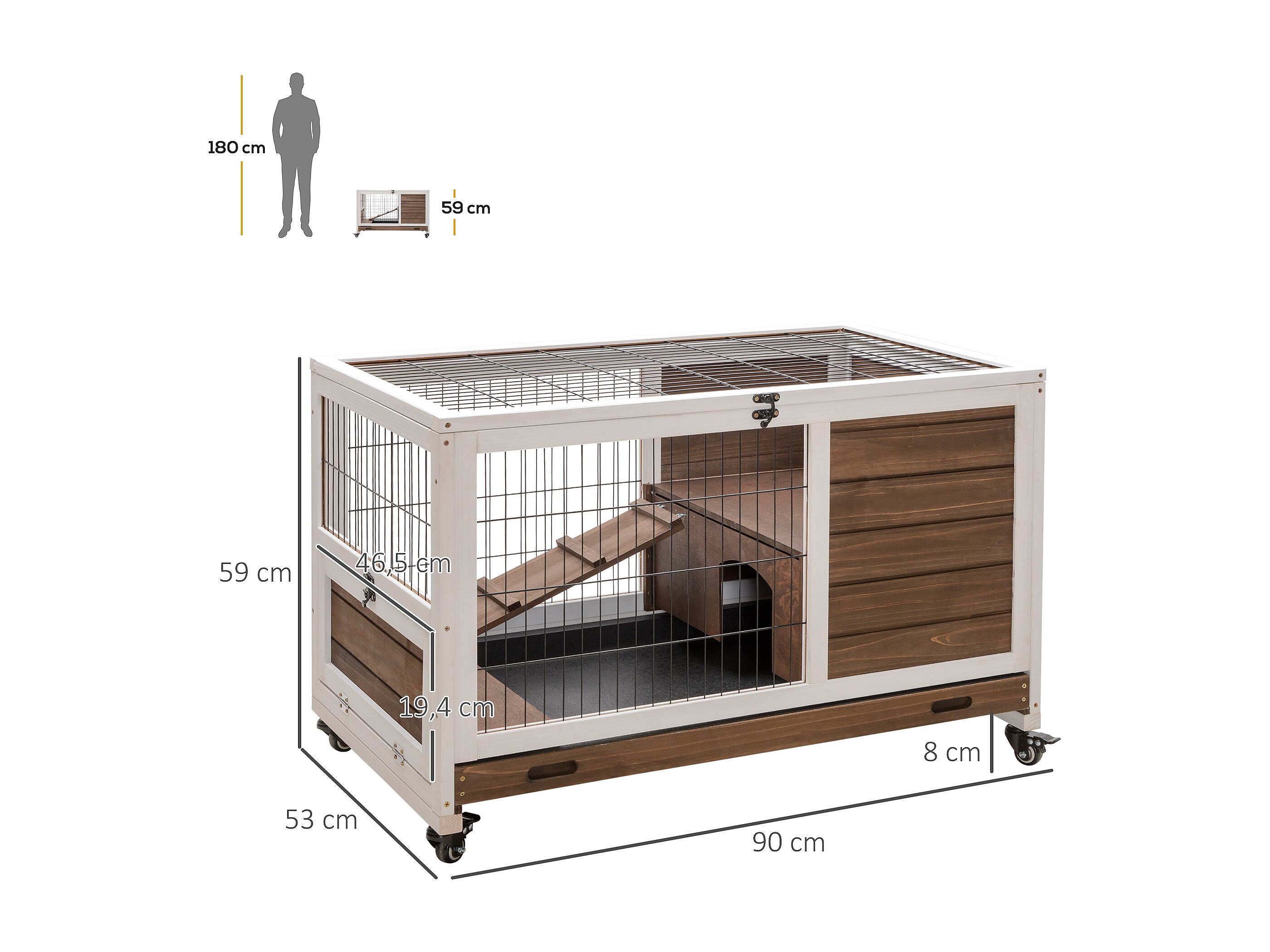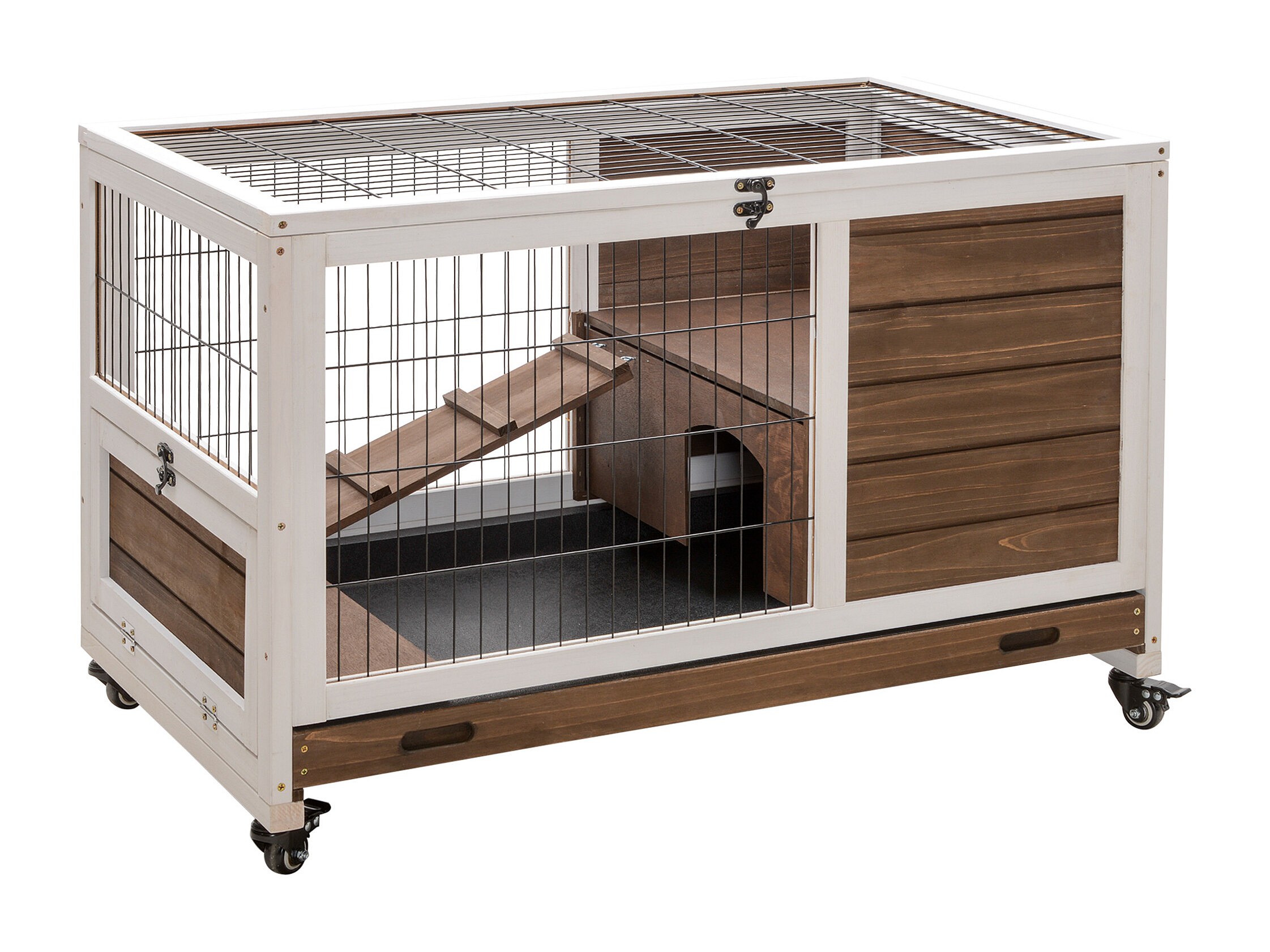 Clapier à lapin sur roulettes cage à lapin 2 étages porte verrouillable toit ouvrant plateau coulissant rampe bois de sapin marron blanc