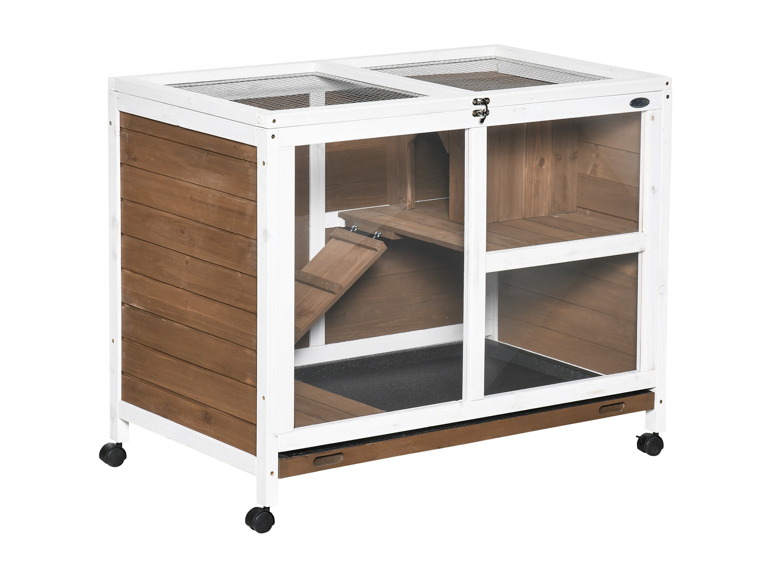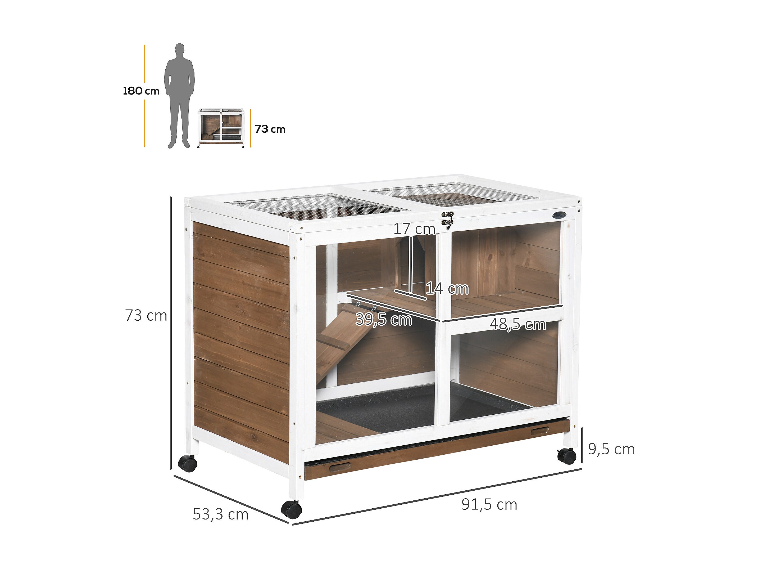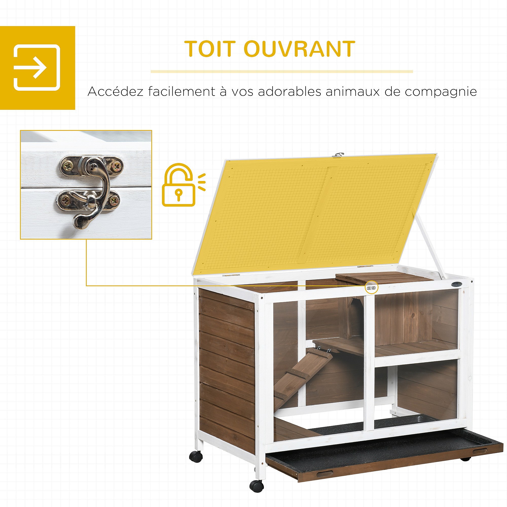 Clapier à lapin sur roulettes cage à lapin 2 niveaux toit ouvrant verrouillable plateau déjection coulissant rampe niche bois de sapin marron blanc