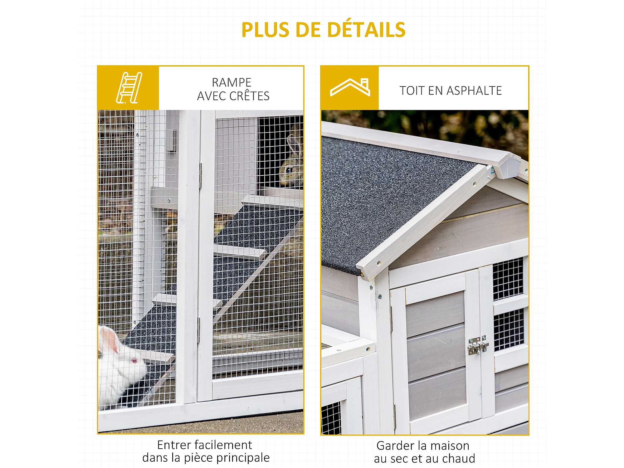 Clapier cage à lapins cottage - niche supérieure avec rampe et enclos extérieur - plateau excrément, toit bitumé, 4 portes verrouillables - bois sapin blanc gris