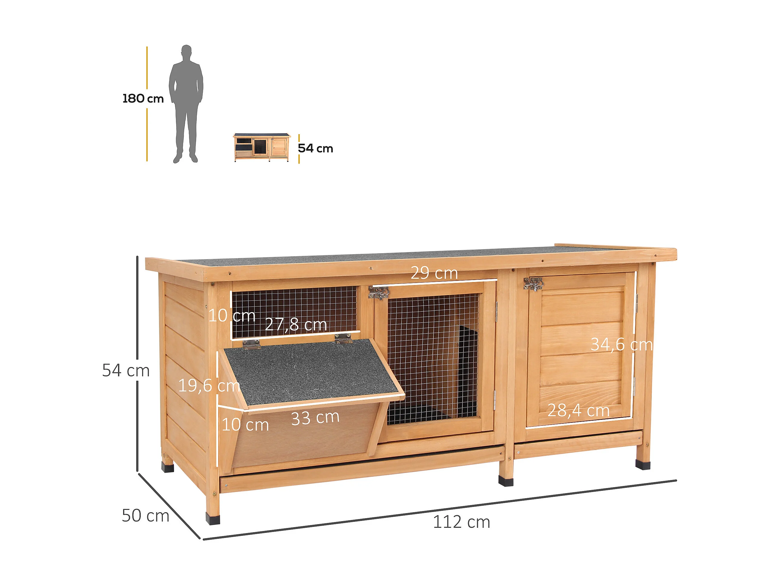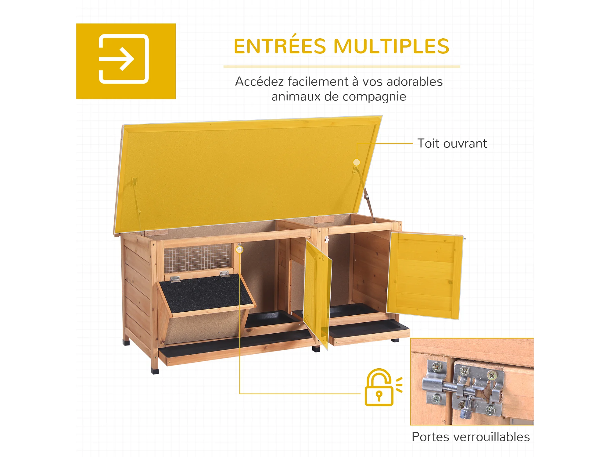 Clapier sur pieds - cage à lapin - 2 plateaux coulissants à excrément, 2 portes verrouillables, toit bitumé ouvrant, râtelier à foin - bois sapin pré-huilé