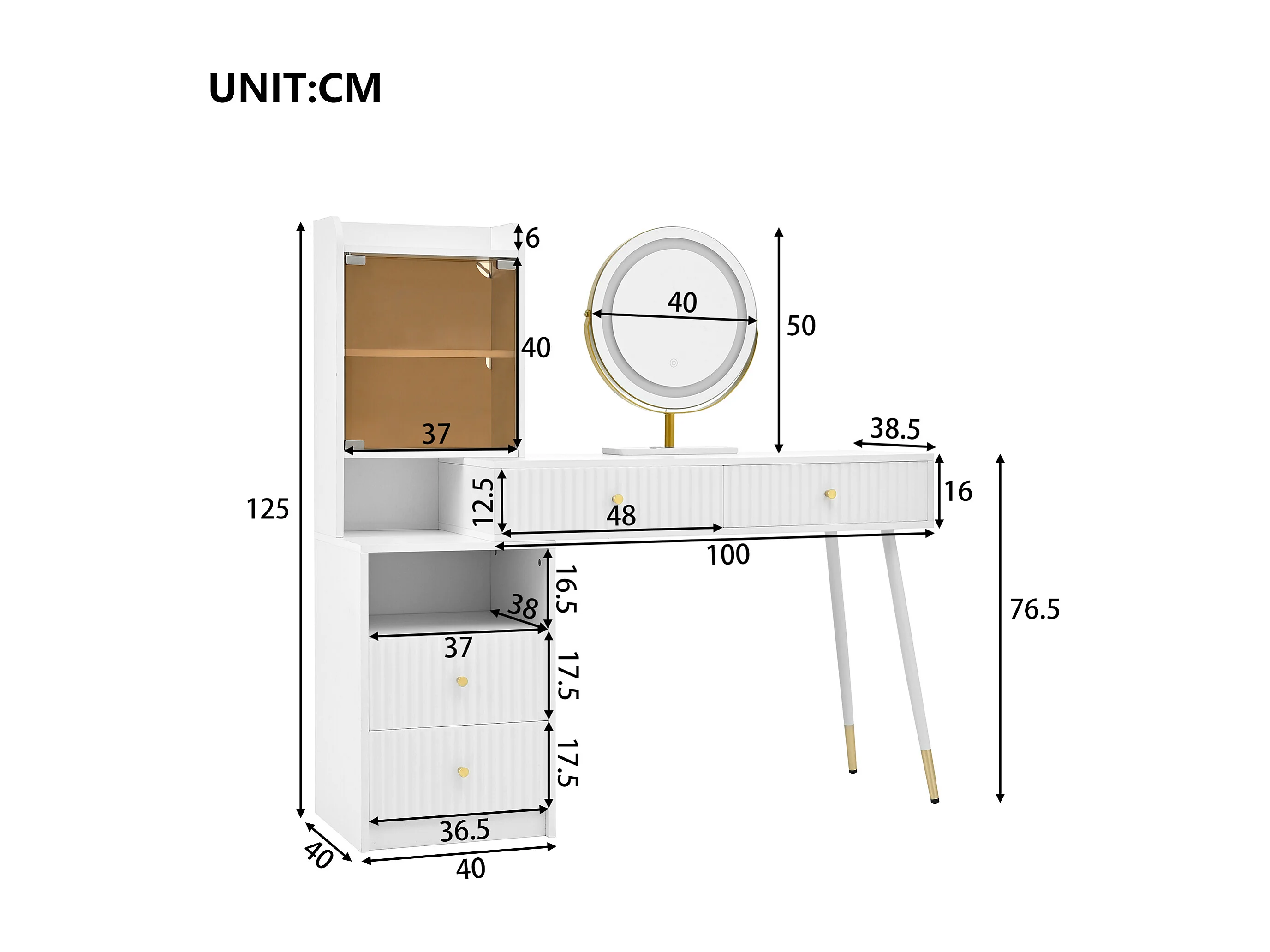 Ensemble de coiffeuse avec miroir Leds + 4 tiroirs + armoire éclairée avec porte vitrée - 100 x 40 x 125 cm - aggloméré - Blanc