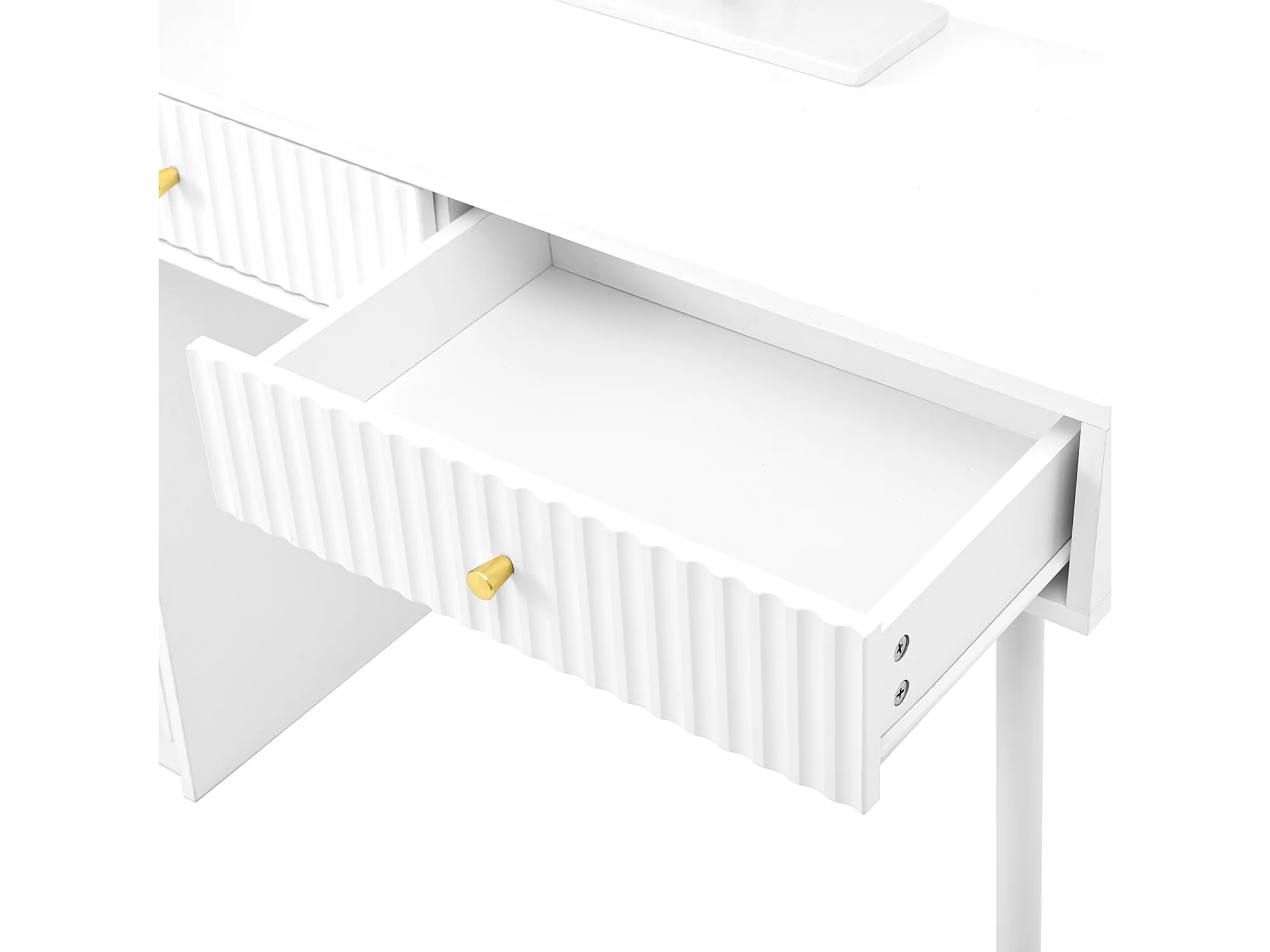 Coiffeuse 105x40x80 cm avec LED Sept tiroirs et étagères latérales ouvertes Bureau pliable Panneaux de particules en blanc pour Chambre