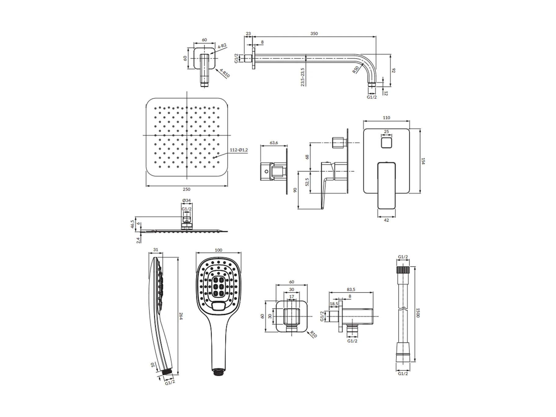 Colonne de Douche SucceBuy Kit de Douche, Système de Pluie avec Pommeau Carré 254 mm, Douchette à Main et Kit de Montage Mural, Finition Argentée