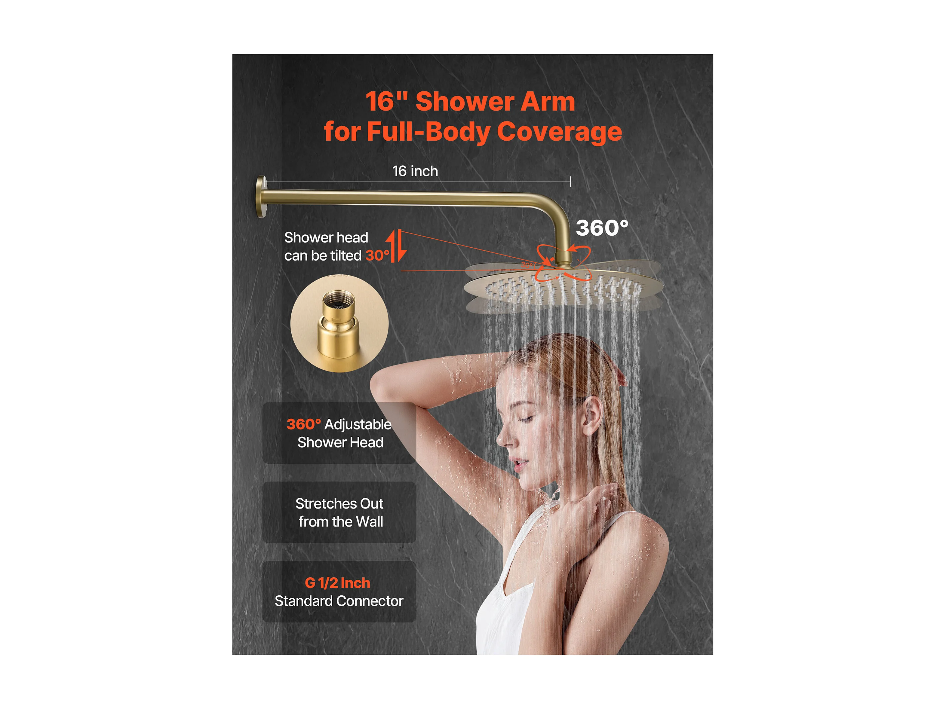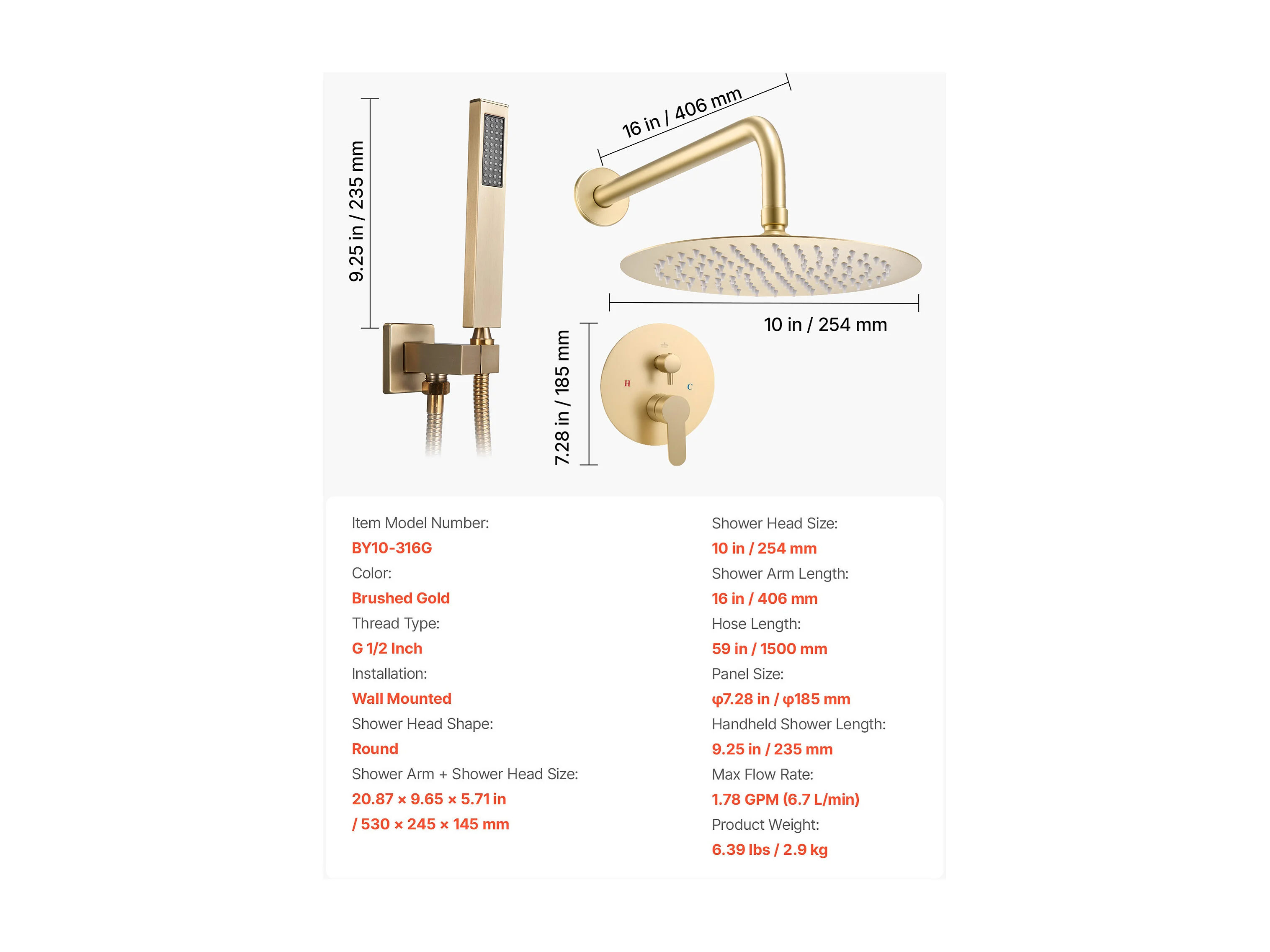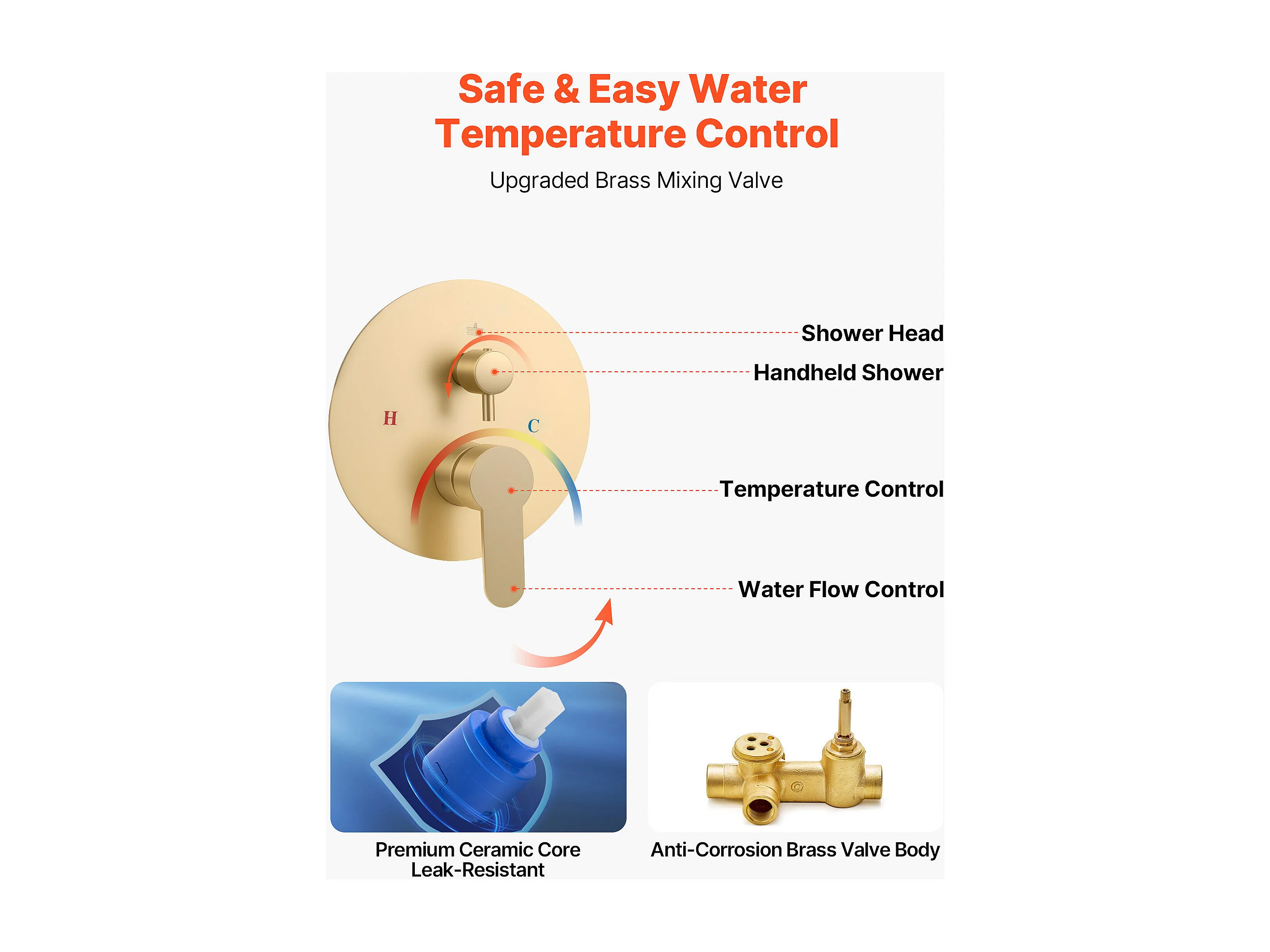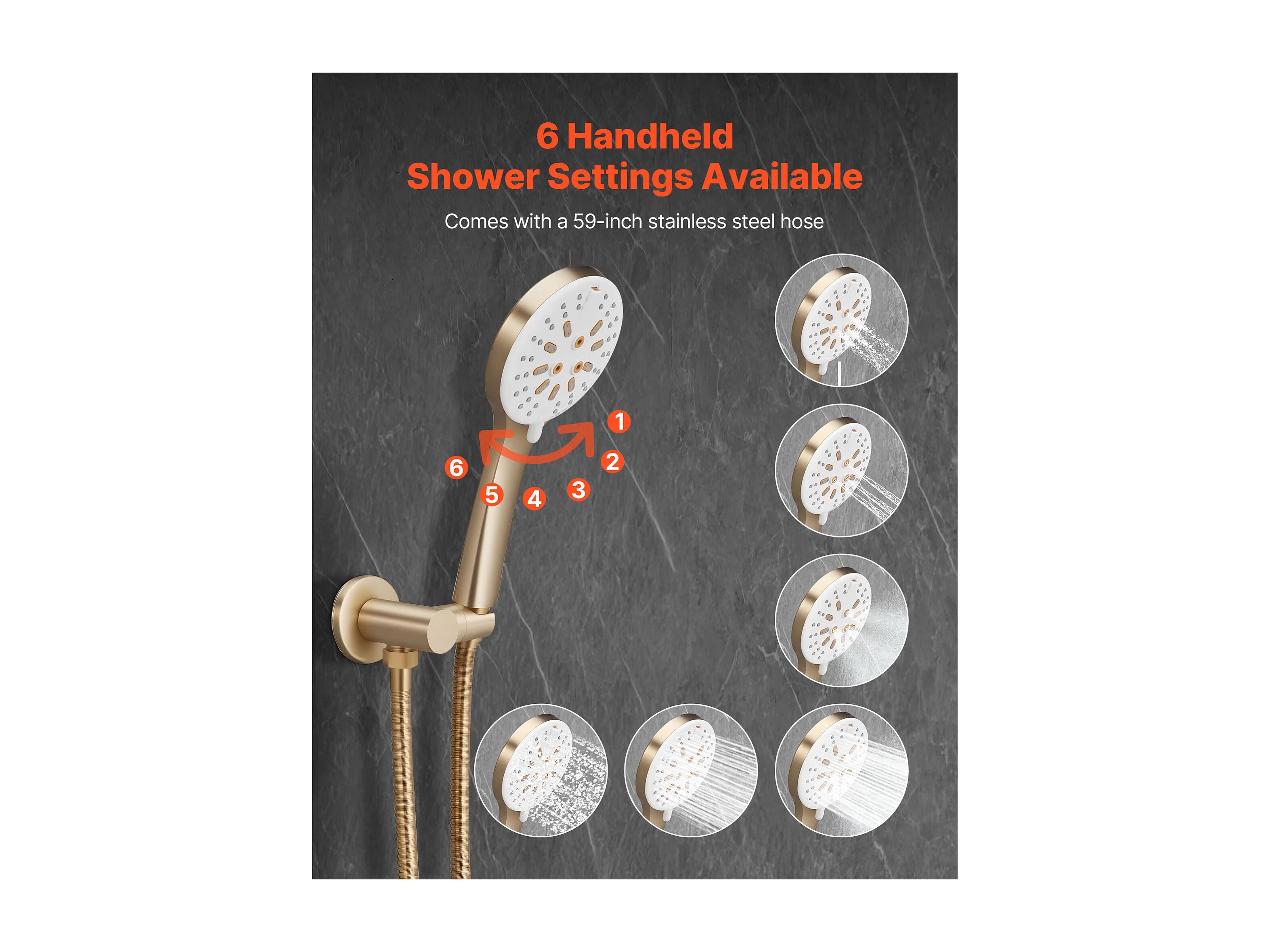 Colonne de Douche SucceBuy Kit de Douche, Système de Douche Pluie avec Pommeau Rond de 254 mm, Douchette à Main et Kit de Montage Mural, Finition or Brossé