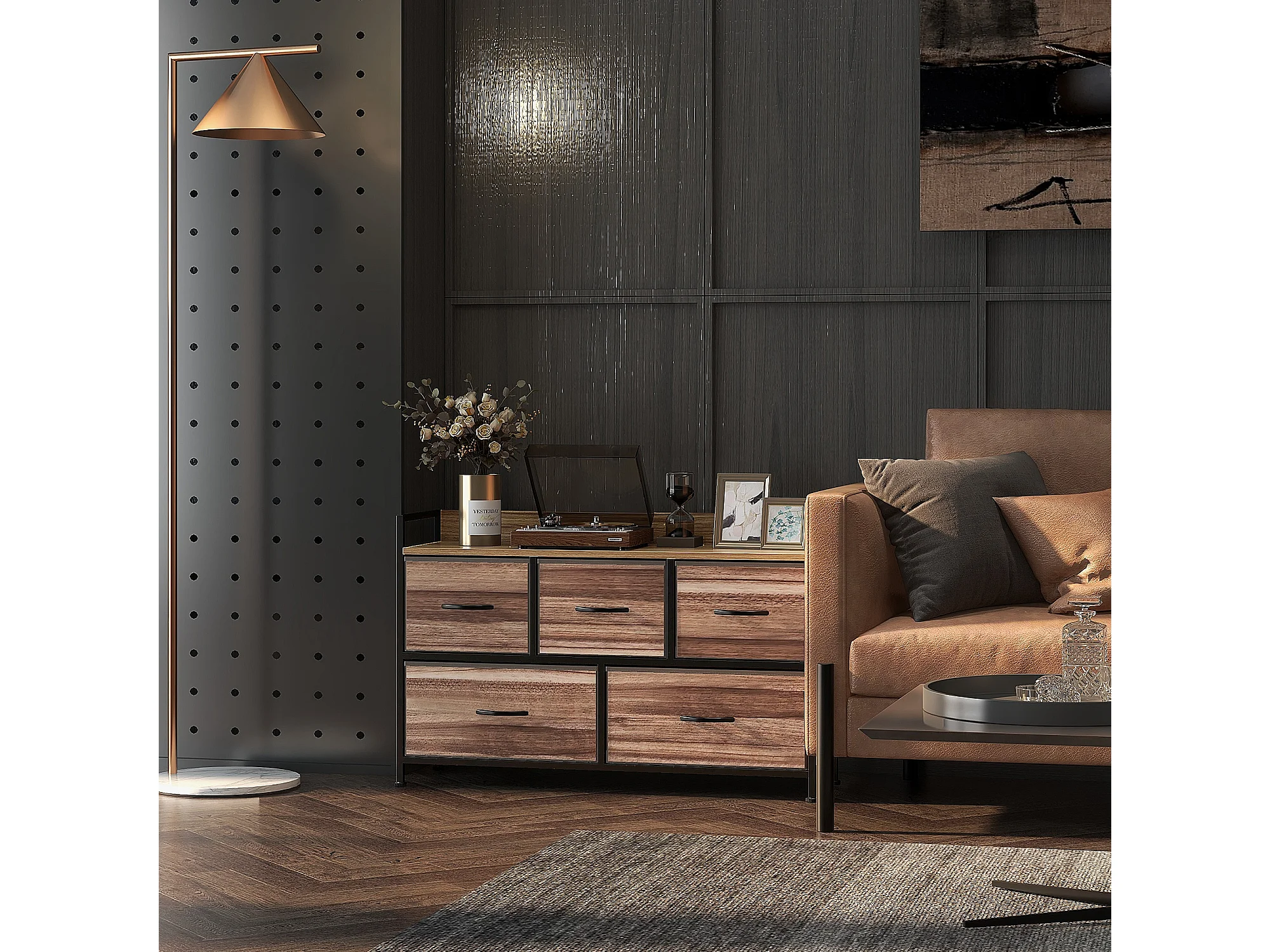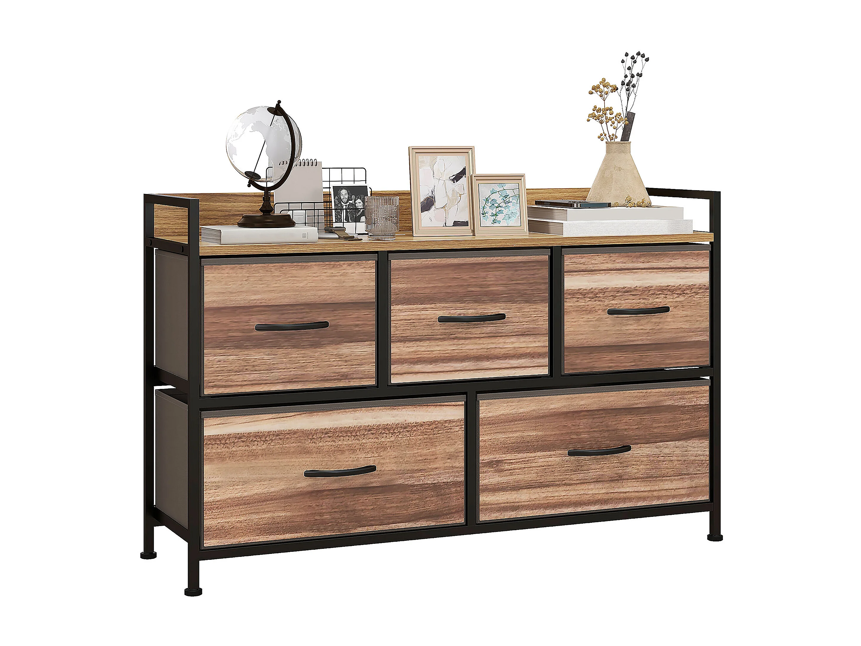 Commode 5 tiroirs et étagère - 98 x 29 x 63 cm - châssis métal noir tiroirs non tissés aspect bois