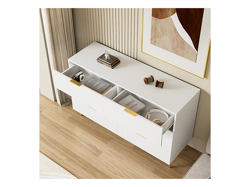 Commode 6 tiroirs - avec aux poignées et aux pieds dorés - surface ondulée - Blanc - 120x40x77cm