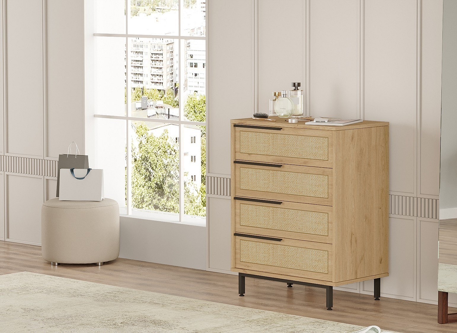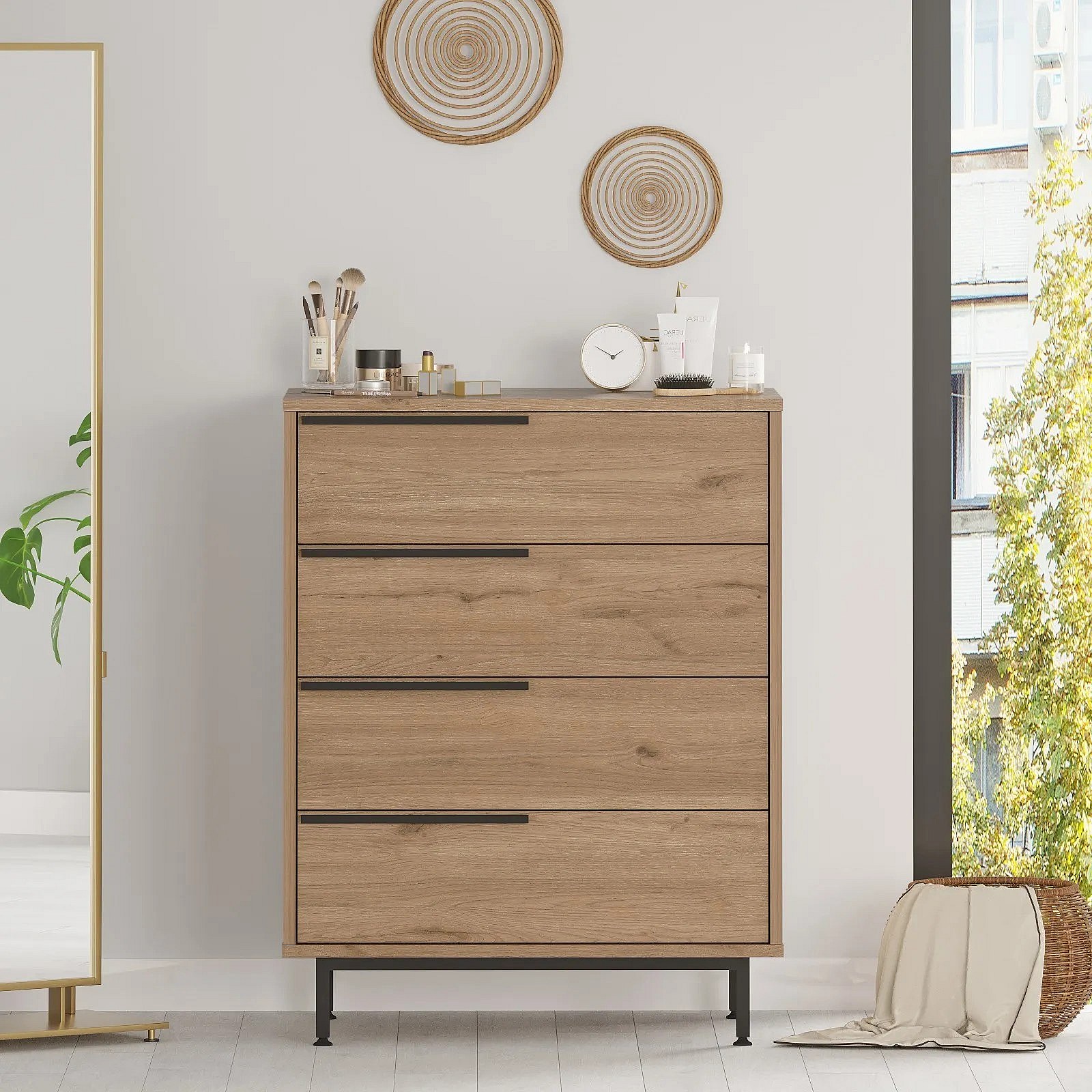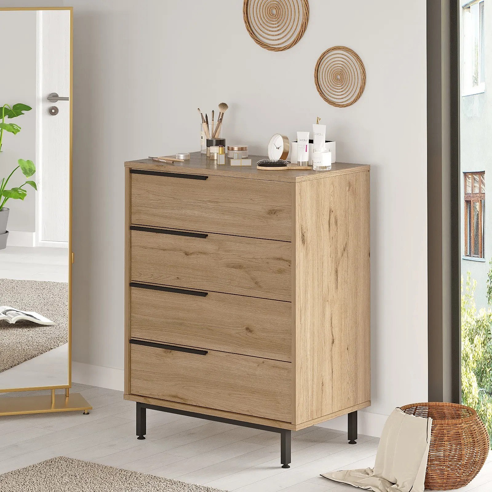 Commode 4 tiroirs bois et rotin Zenax 75cm-Couleur Chêne clair