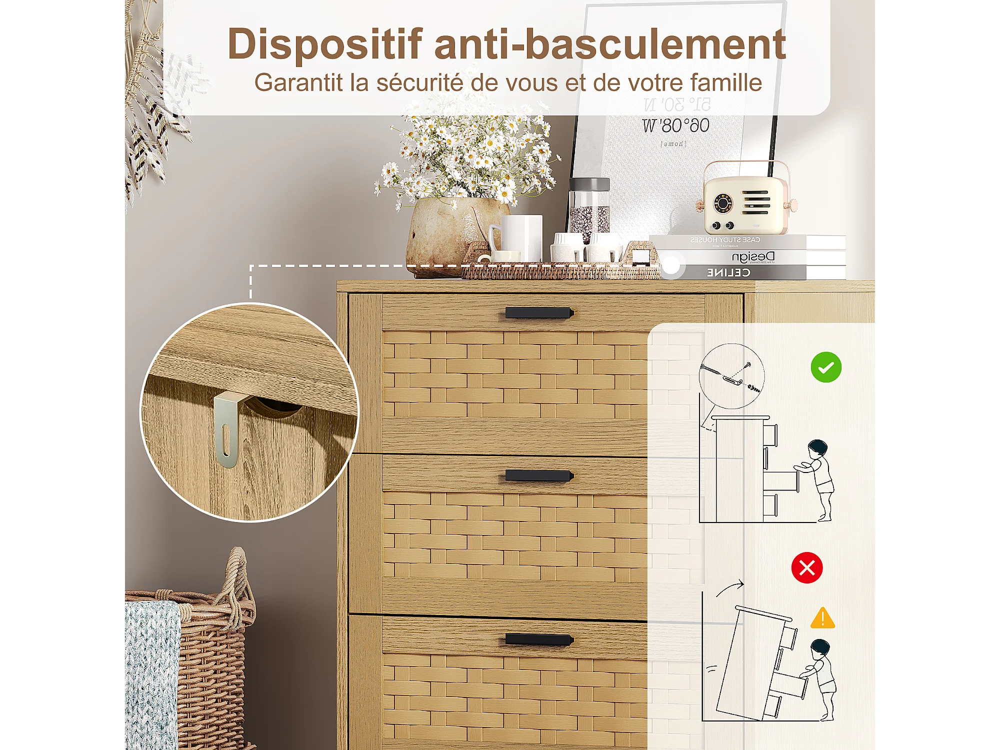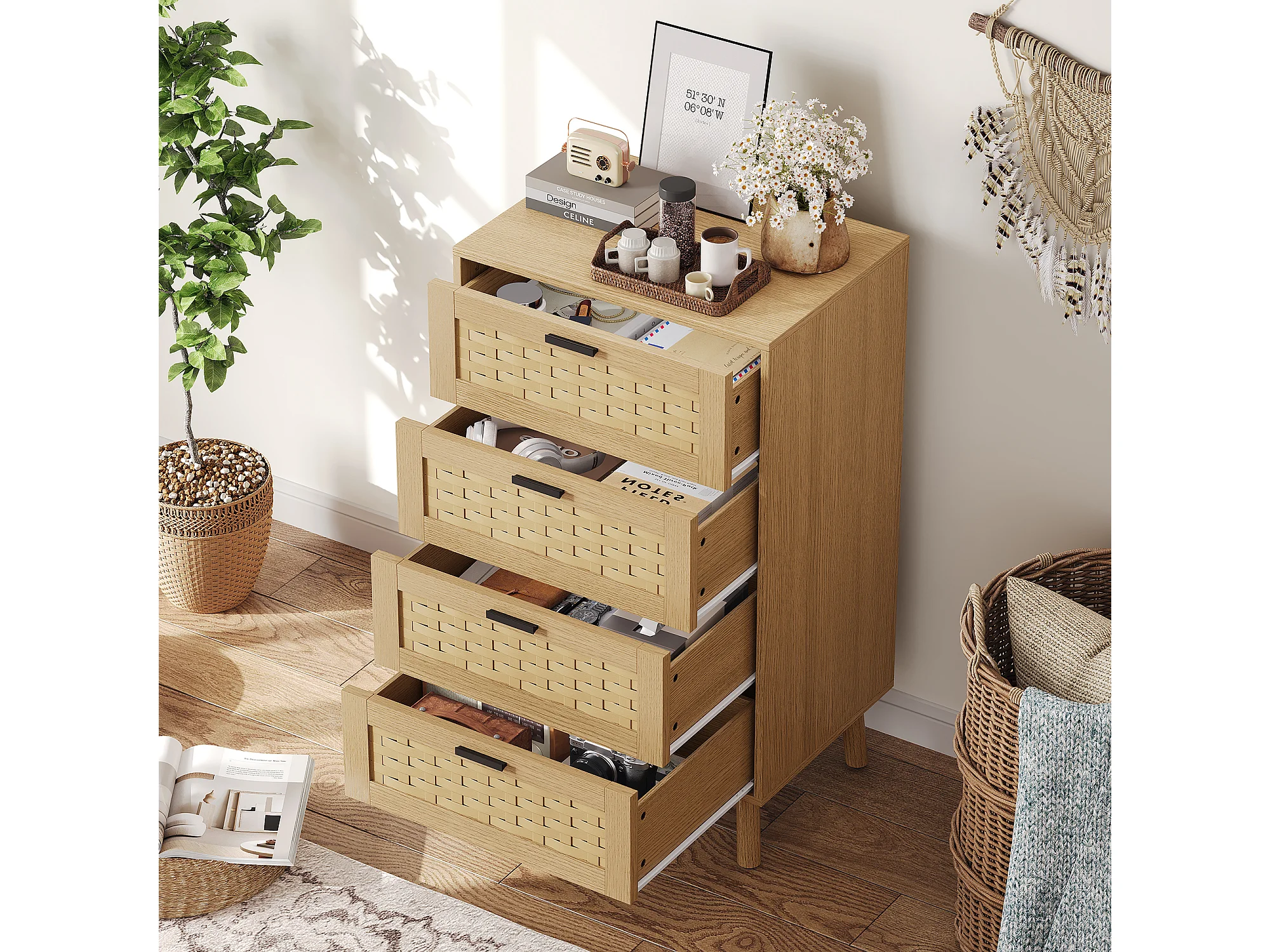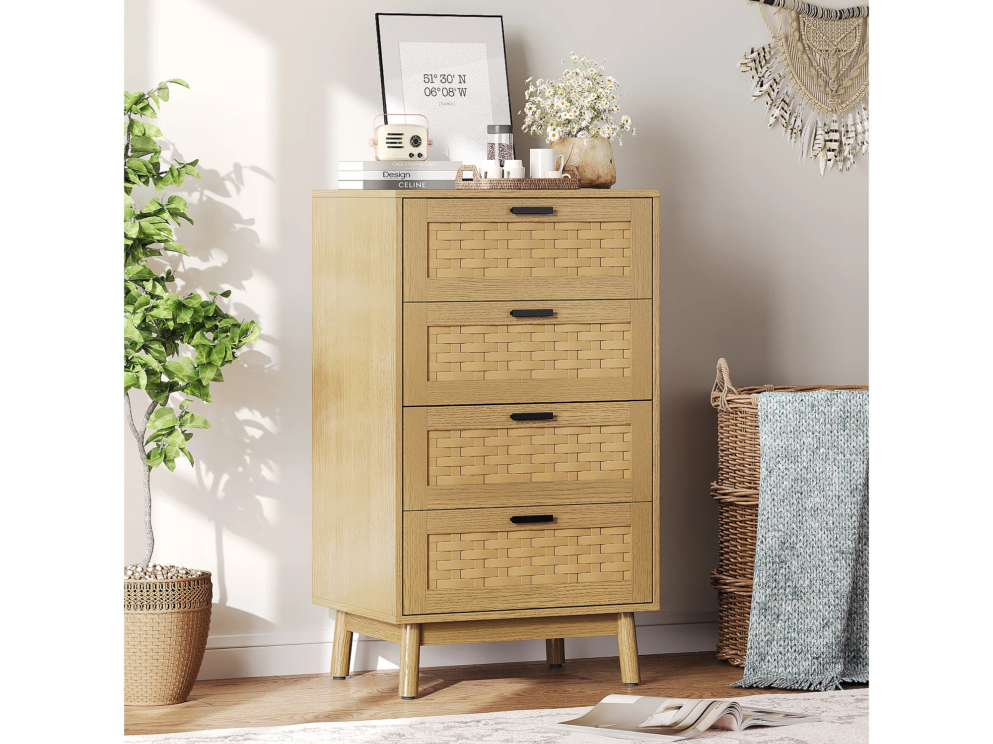 Commode en osier à 4 tiroirs - avec poignées et pieds - 55 x 39,8 x 95 cm - meuble de rangement - couleur chêne