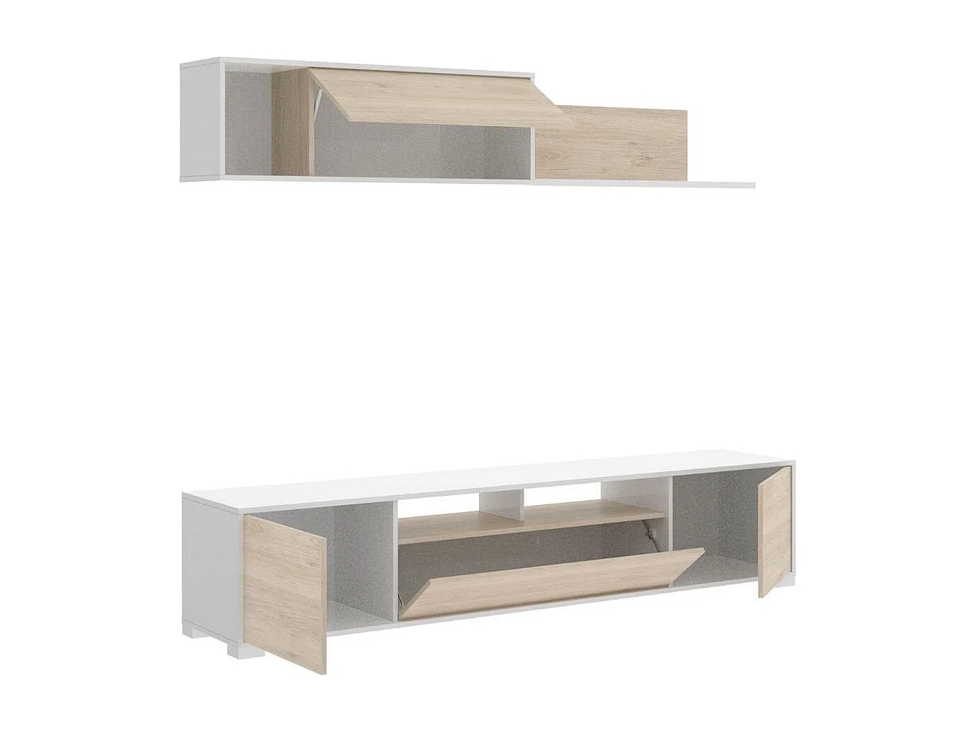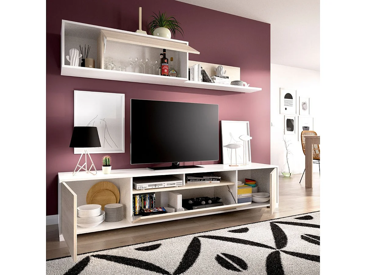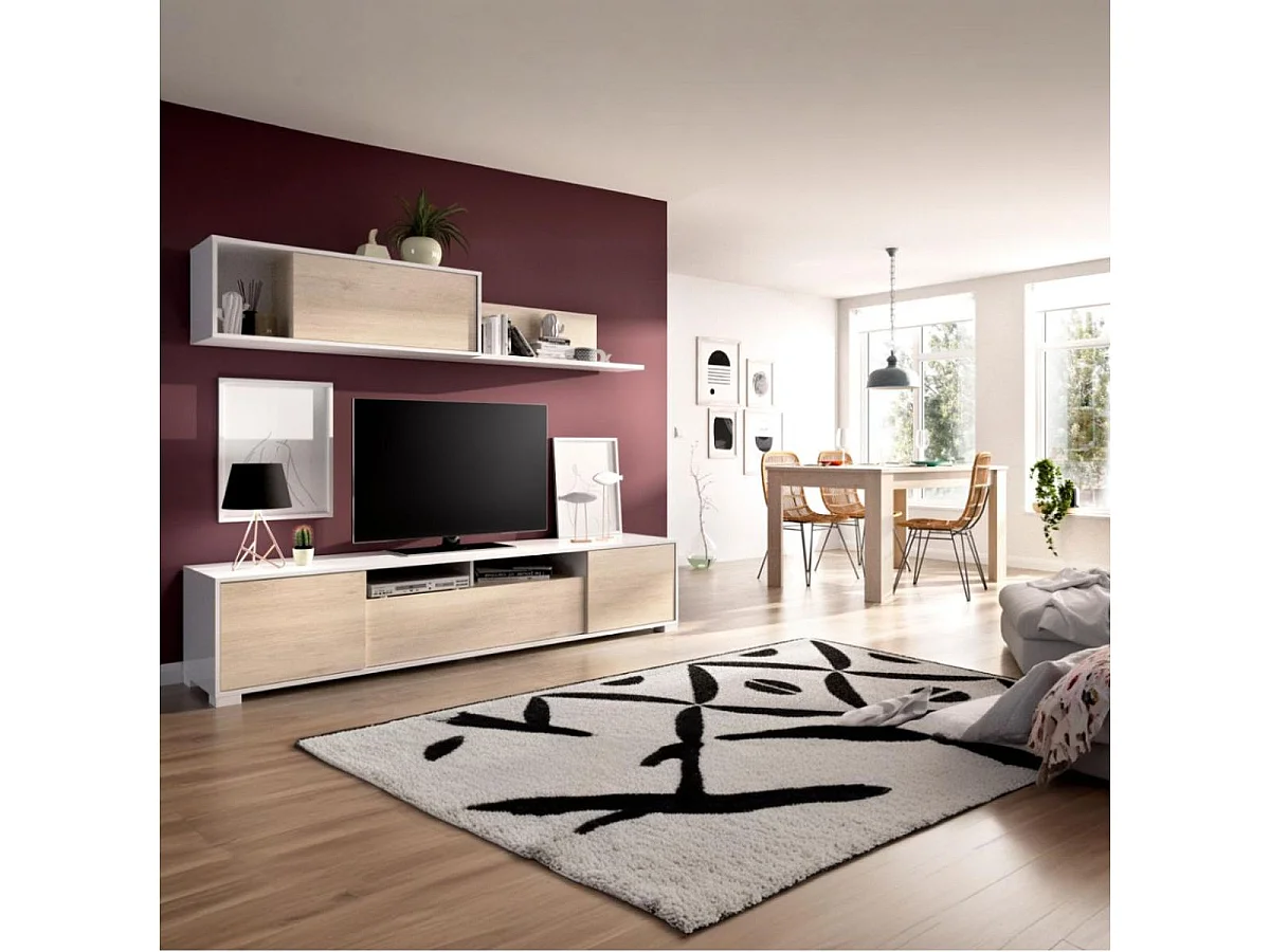 Composition salon TV KEN KEN 200x41x180 cm - Mélamine blanc brillant & chêne naturel