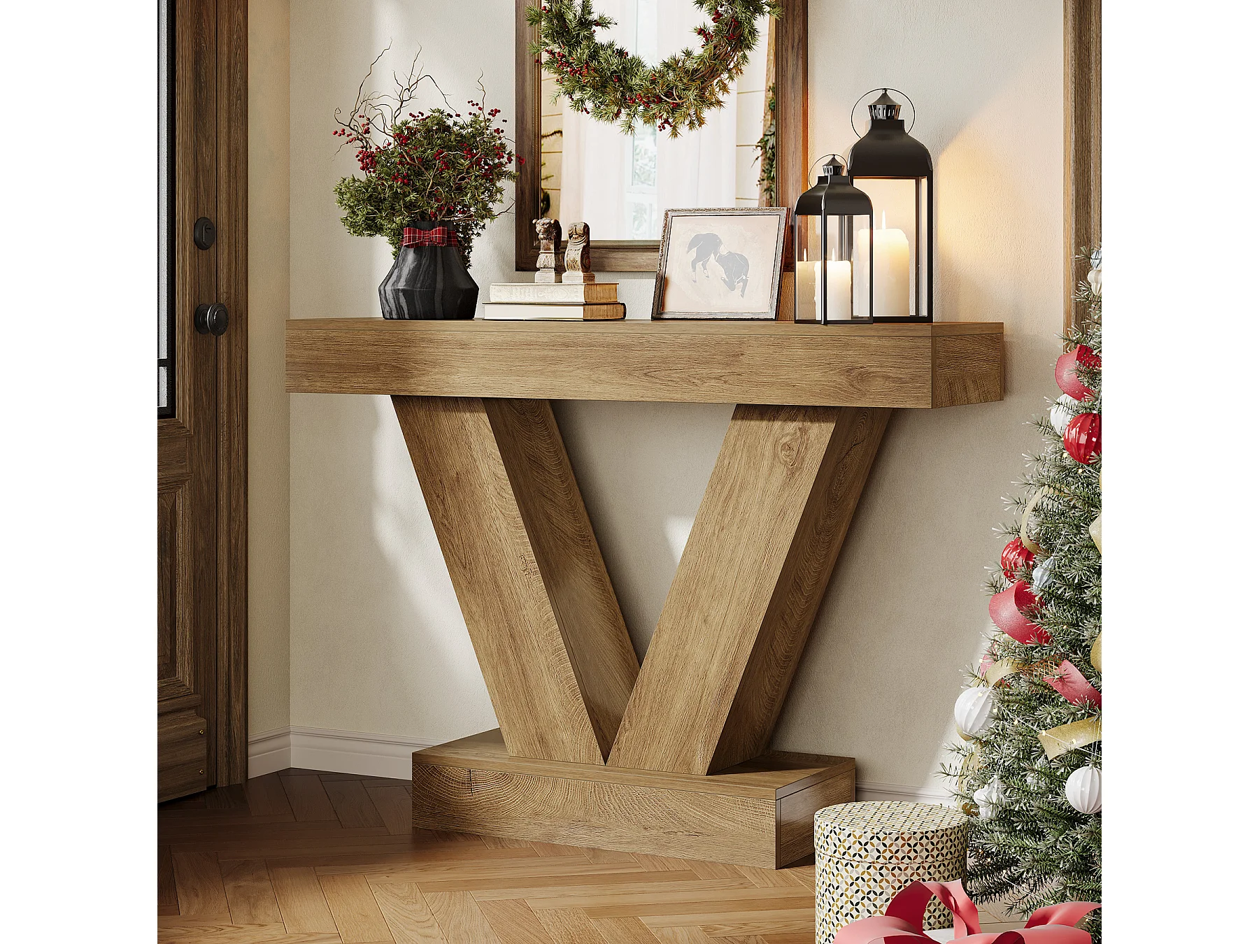 Console de 105 cm, table d'entrée avec pieds en V, idéale pour le salon ou le couloir, à placer derrière un canapé ou un fauteuil.