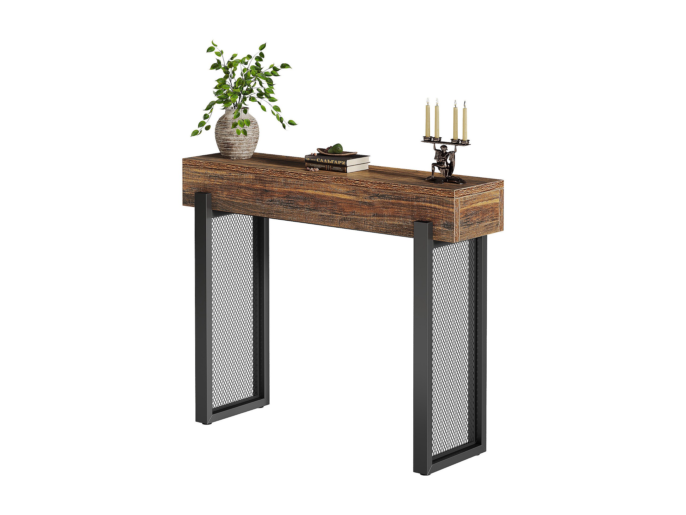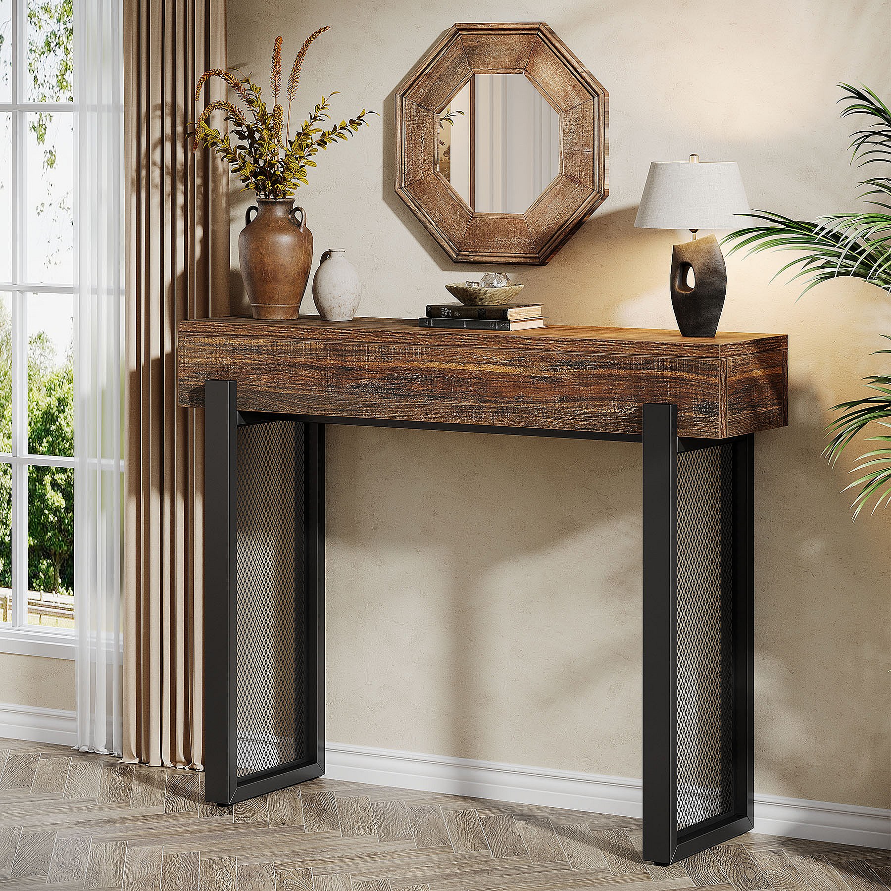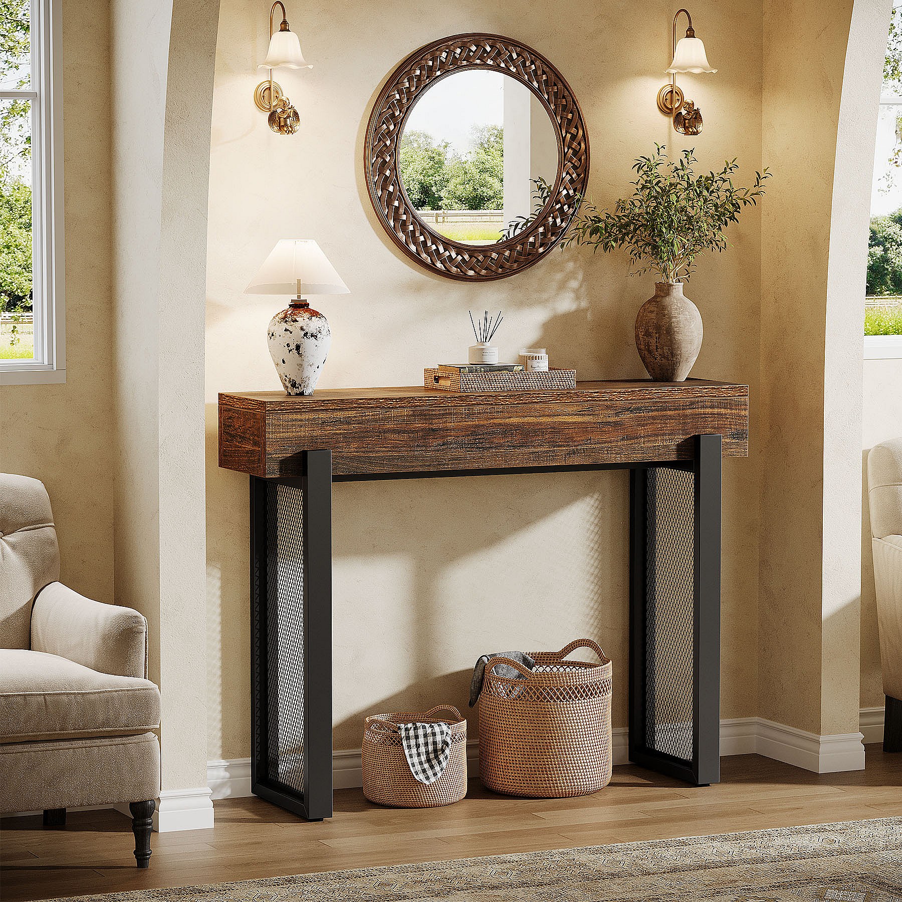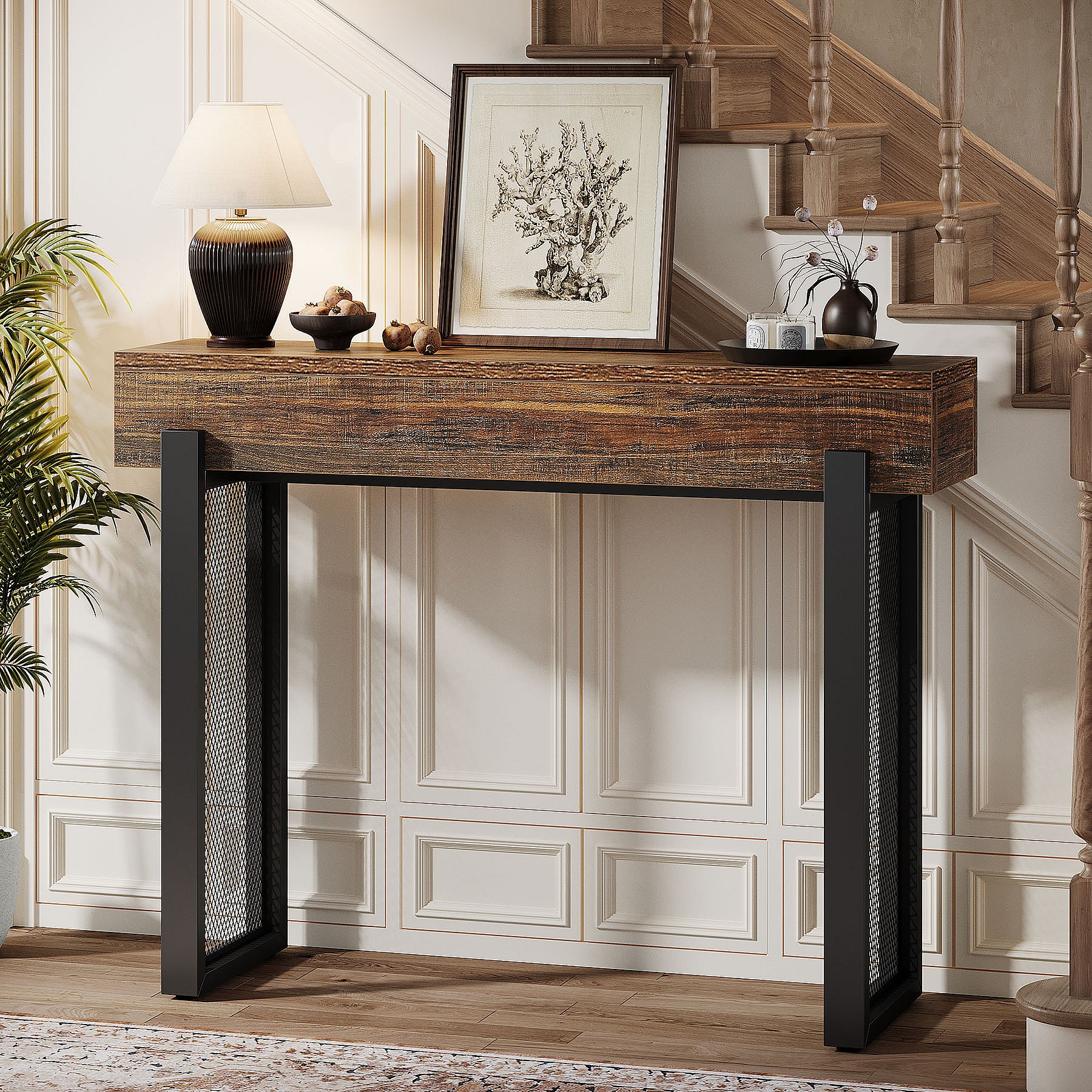 Console en bois de 105 cm avec rangement, petite table d'entrée industrielle avec pieds en métal maillé