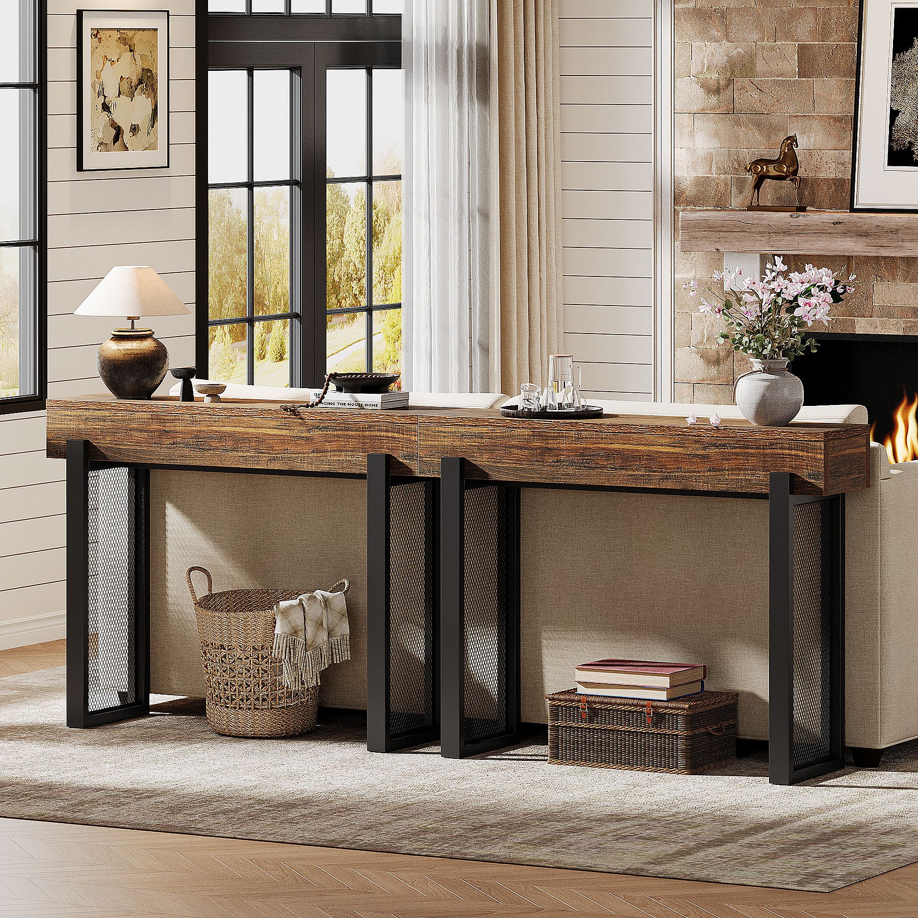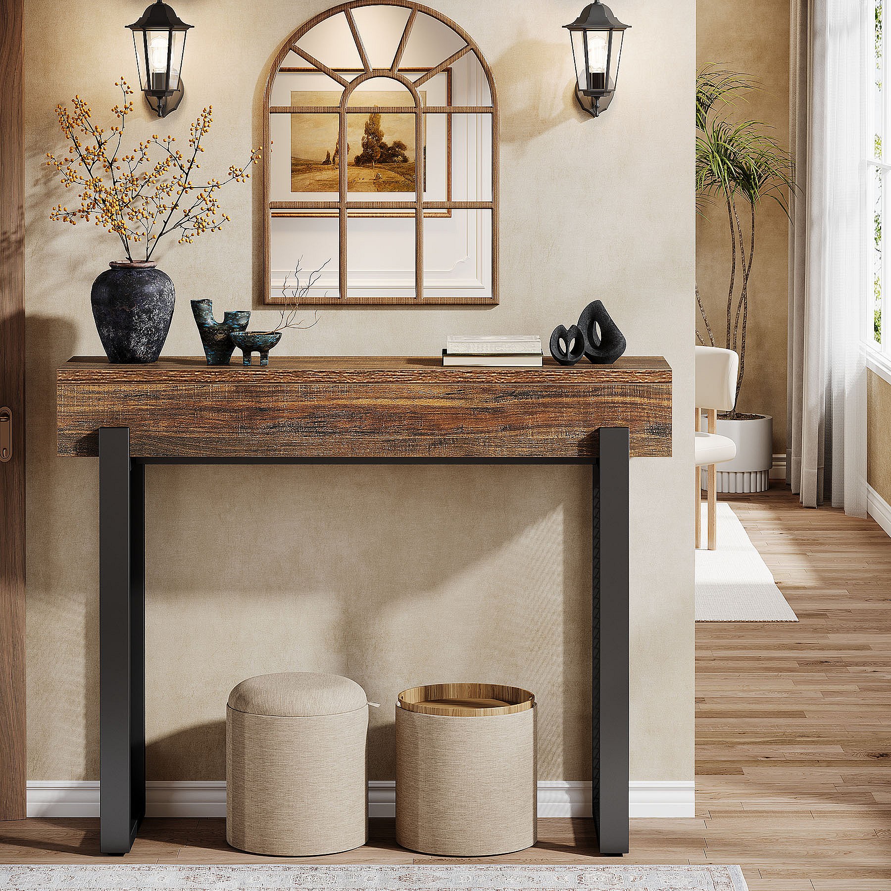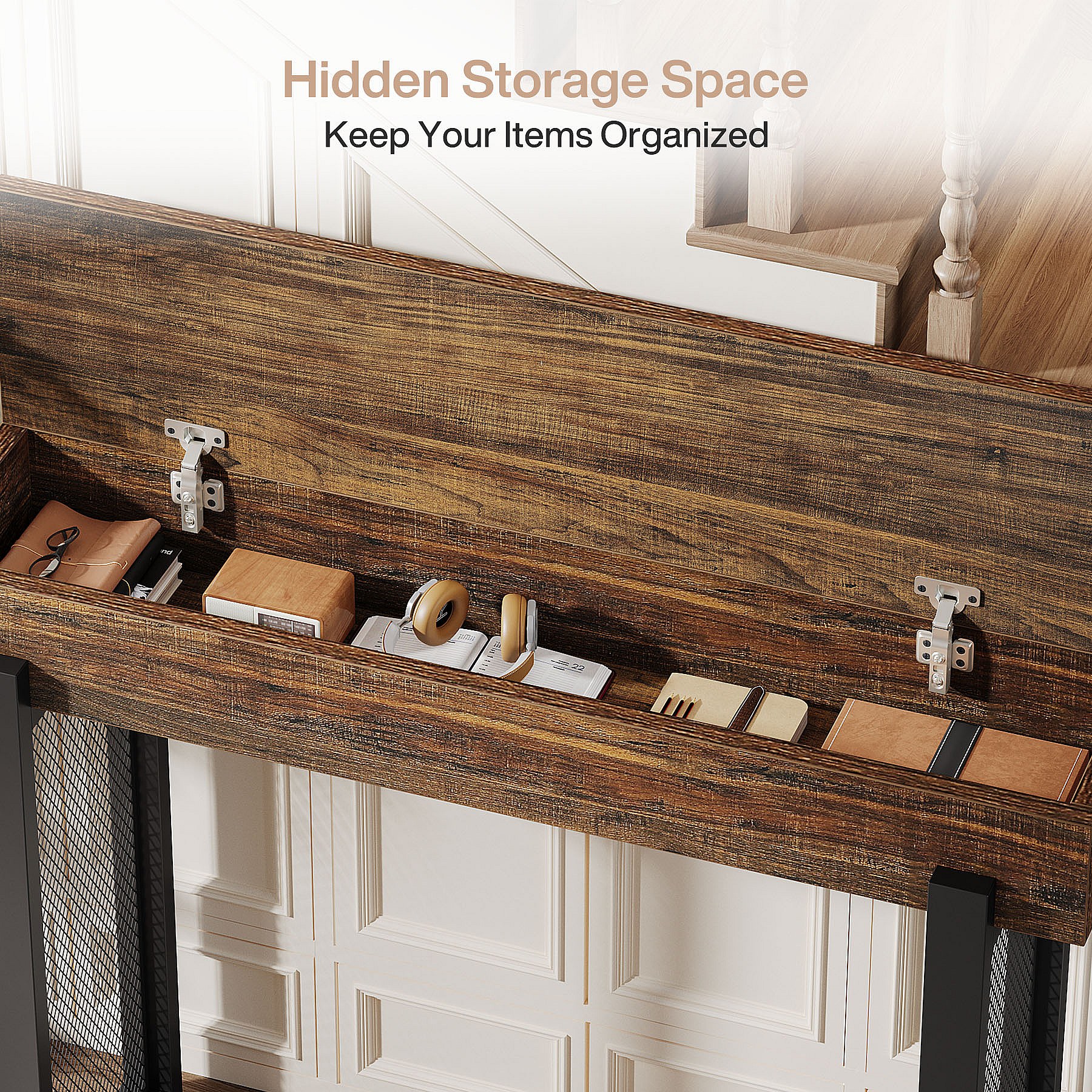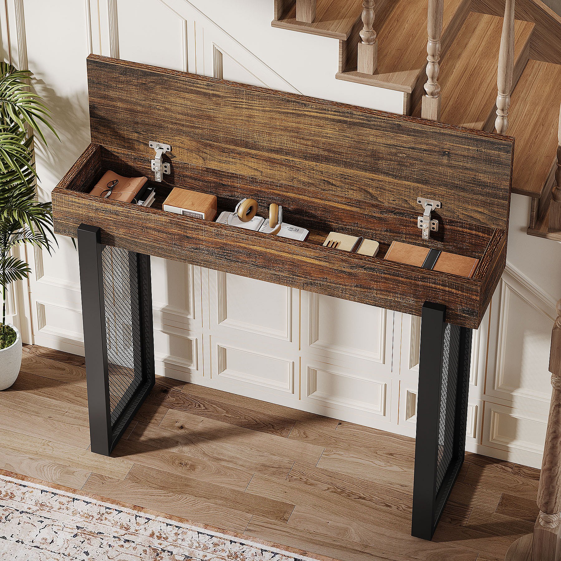 Console en bois de 105 cm avec rangement, petite table d'entrée industrielle avec pieds en métal maillé
