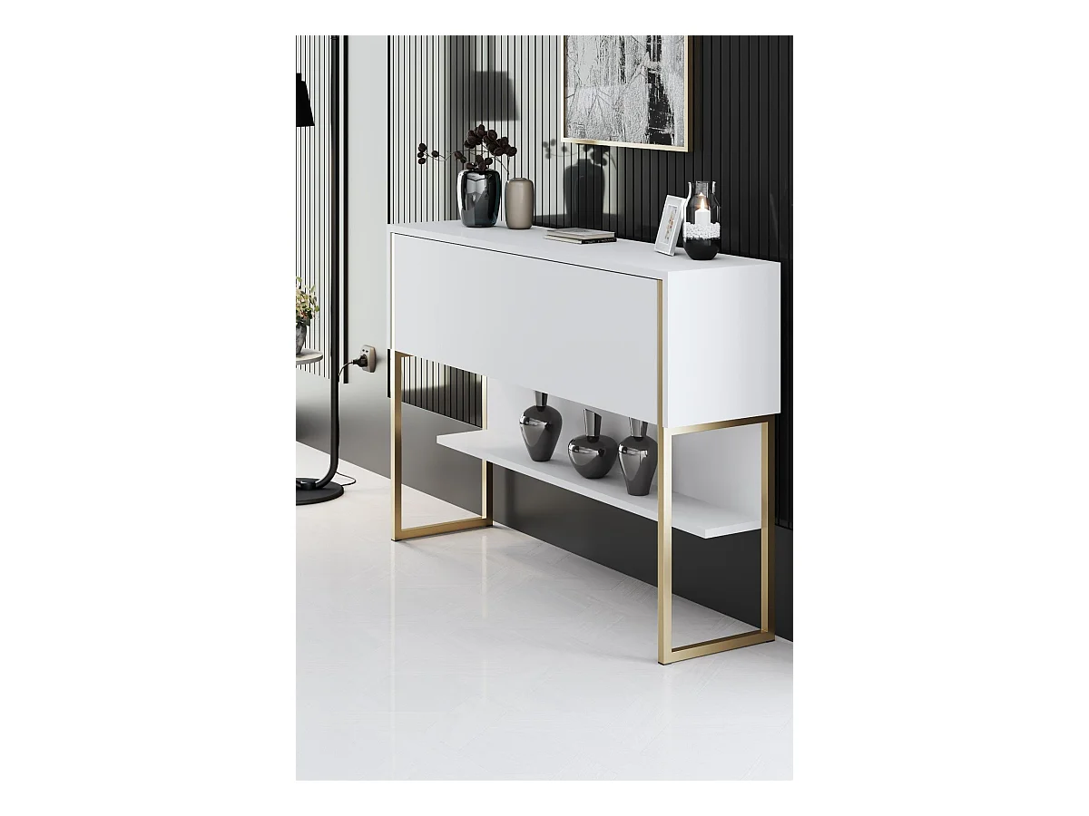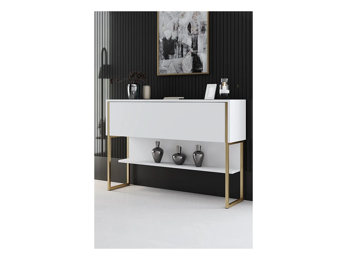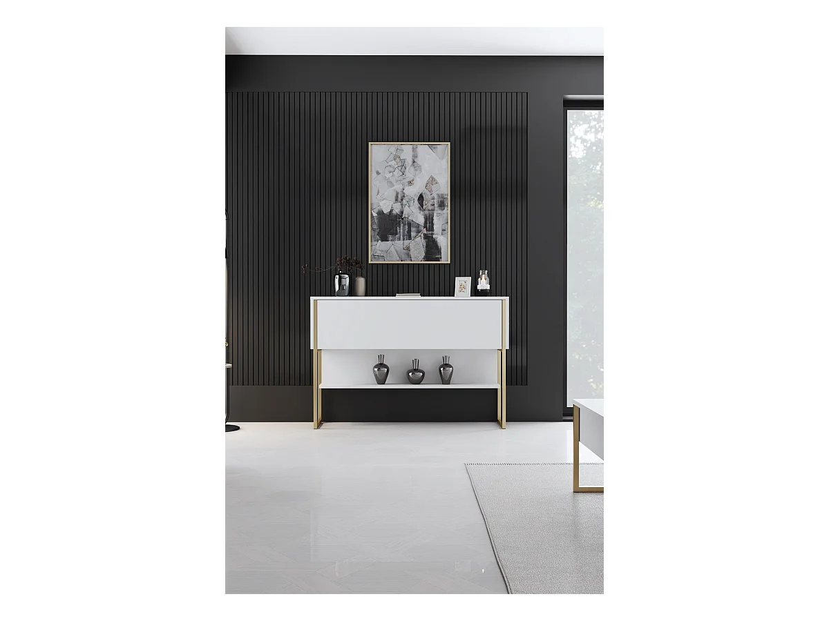 Console moderne 1 porte Sibylle L120cm Bois Blanc et Métal Or