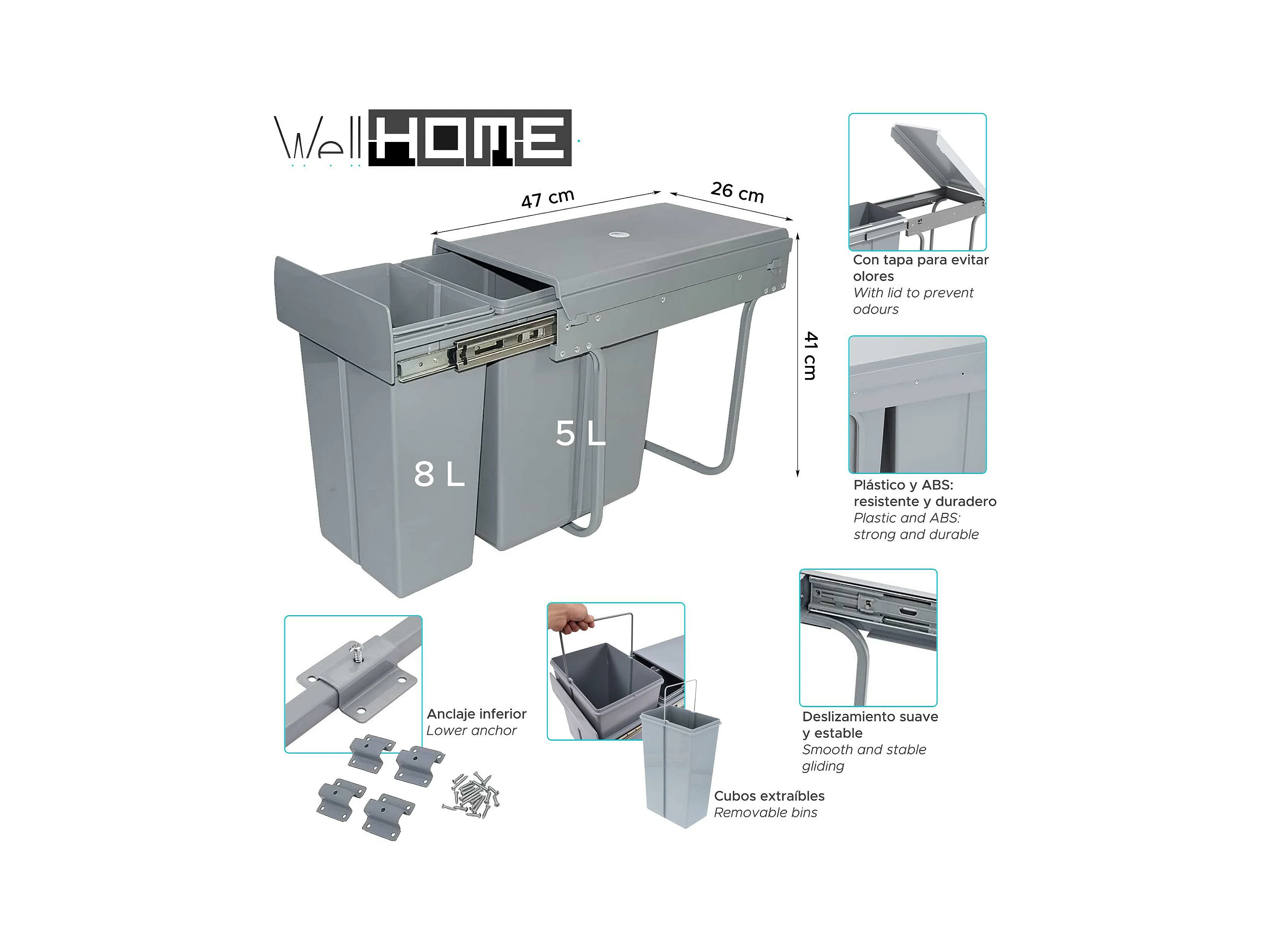 Conteneur de tri pour meuble de cuisine, poubelles sous évier 8L+5L, fixation par le bas et extraction manuelle, poubelles amovibles, avec couvercle