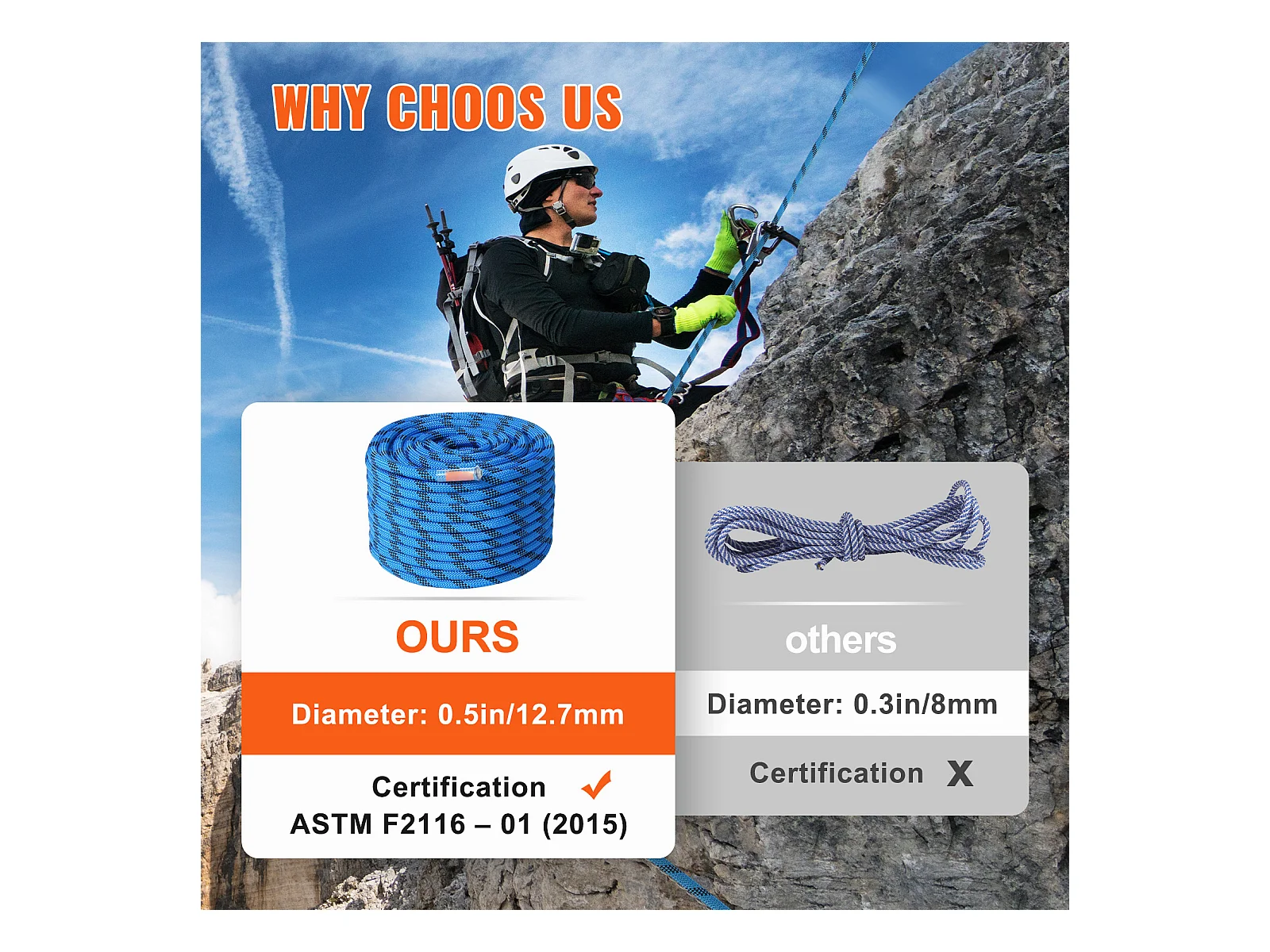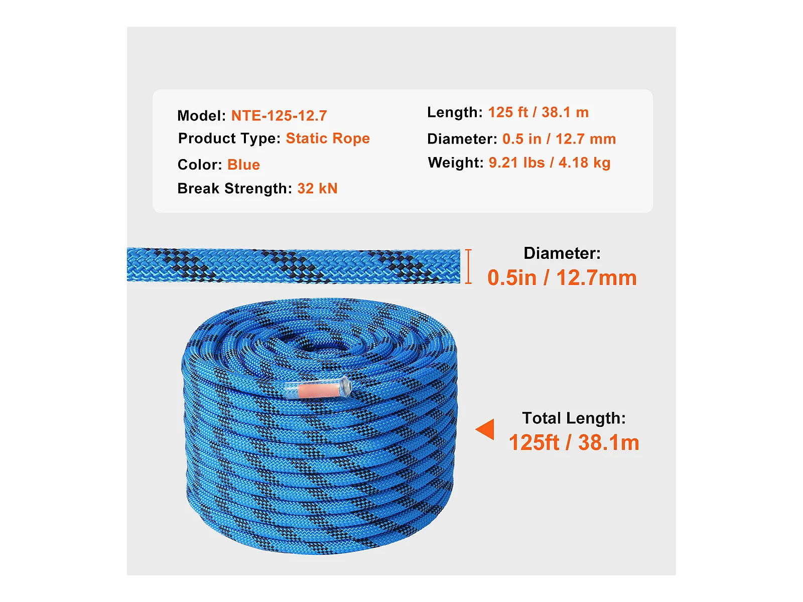 Corde d'Escalade Statique SucceBuy, 12,7 mm, 38 m, Bleue pour Escalade en Extérieur