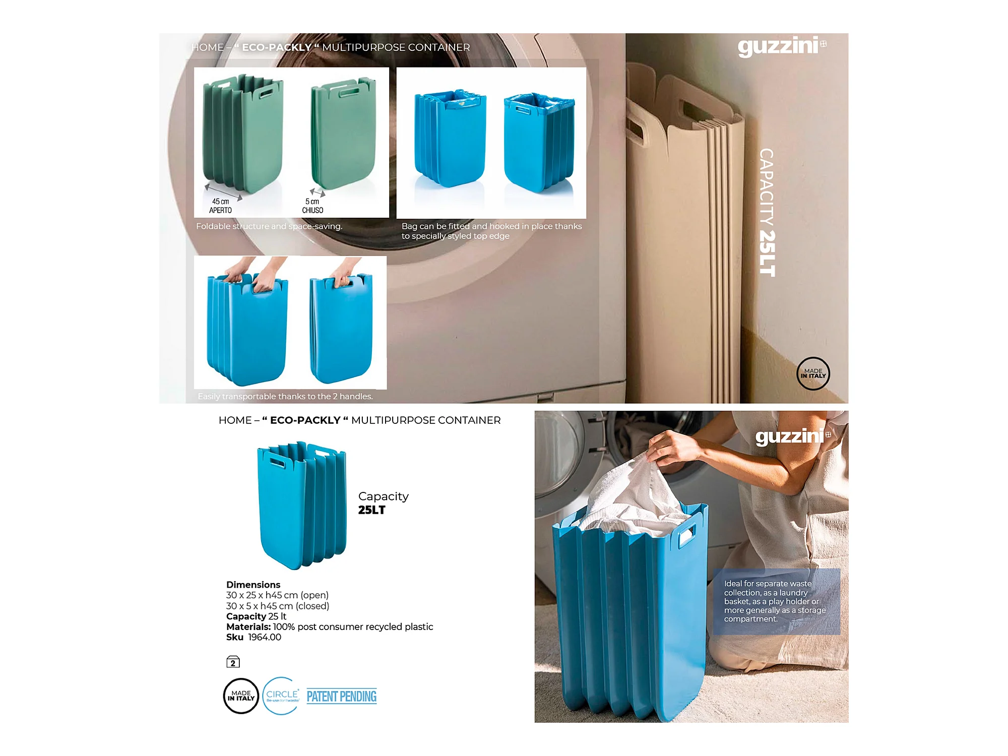 Cube de déchets multi-moussant 3x set pliable 25 litres One (total 75L), en plastique recyclé, 45x30 cms, en couleur