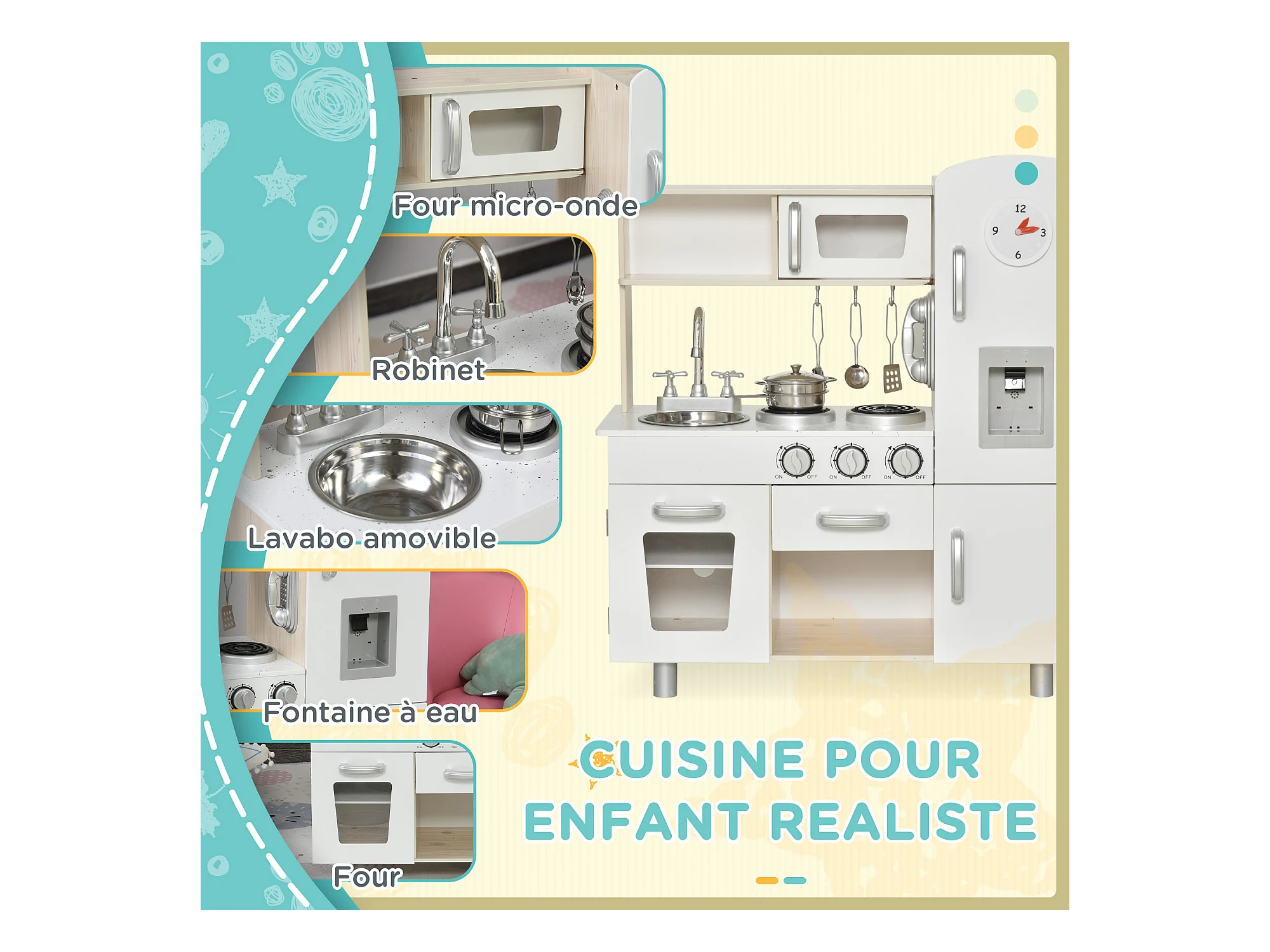 Cuisine bois jeu d'imitation - cuisine enfant - nombreux accessoires & rangements inclus - MDF pin blanc