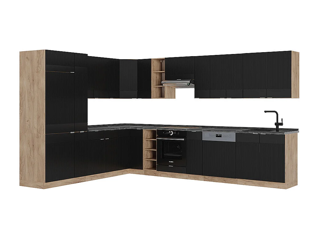 Cuisine en angle noir rayé/chêne doré 347x60x81.6 fame-line