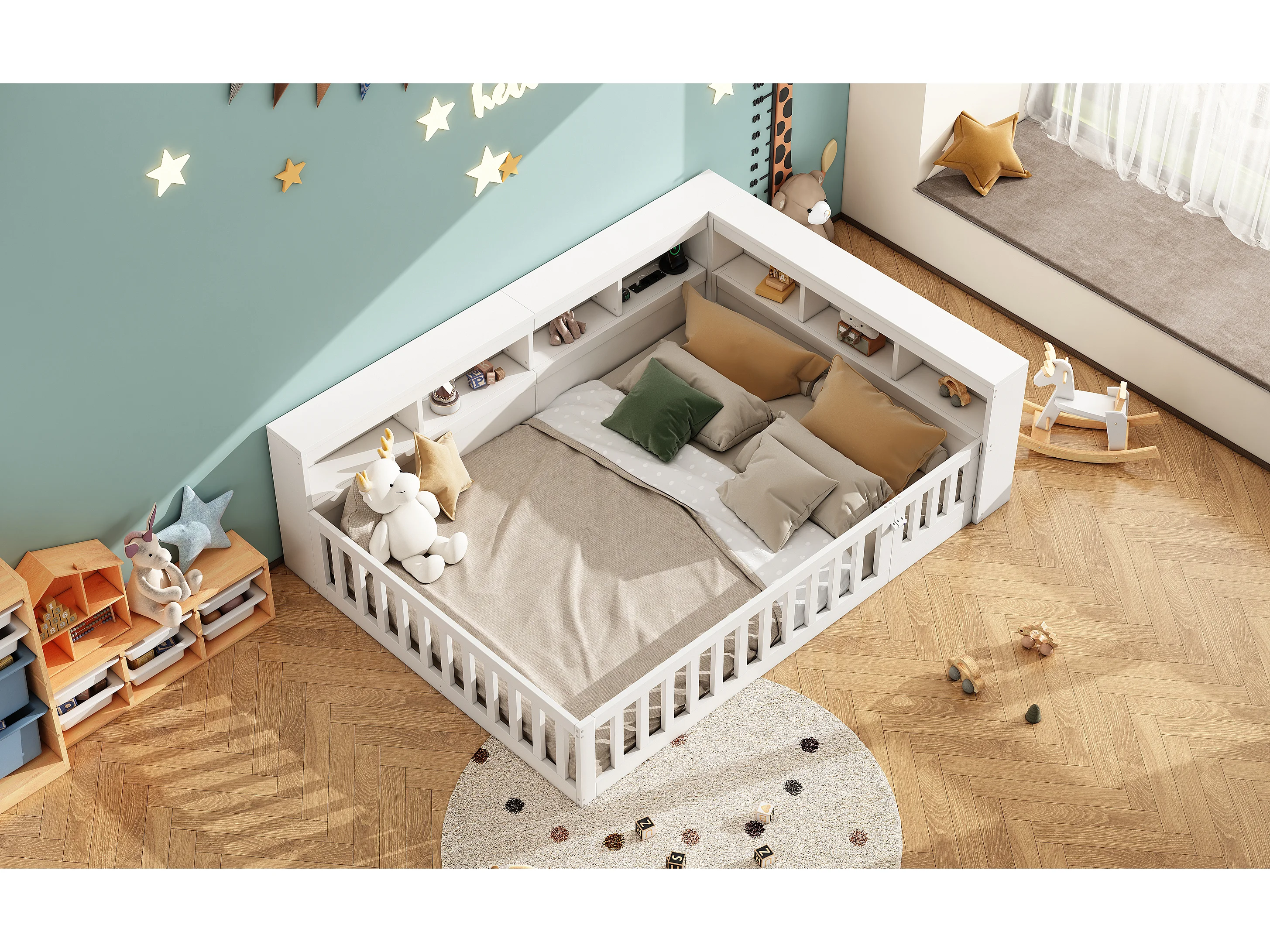 Daybed 140x200 cm, canapé-lit avec rangement latéral, sommier (sans matelas), rambarde, panneau de particules, prise + USB, Blanc