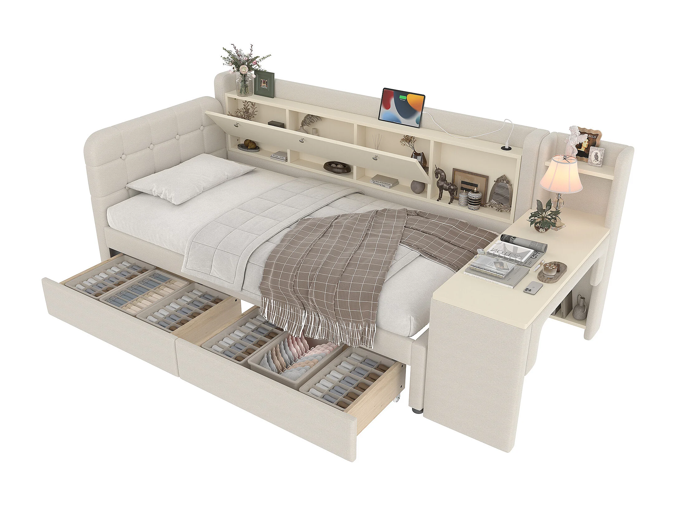Daybed 90x200 cm, canapé-lit avec 2 tiroirs, bureau, USB + Type C, compartiment de rangement Flip Top, sommier (sans matelas), lin, Beige