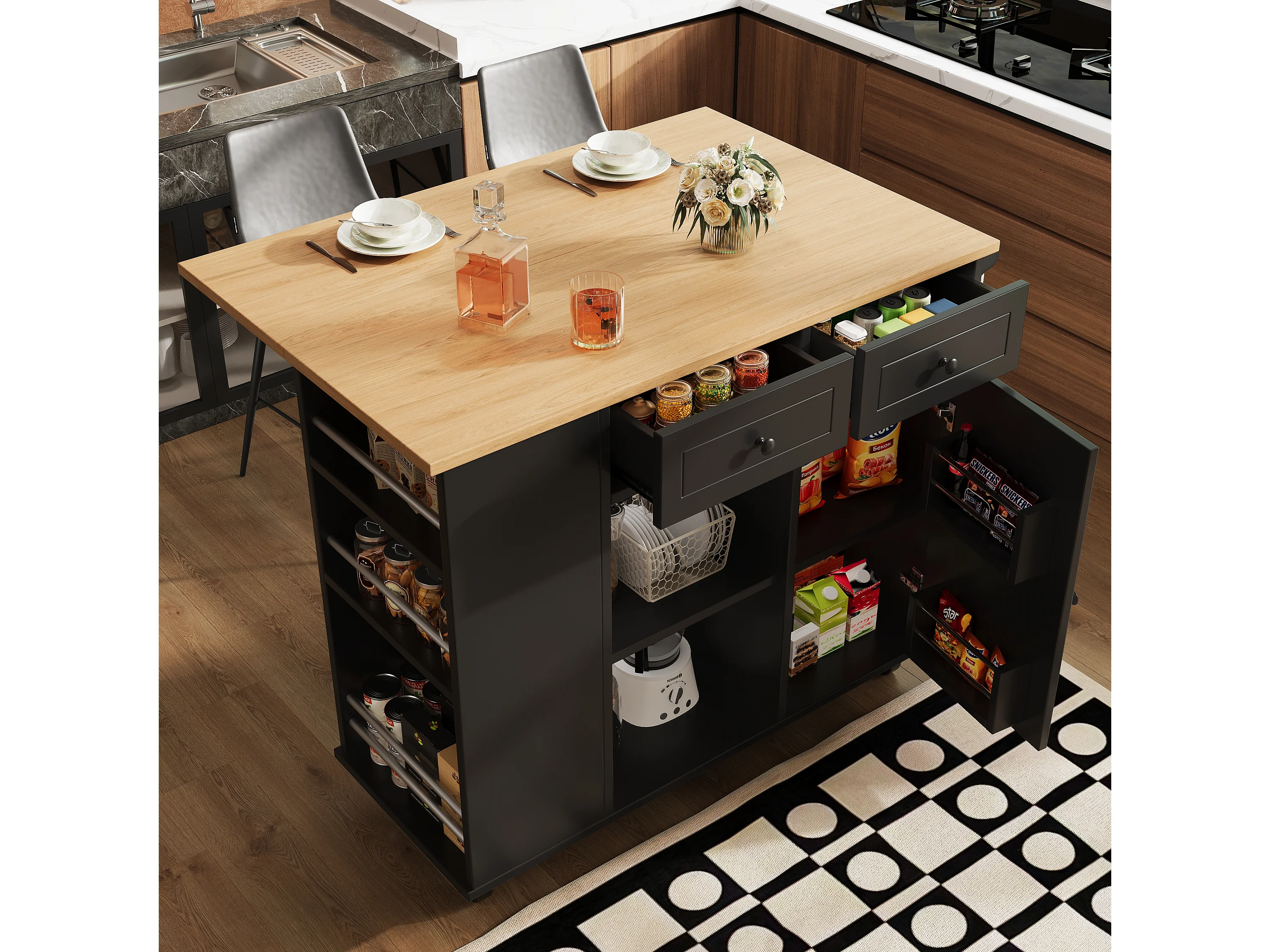 Desserte de cuisine 120x(42-76)x91.5 cm 1 porte et 2 tiroirs Îlot de cuisine avec plateau extensible - noir