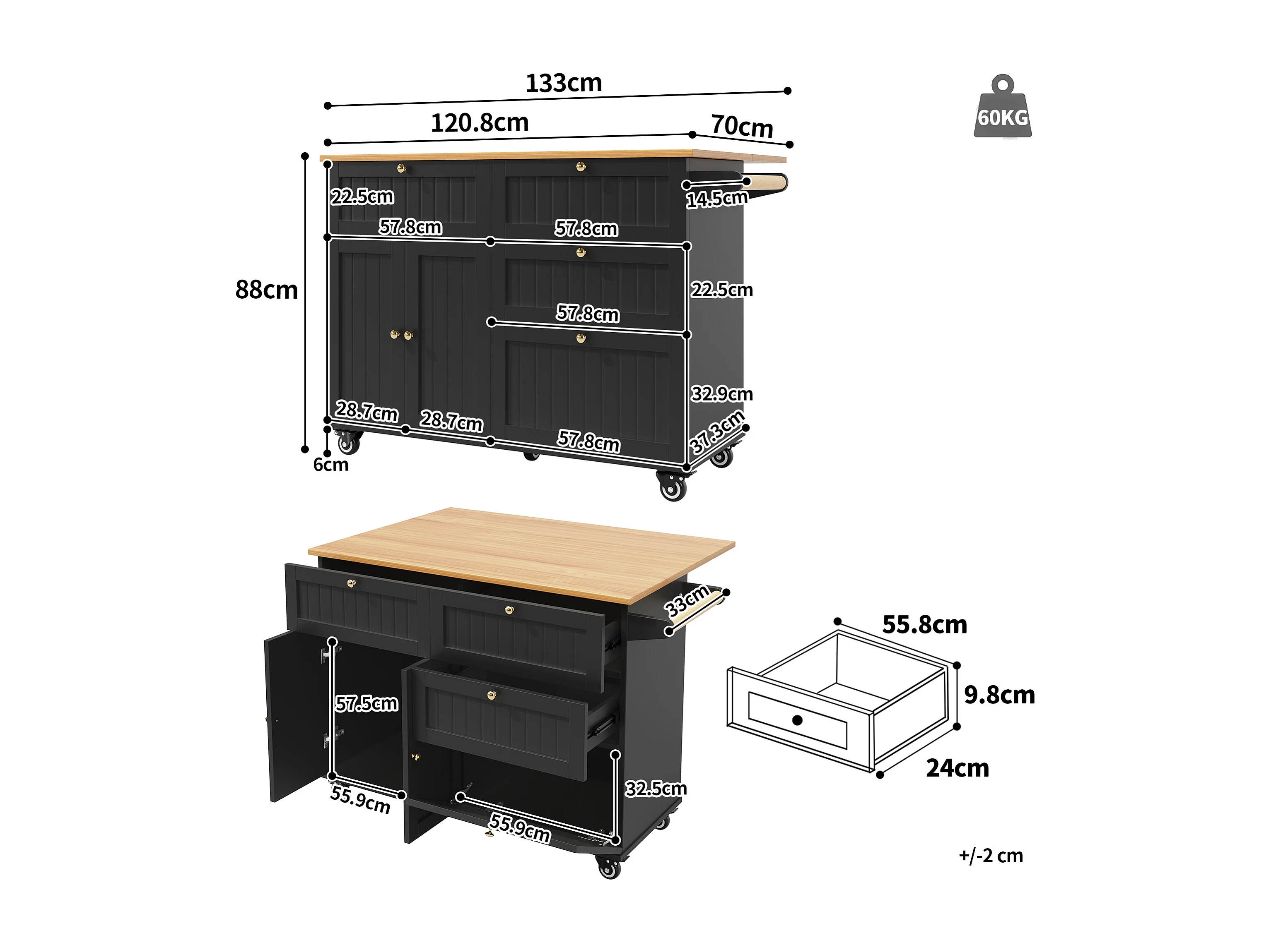 Desserte de cuisine 133x(37.3-70)x88 cm 3 portes et 3 tiroirs Îlot de cuisine avec plateau extensible - noir