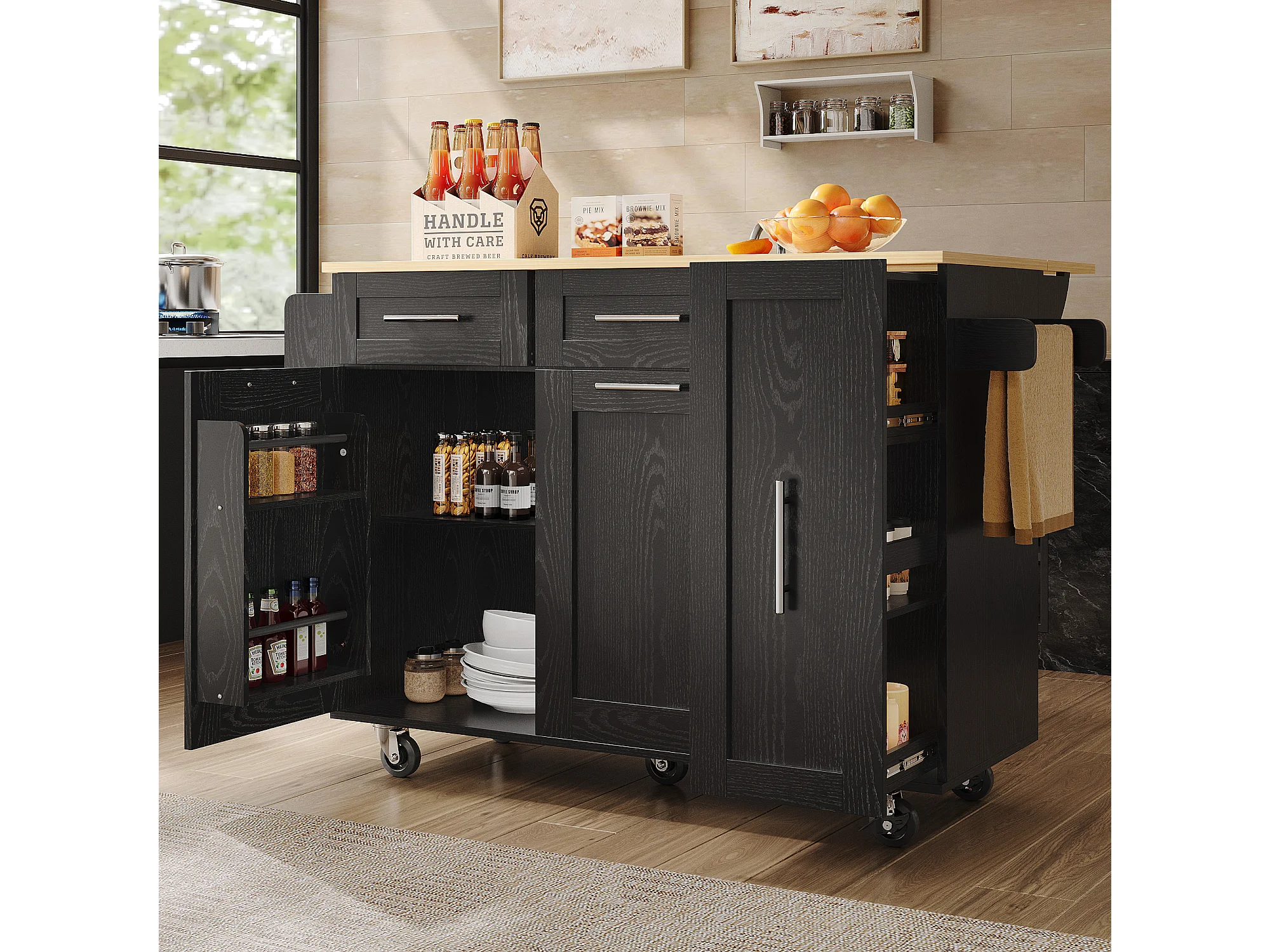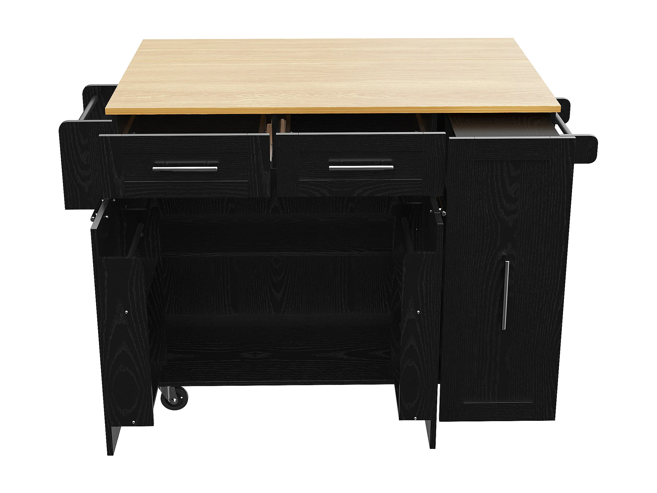 Desserte de cuisine 134.5x(46-74)x90.5 cm 2 portes et 2 tiroirs Îlot de cuisine avec plateau extensible - noir