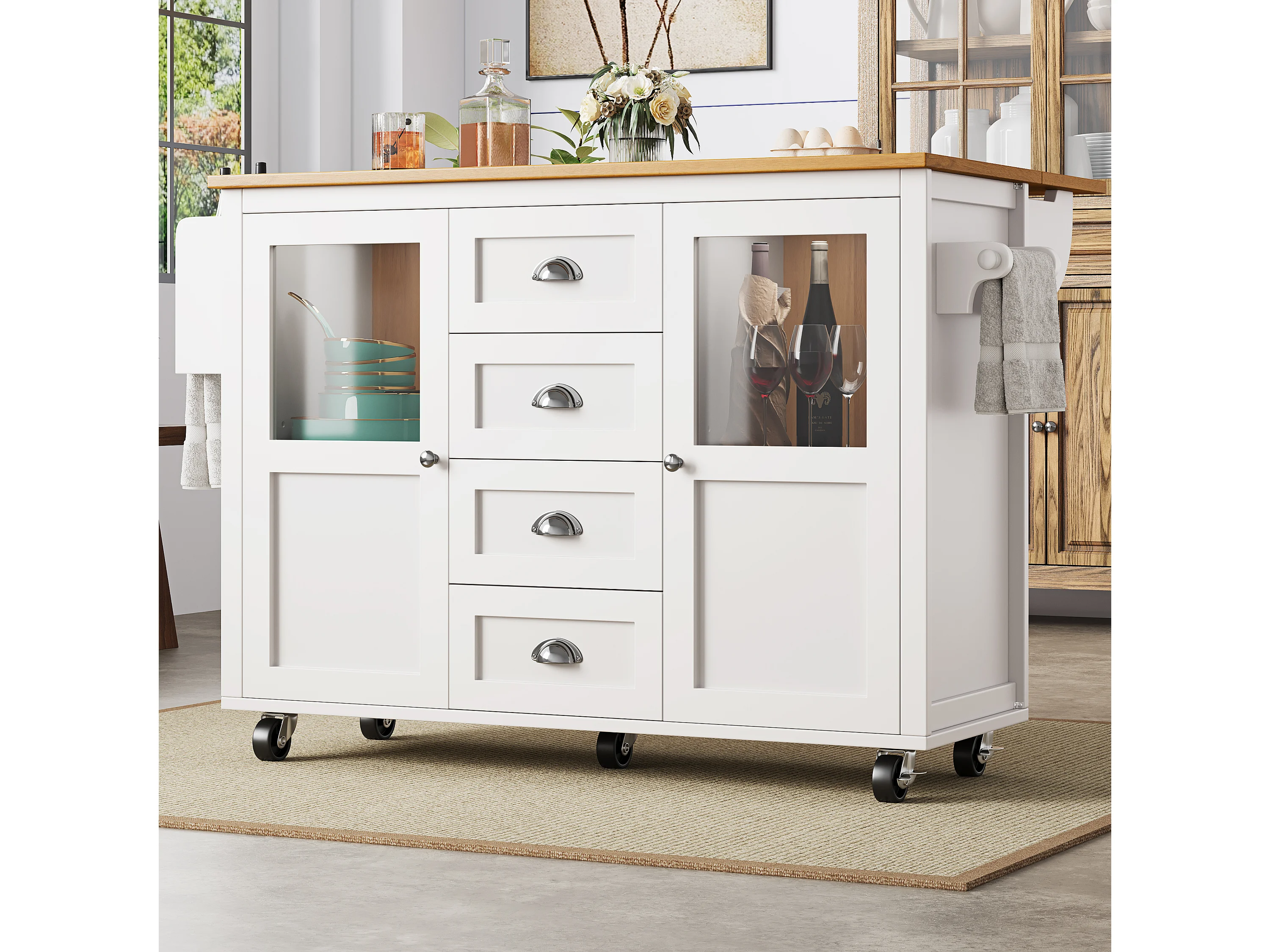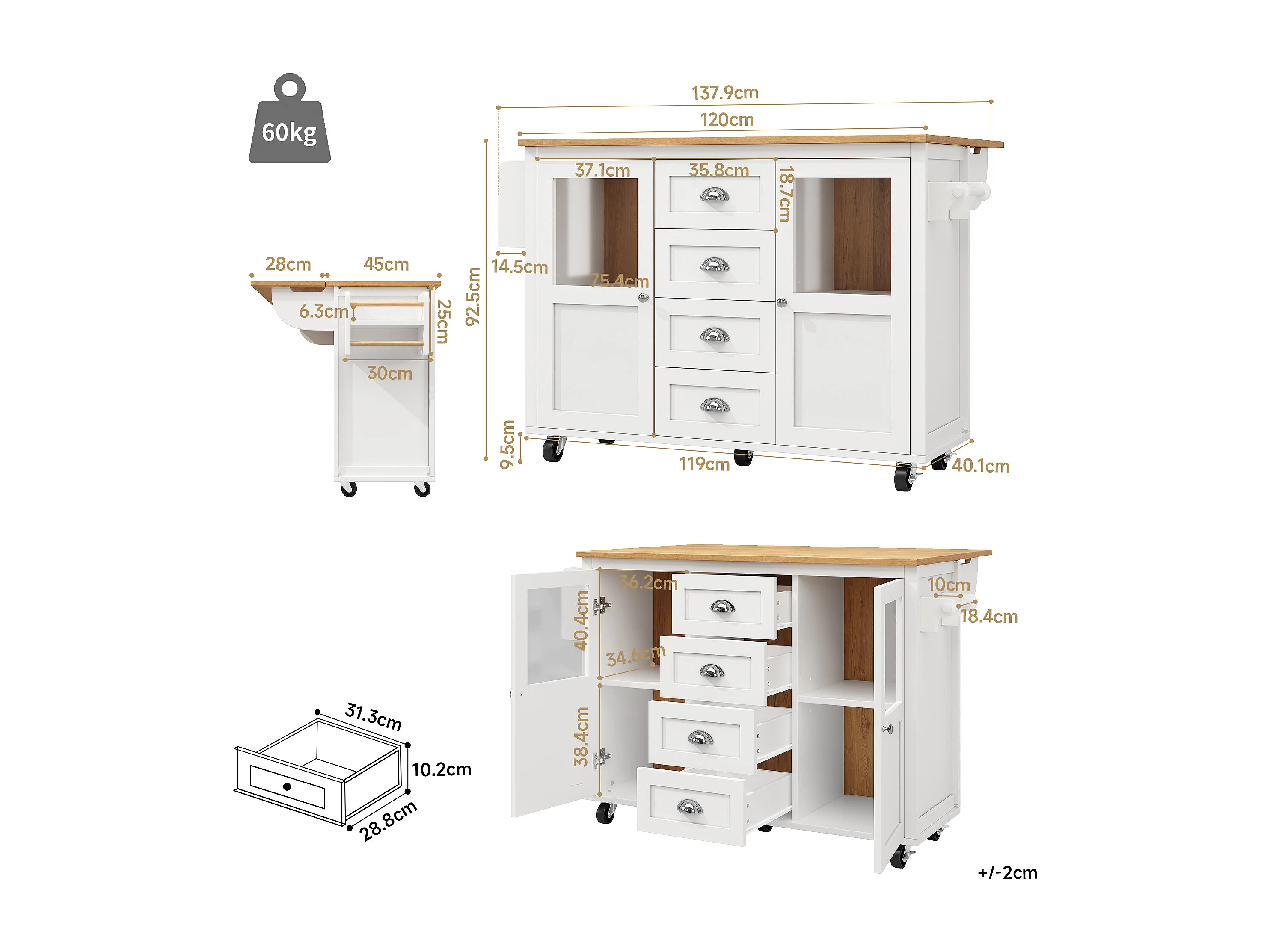 Desserte de cuisine 137.9x(40-73)x92.5 cm 2 portes et 4 tiroirs Îlot de cuisine avec plateau extensible - blanc