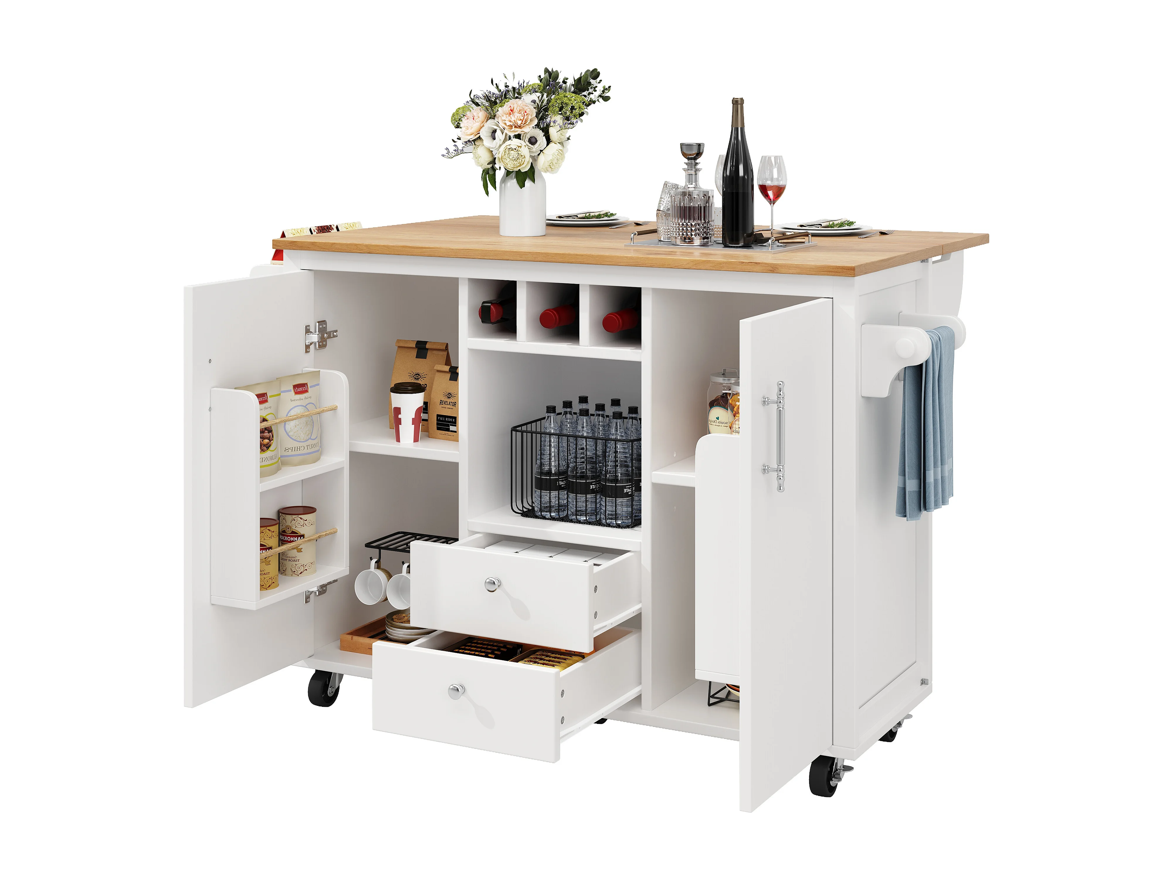 Desserte de cuisine 137.9x(45-73)x92.2 cm 2 portes et 2 tiroirs Îlot de cuisine avec plateau extensible - blanc