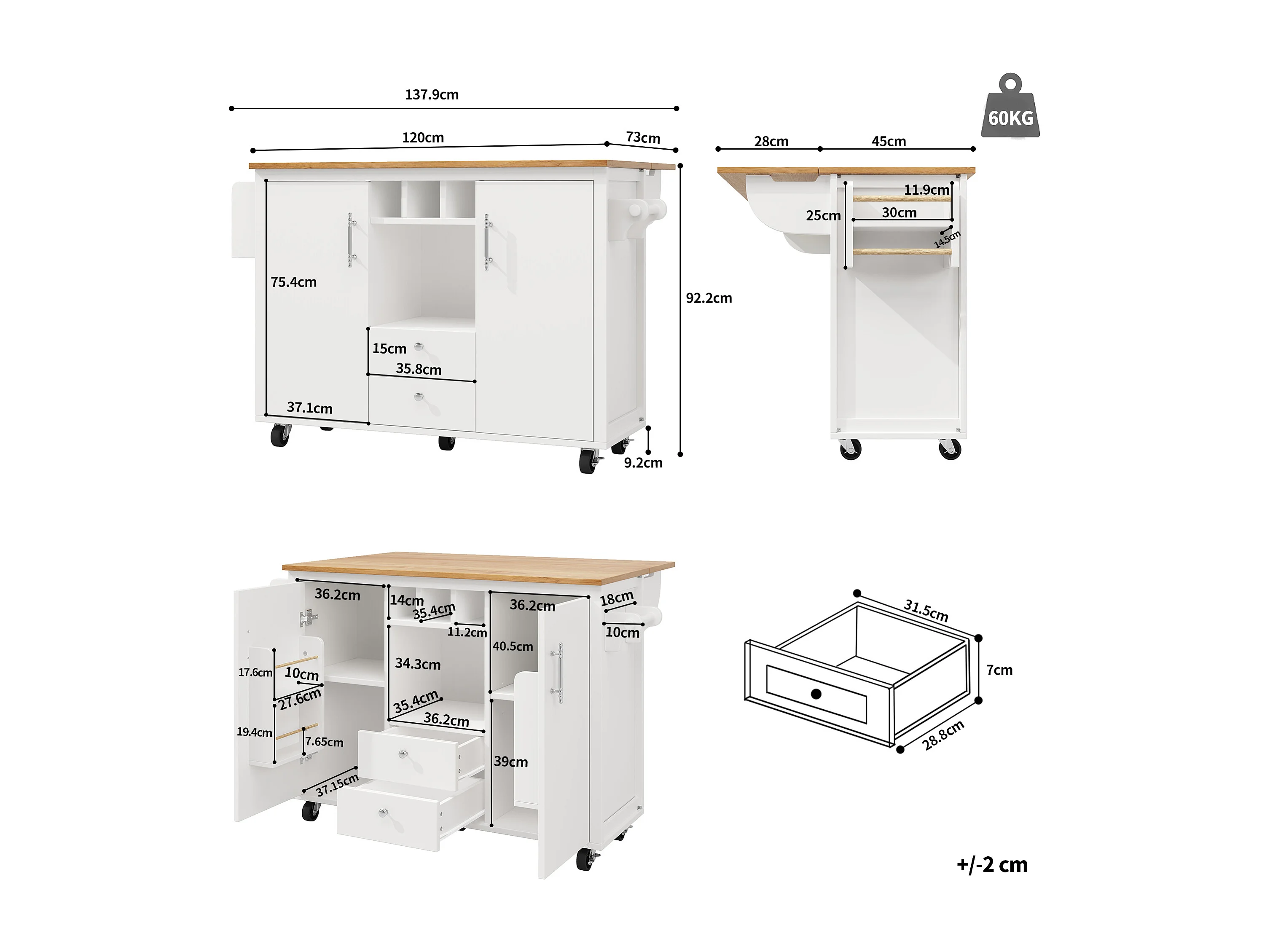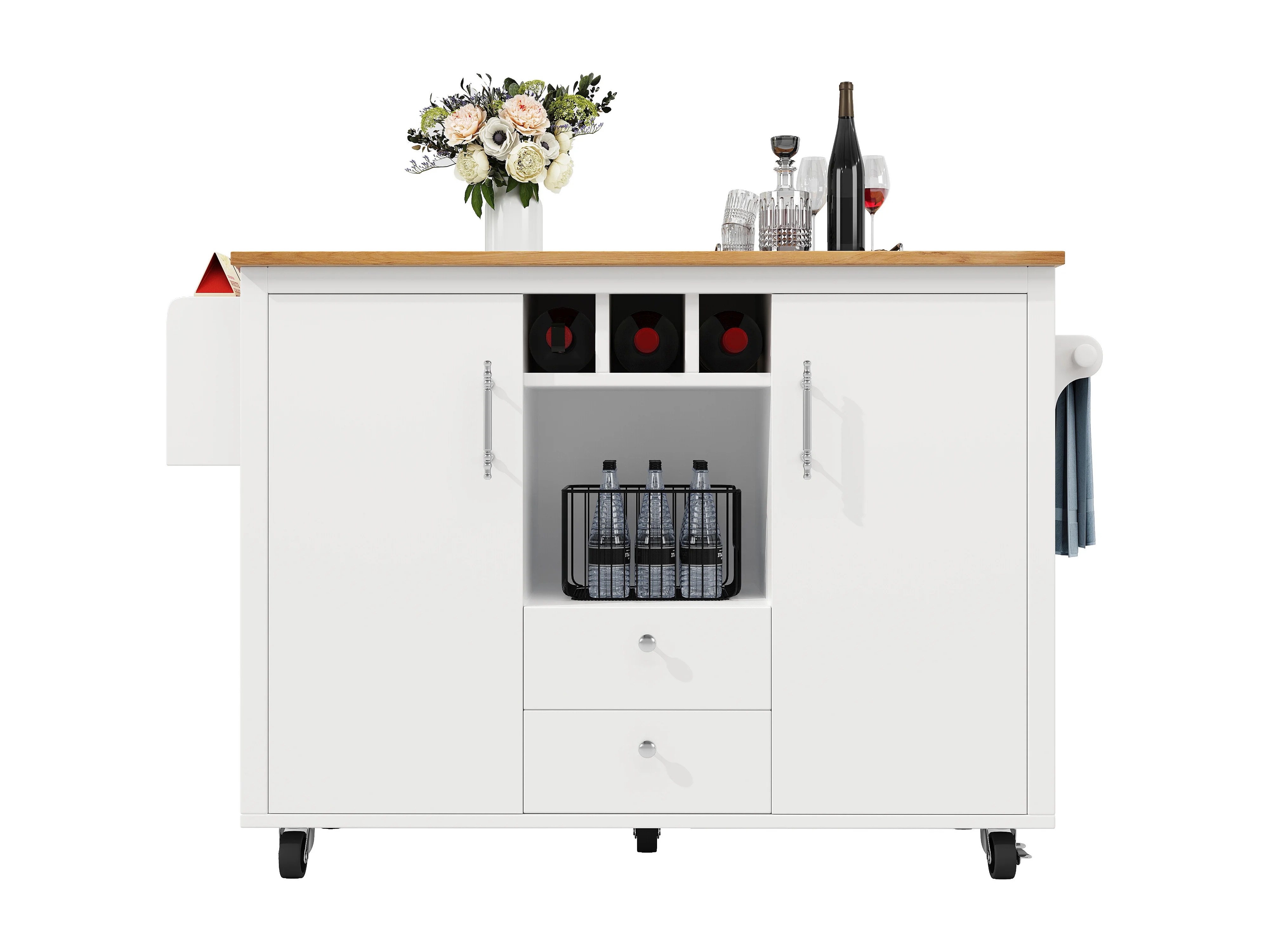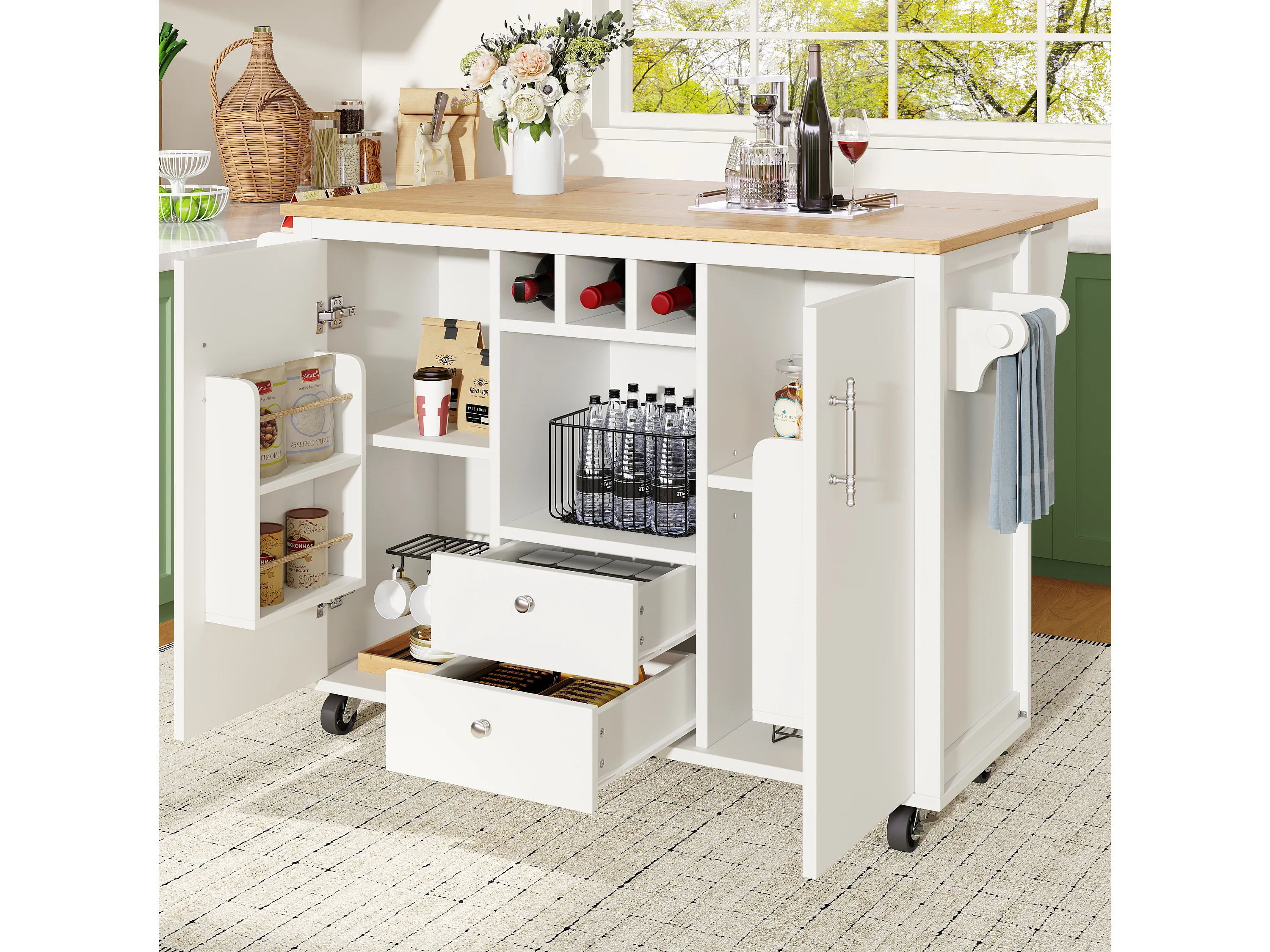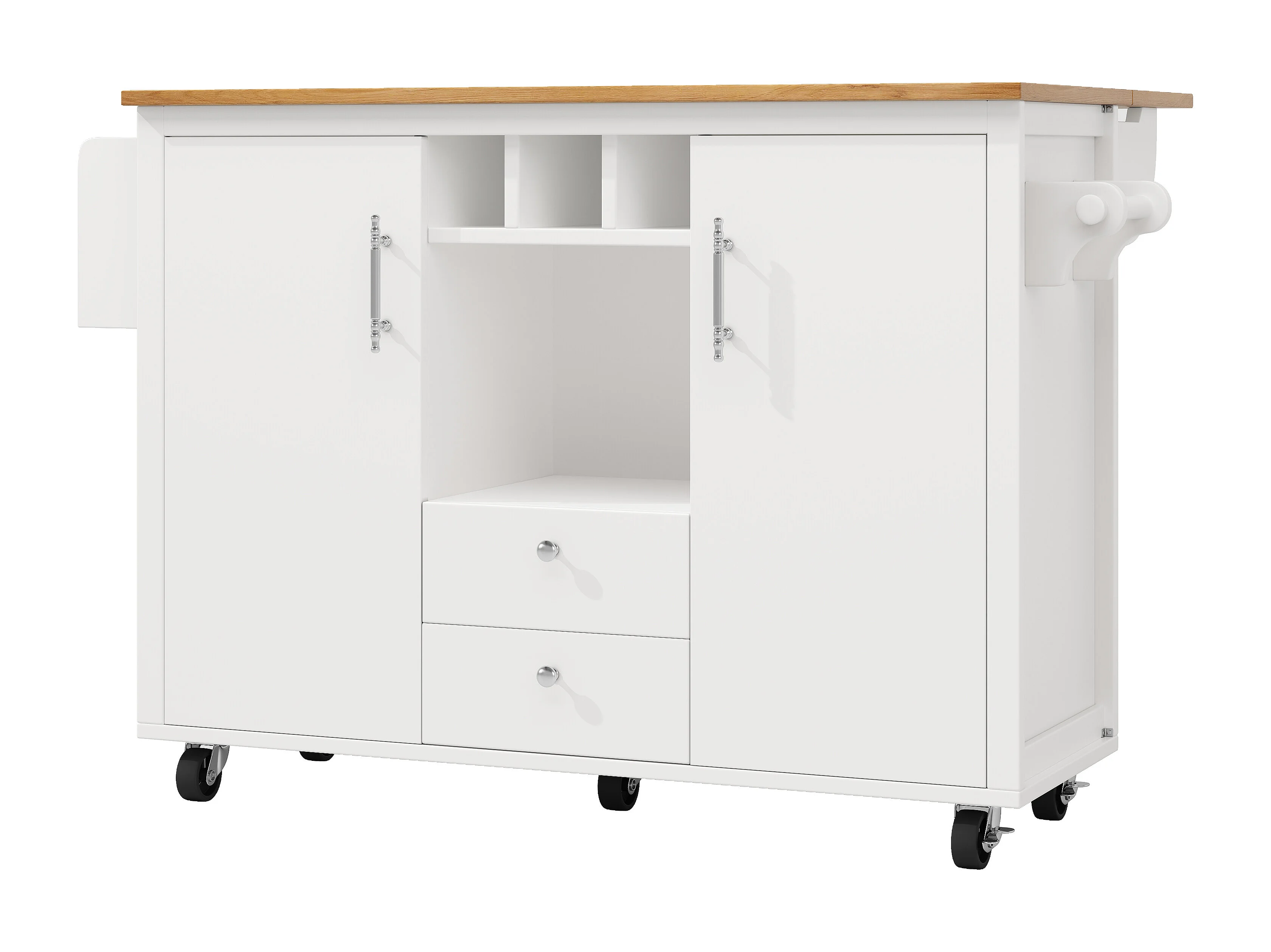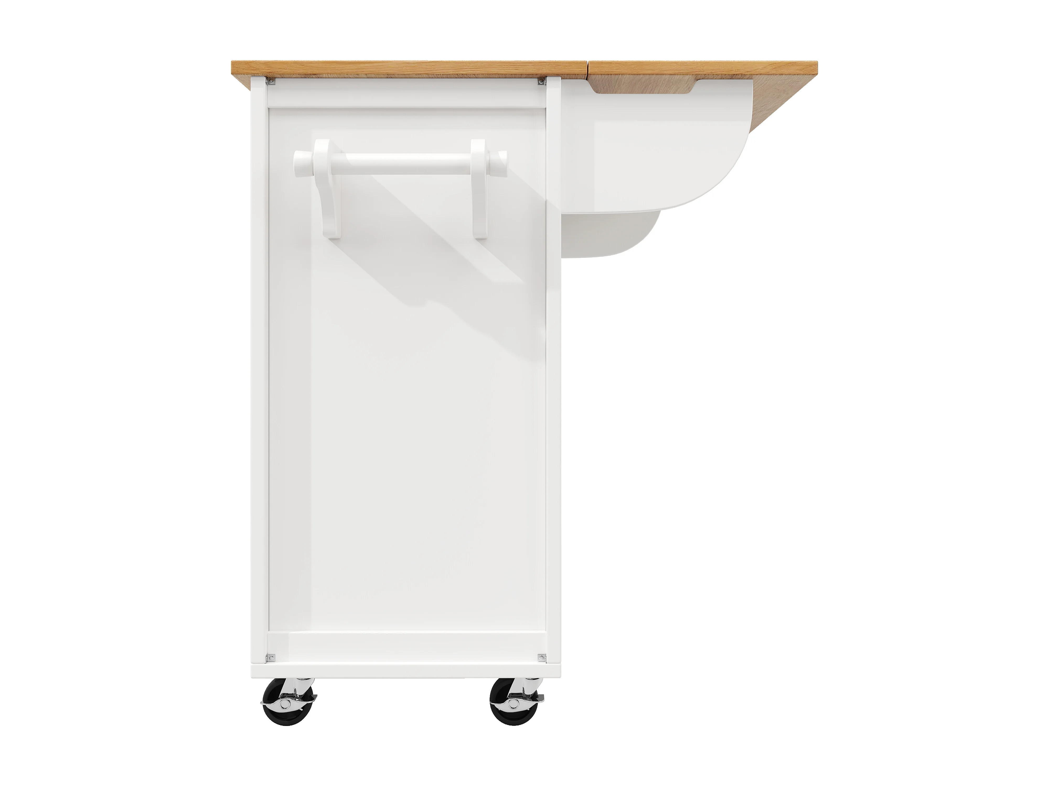 Îlot de cuisine 137.9x73x92 cm, plateau rabattable, grand rangement, roulettes, MDF et métal blanc