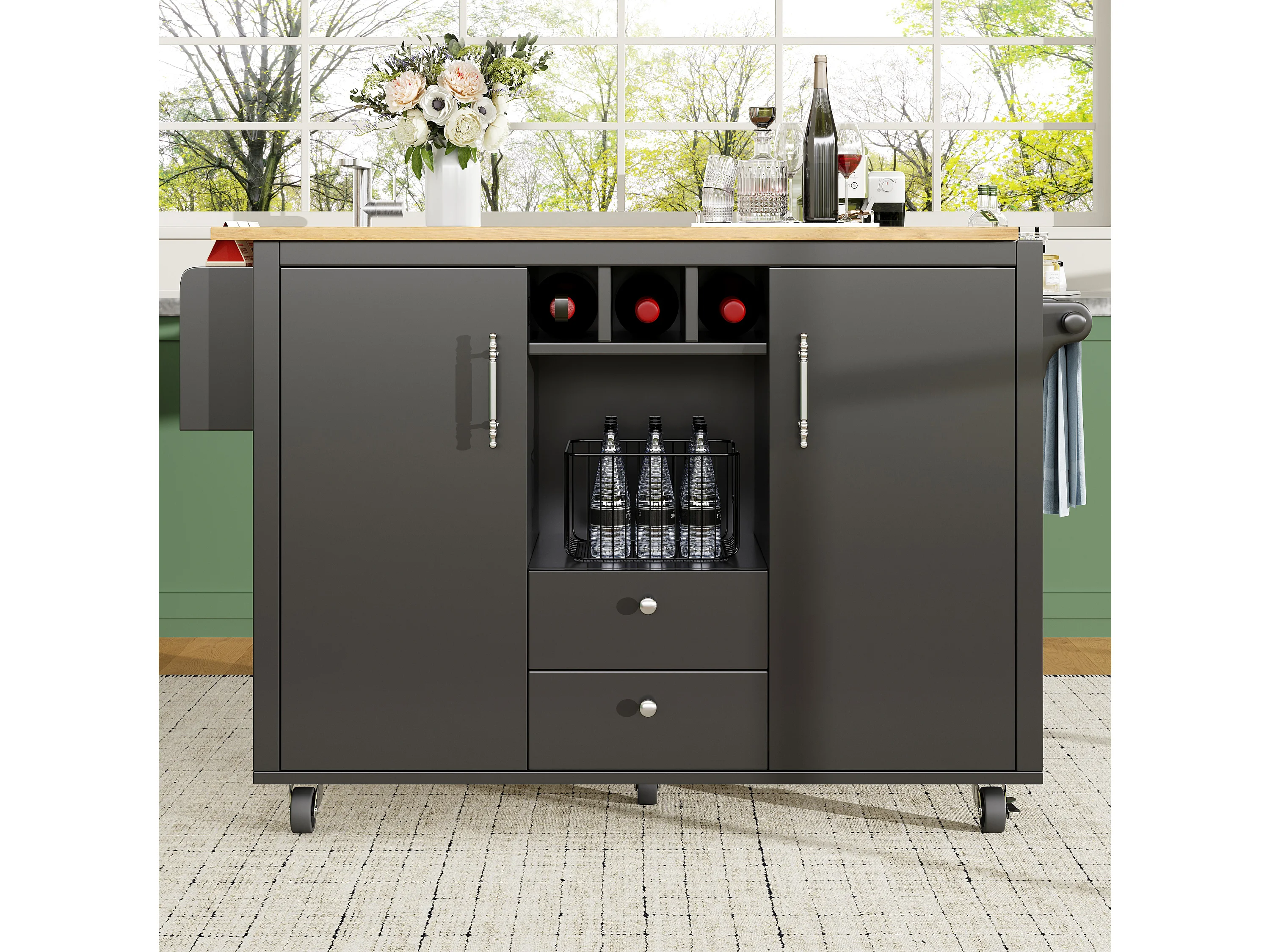 Îlot de cuisine 137.9x73x92.2 cm, table rabattable, grand rangement avec roulettes, MDF et métal noir