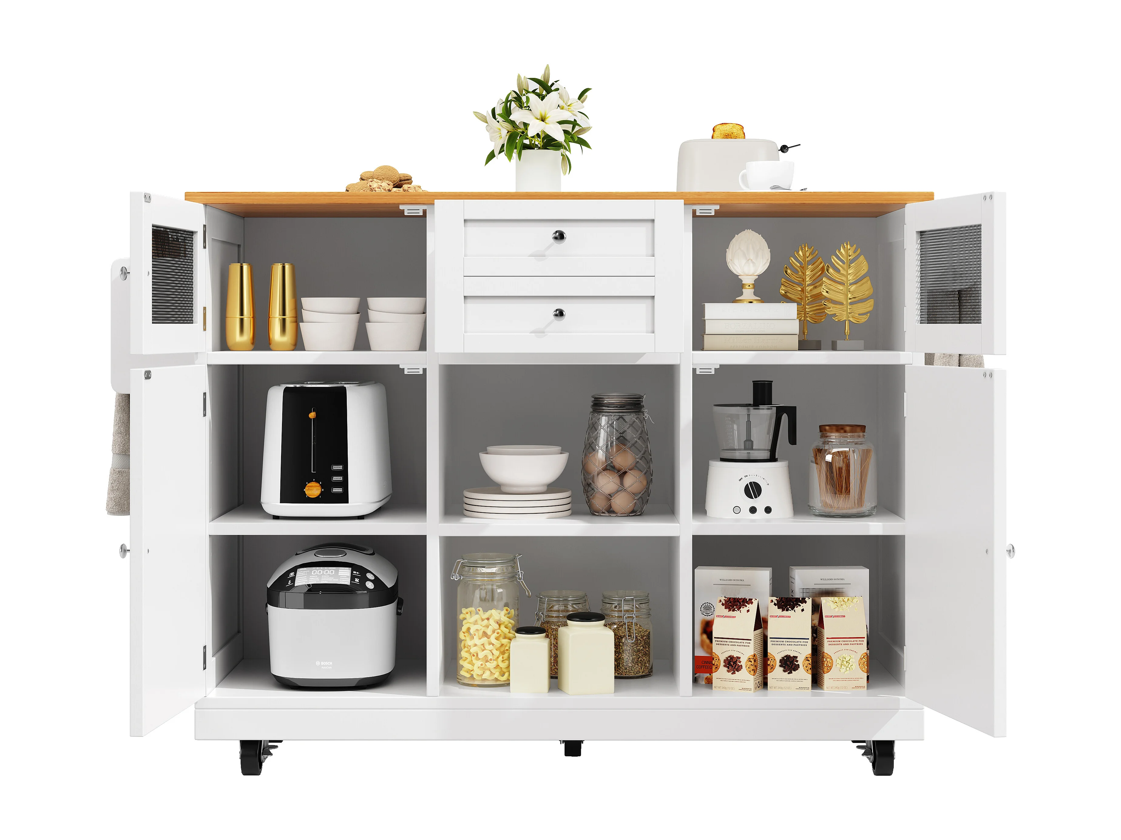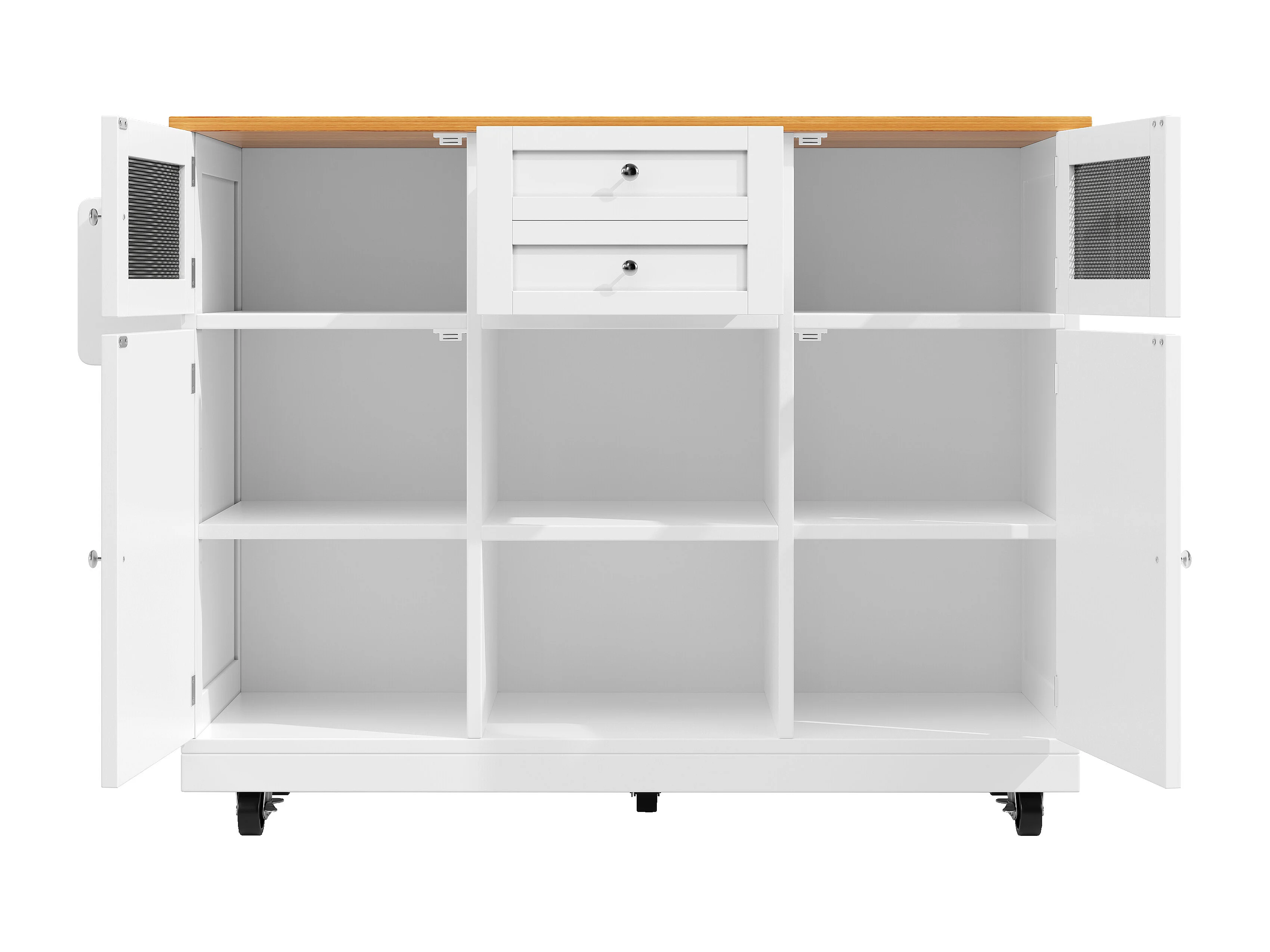 Îlot de cuisine 140x40x93.5 cm, plateau rabattable, roulettes, rangement et porte serviettes, MDF blanc