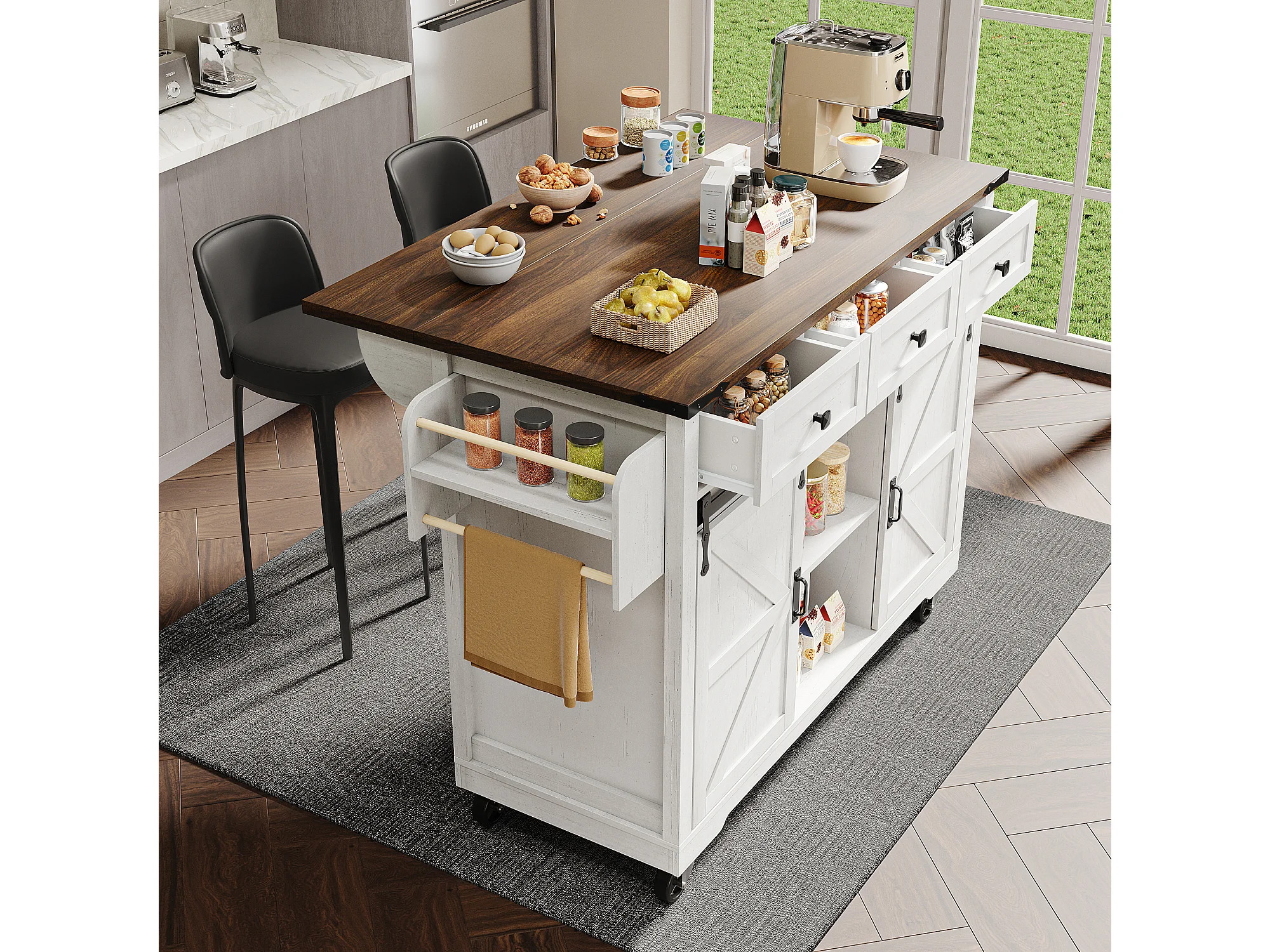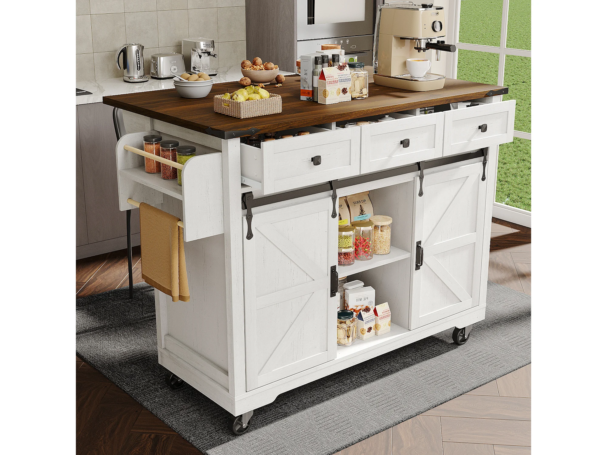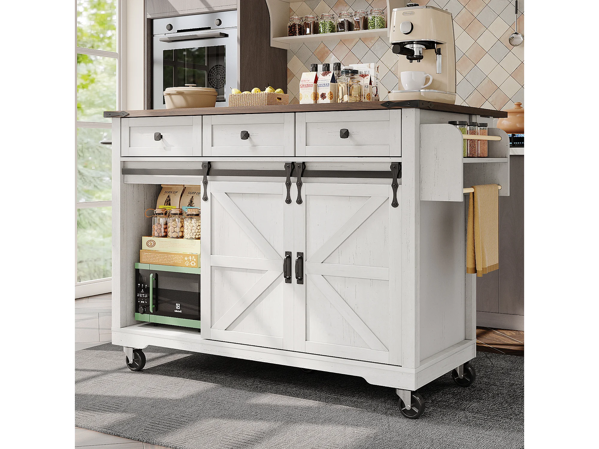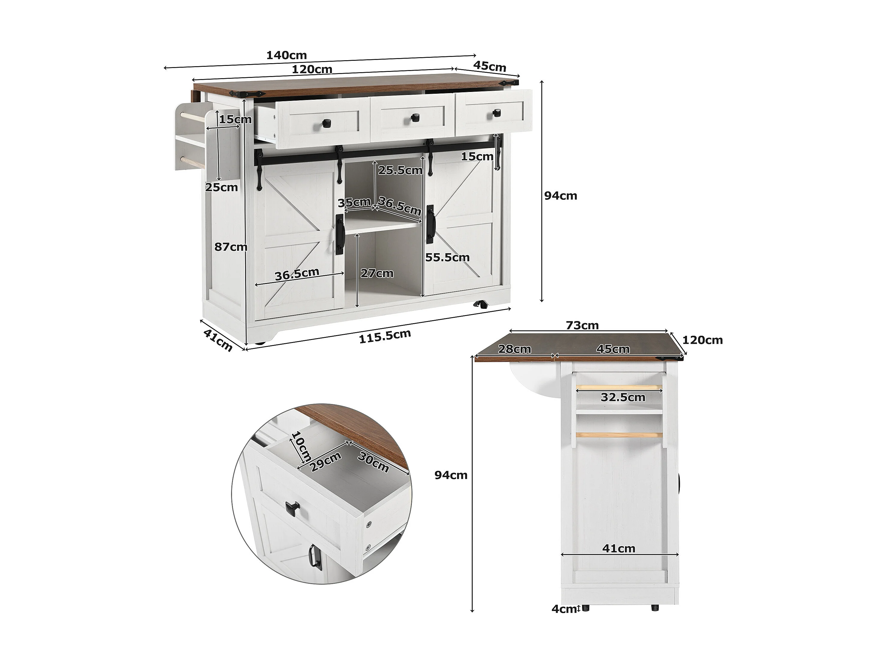 Desserte de cuisine (140x73x94cm)mobile avec tiroirs, armoires coulissantes et roulettes - beige blanc