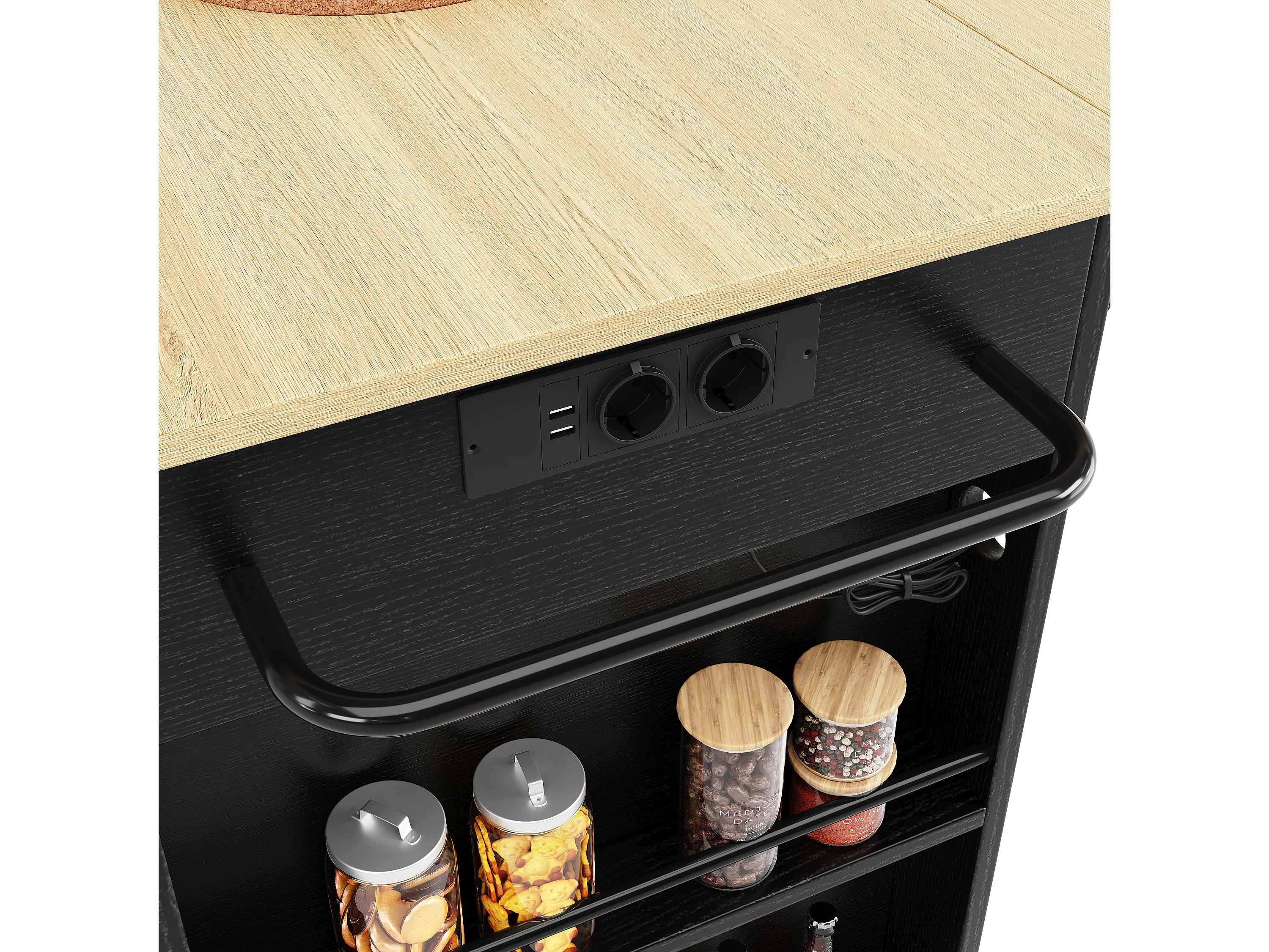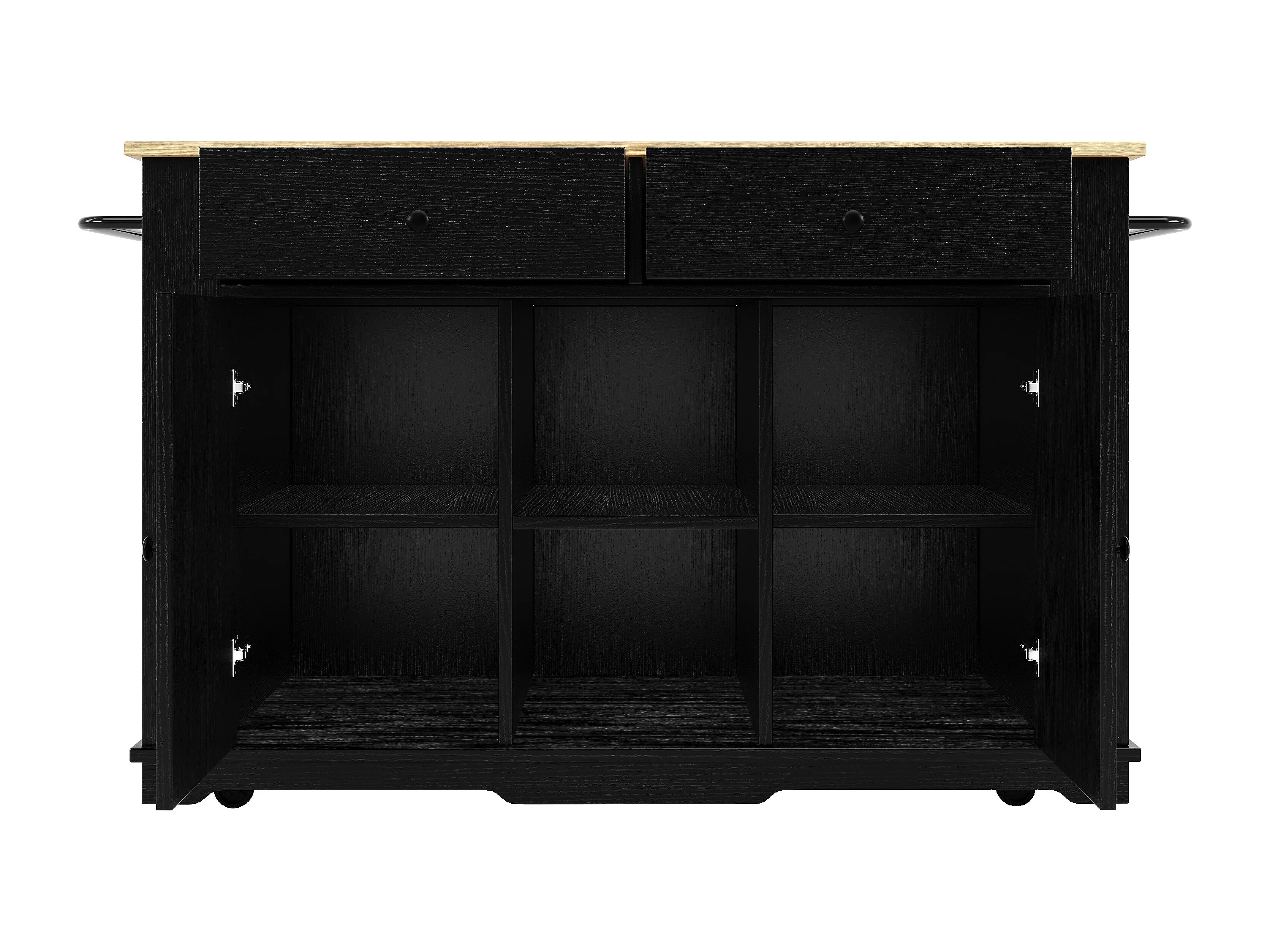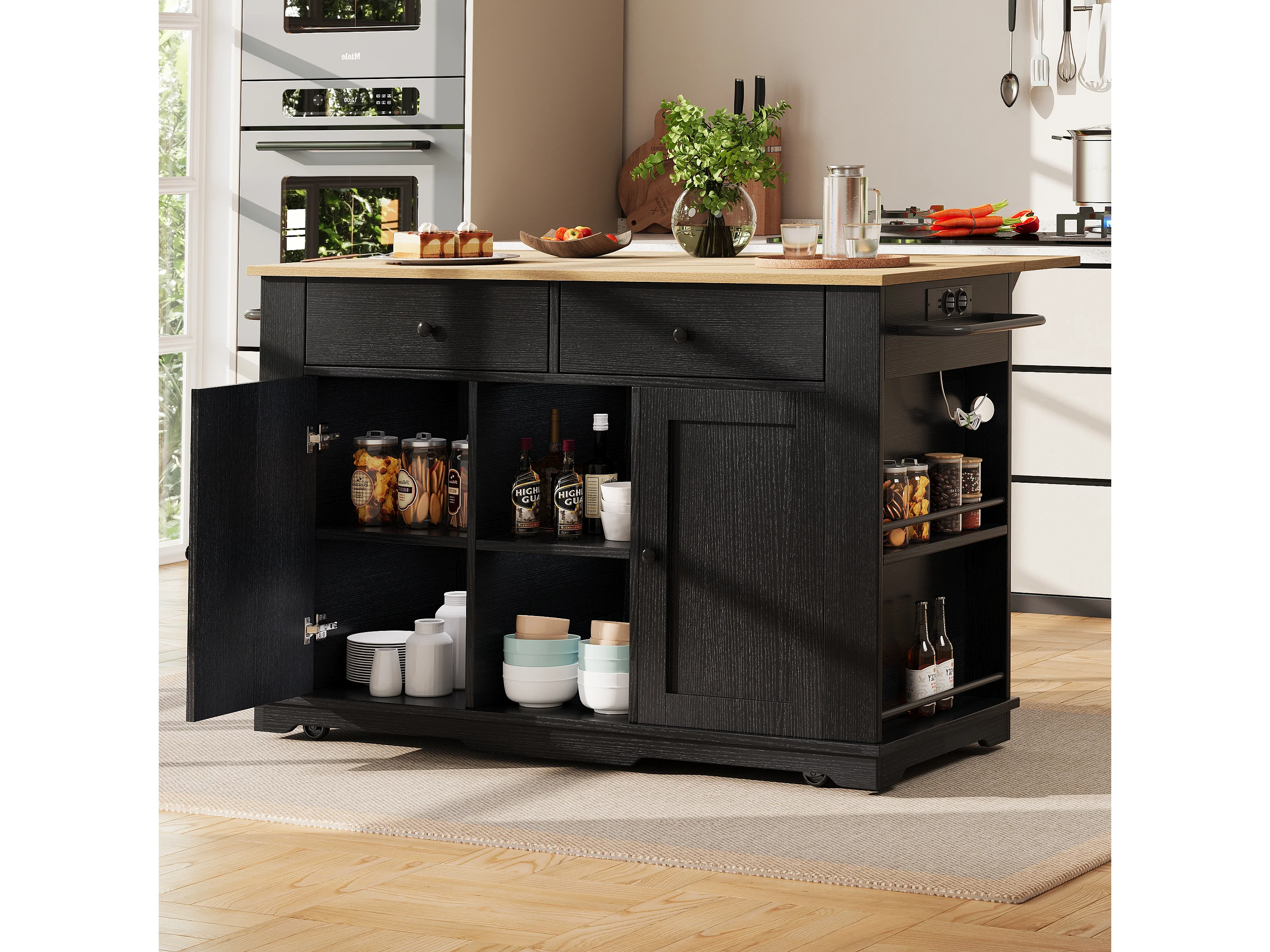 Desserte de cuisine 151.5x(59.7-84.7)x91.7 cm 2 portes et 3 tiroirs prise électrique Îlot de cuisine avec plateau extensible - noir
