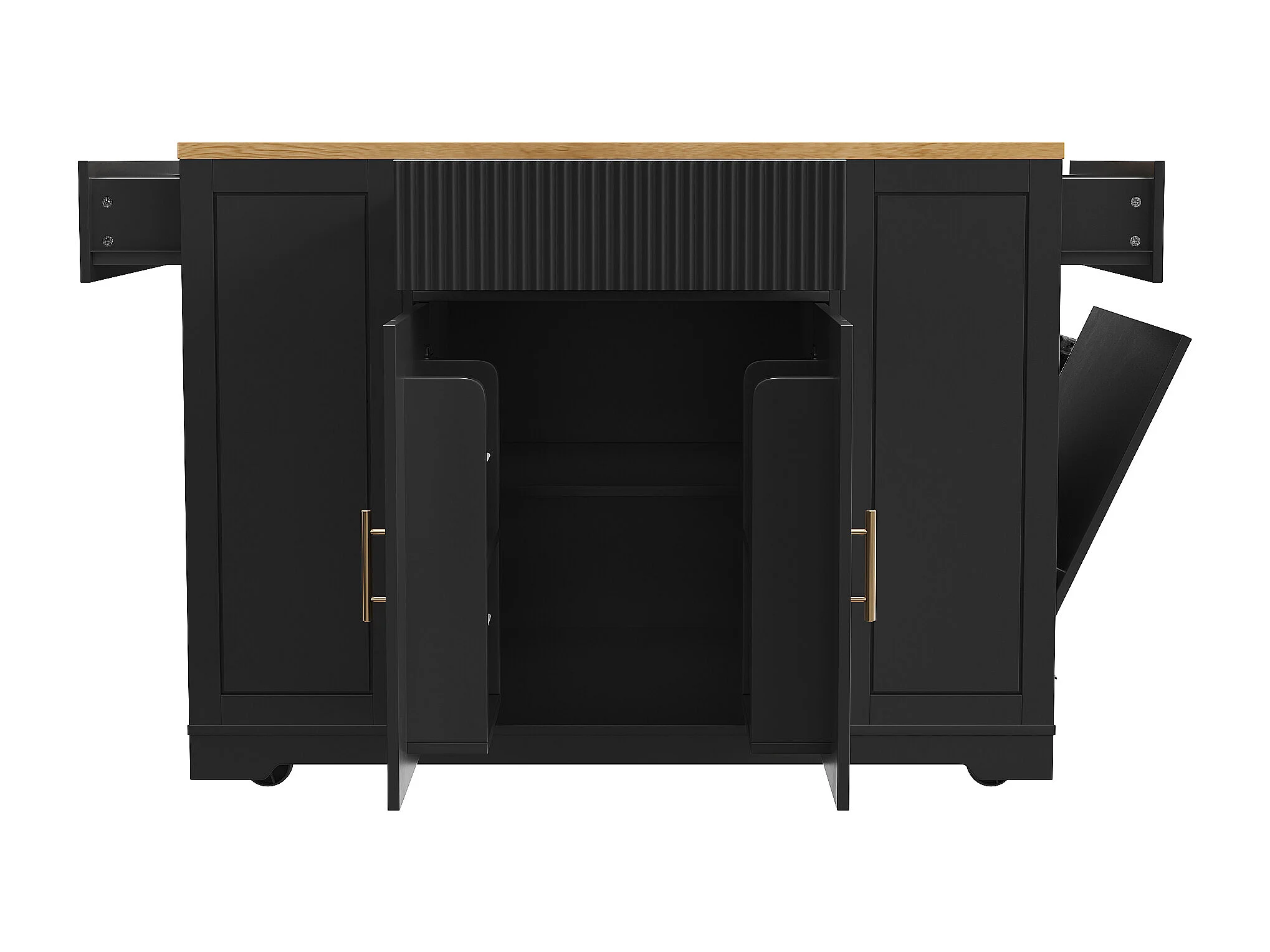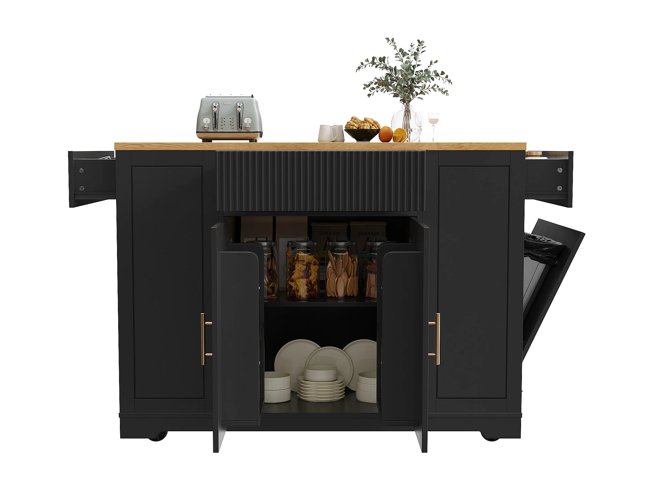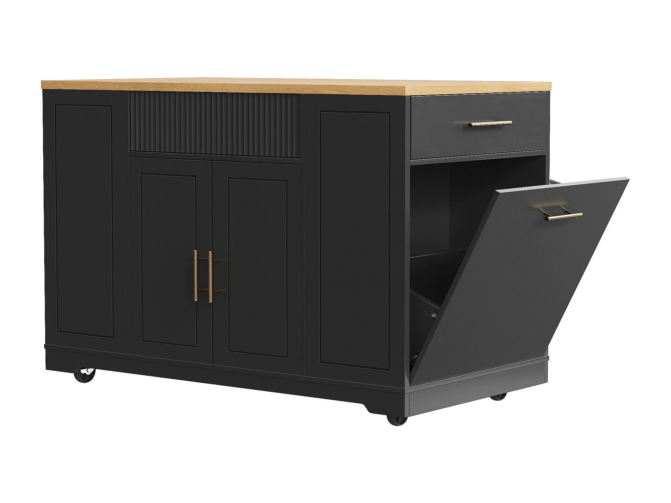 Desserte de cuisine noire avec 2 portes, 3 tiroirs et compartiment poubelle, poignées en métal, plateau en grain de bois