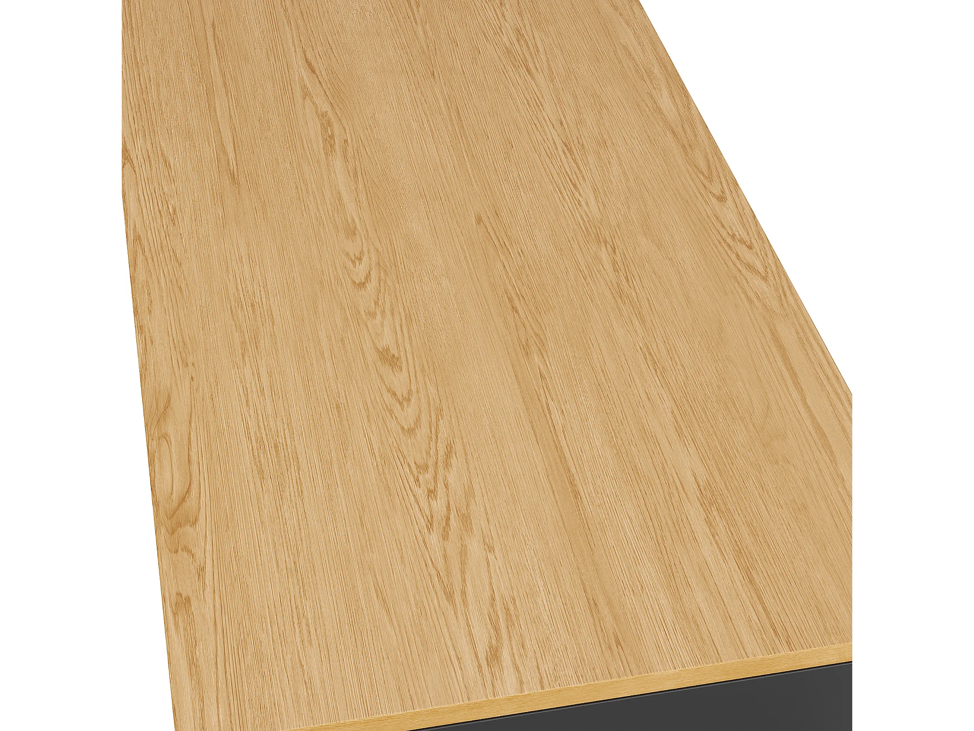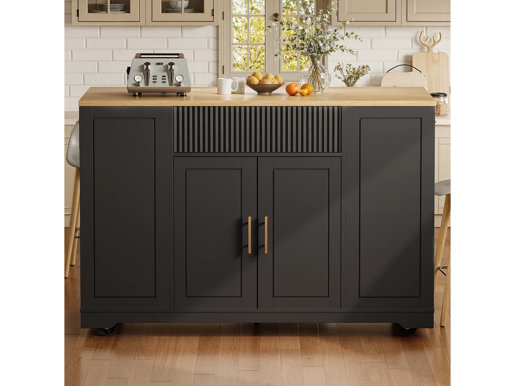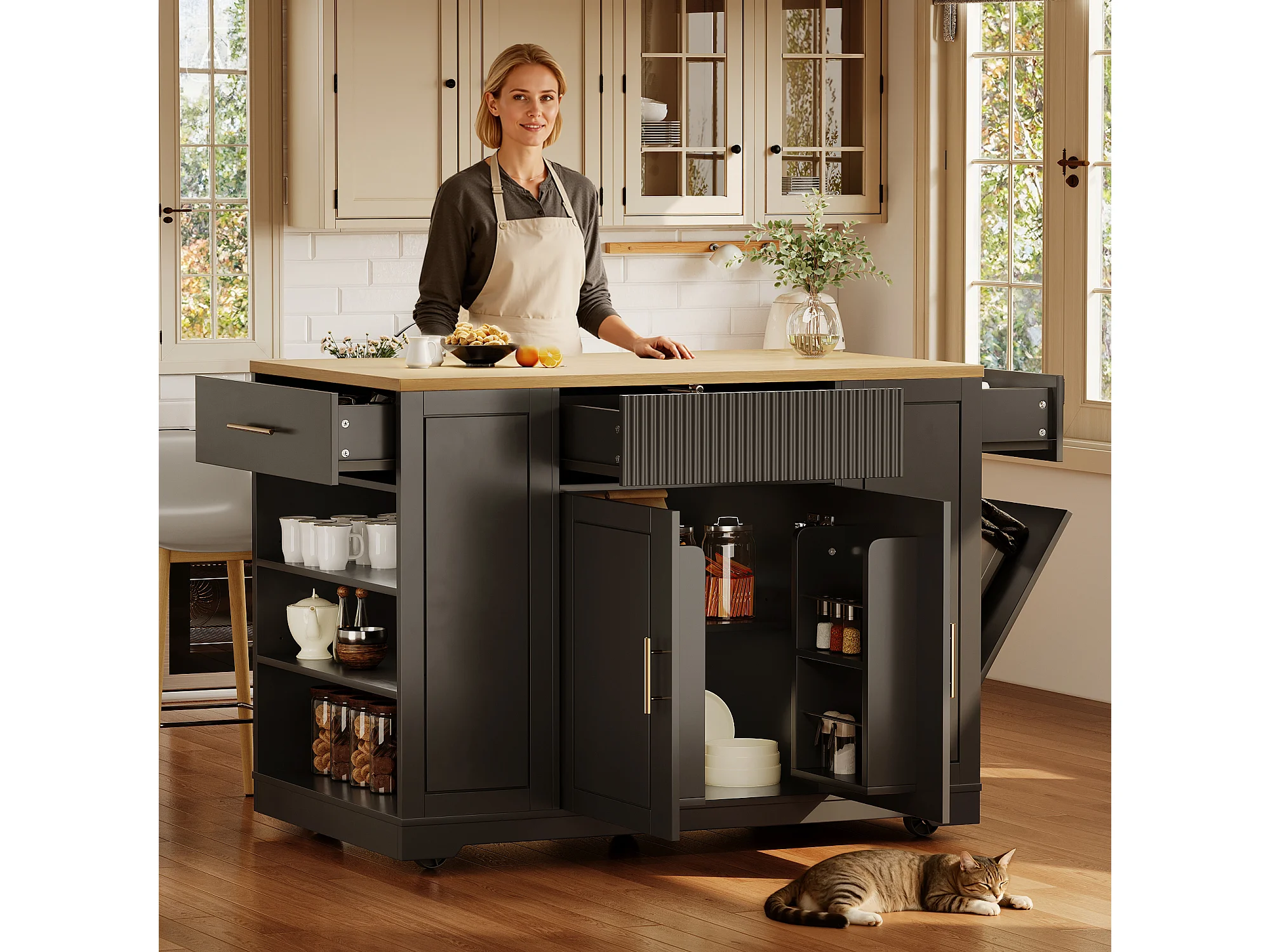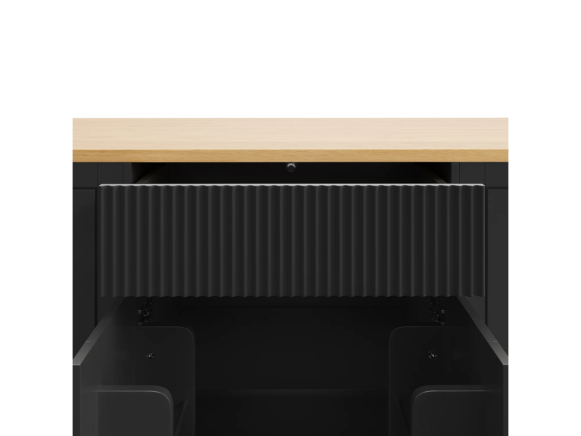 Desserte de cuisine noire avec 2 portes, 3 tiroirs et compartiment poubelle, poignées en métal, plateau en grain de bois