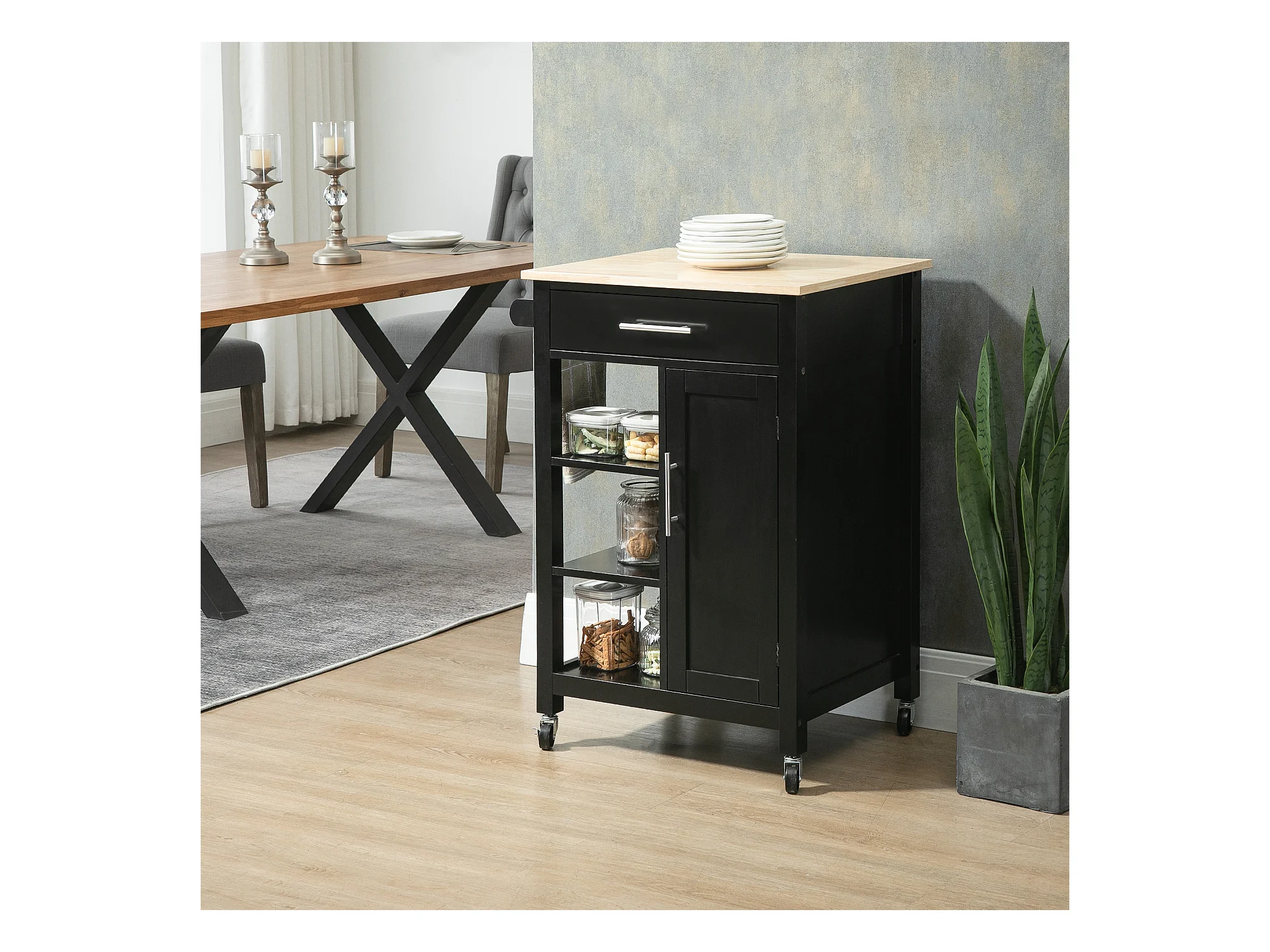 Desserte de cuisine style contemporain - porte, tiroir, 3 étagères - poignées métal MDF noir plateau bois hévéa