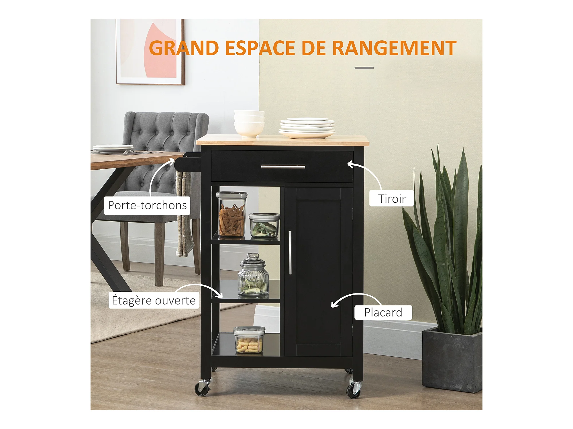 Chariot de service desserte de cuisine à roulettes multi-rangements 74L x 37l x 76H cm plateau bois massif pin châssis MDF noir