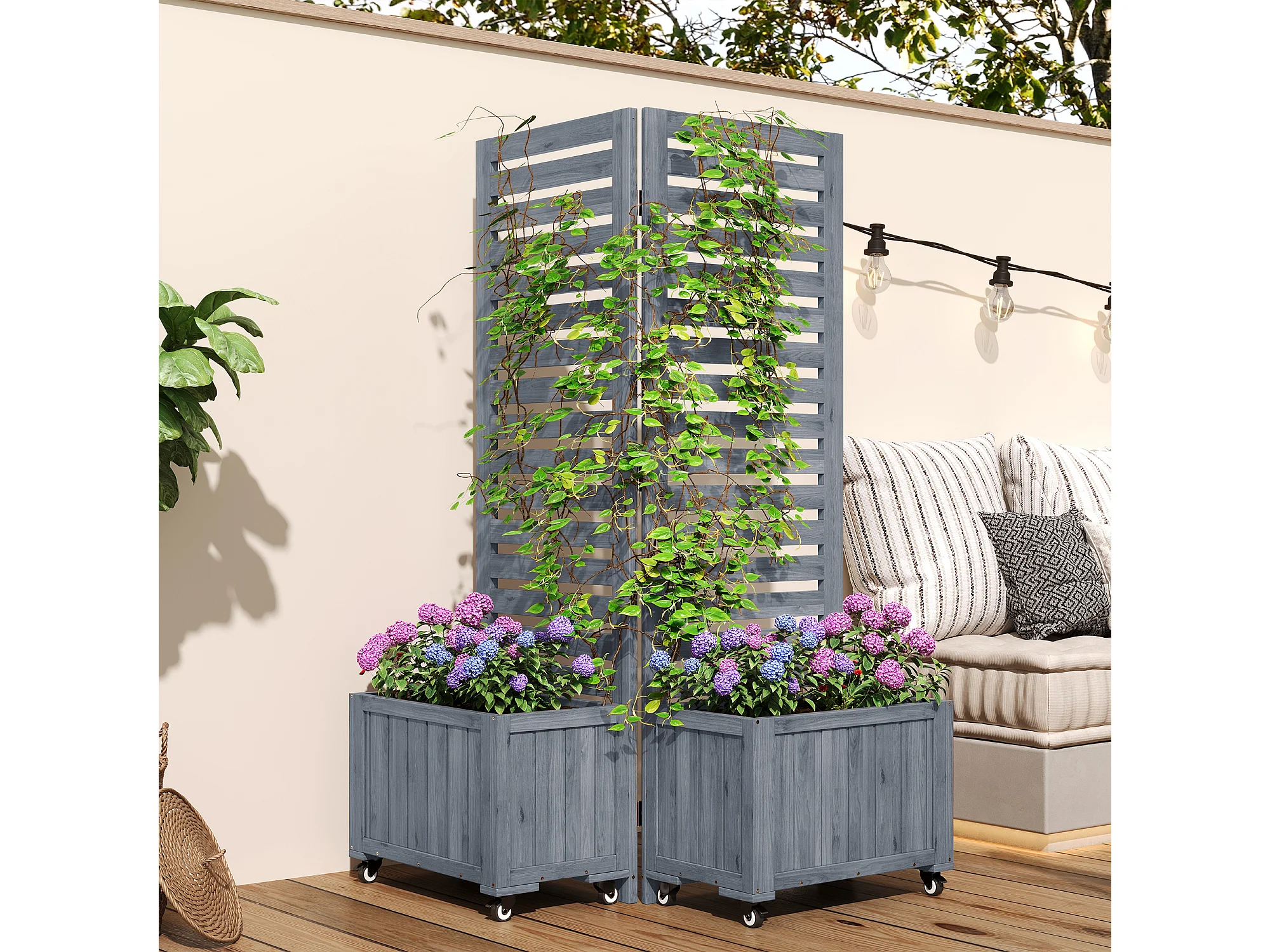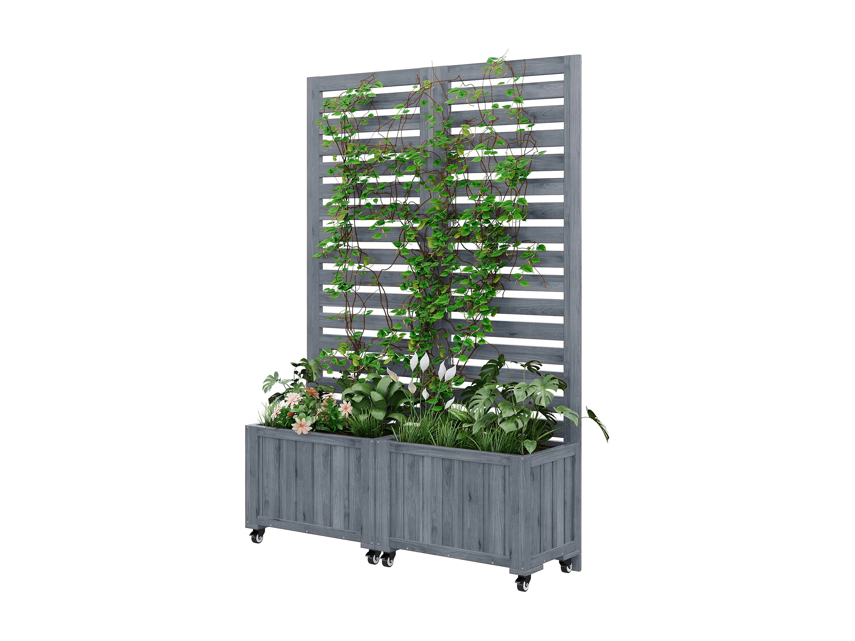 Double Jardinière avec Treillis en Bois de Sapin Massif - Brise-vue Mobile sur Roulettes - 102 x 32 x 152 cm - Gris