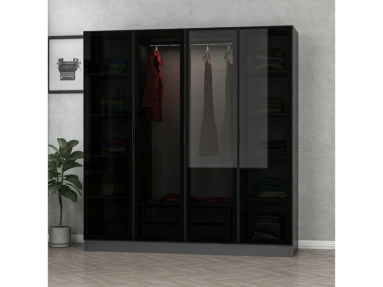 Dressing 4 portes Verre fumé Noir Antipaxos L180xH190cm 1 tringle et 2 tiroirs Anthracite
