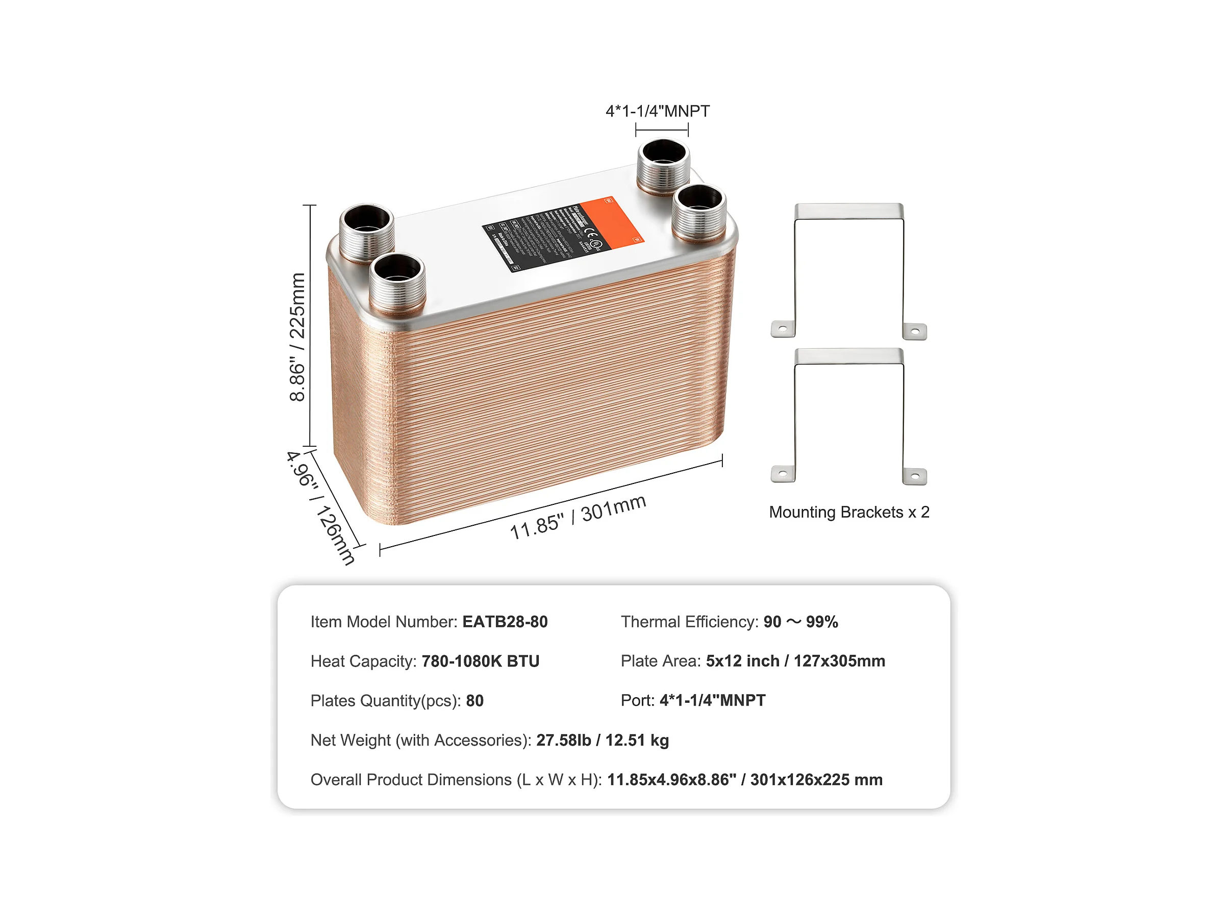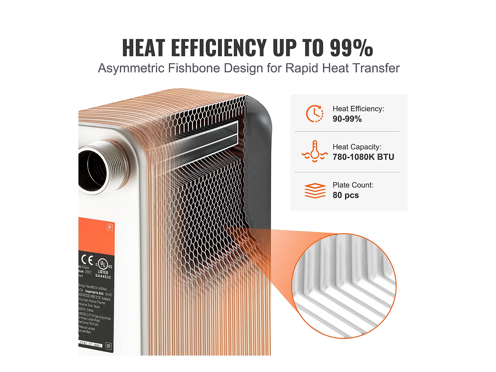 Échangeur de Chaleur SucceBuy à 80 Plaques 41-0.64 cm Ports MNPT 12.7cm x 30.5cm Brasé 316L Acier