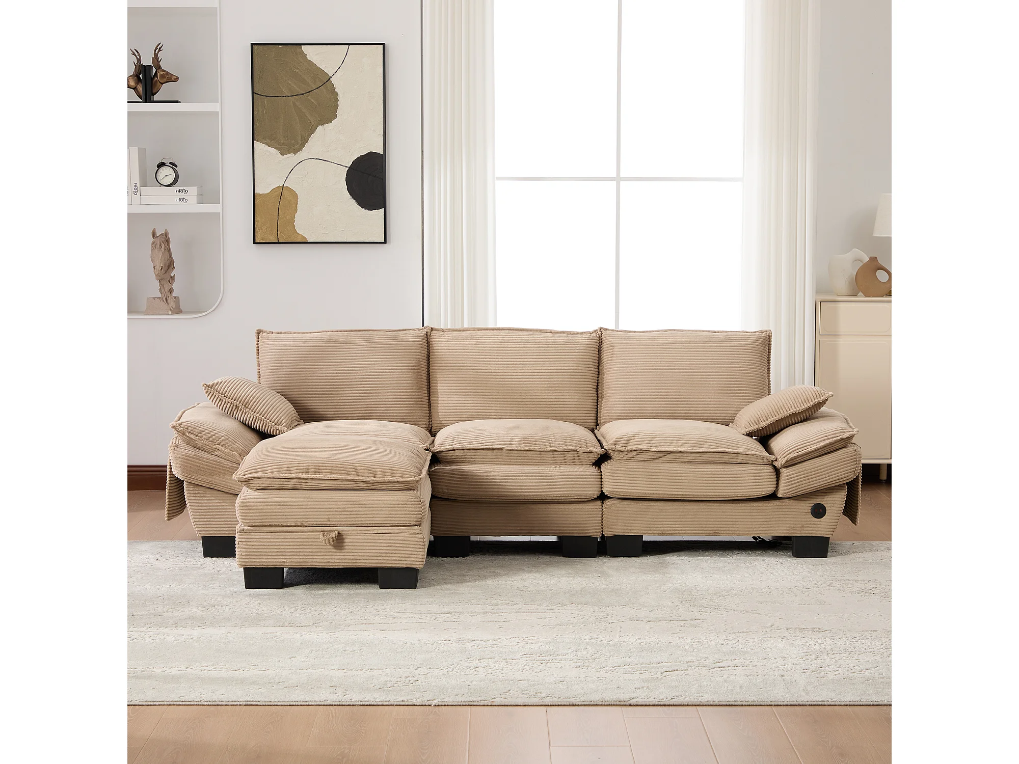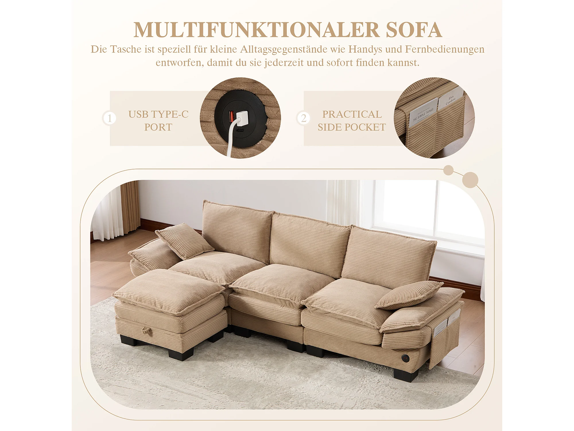 Ensemble canapé 3 places en velours côtelé - 260 x 132 x 84 cm - avec 1 pouf de rangement + USB + poches - kaki