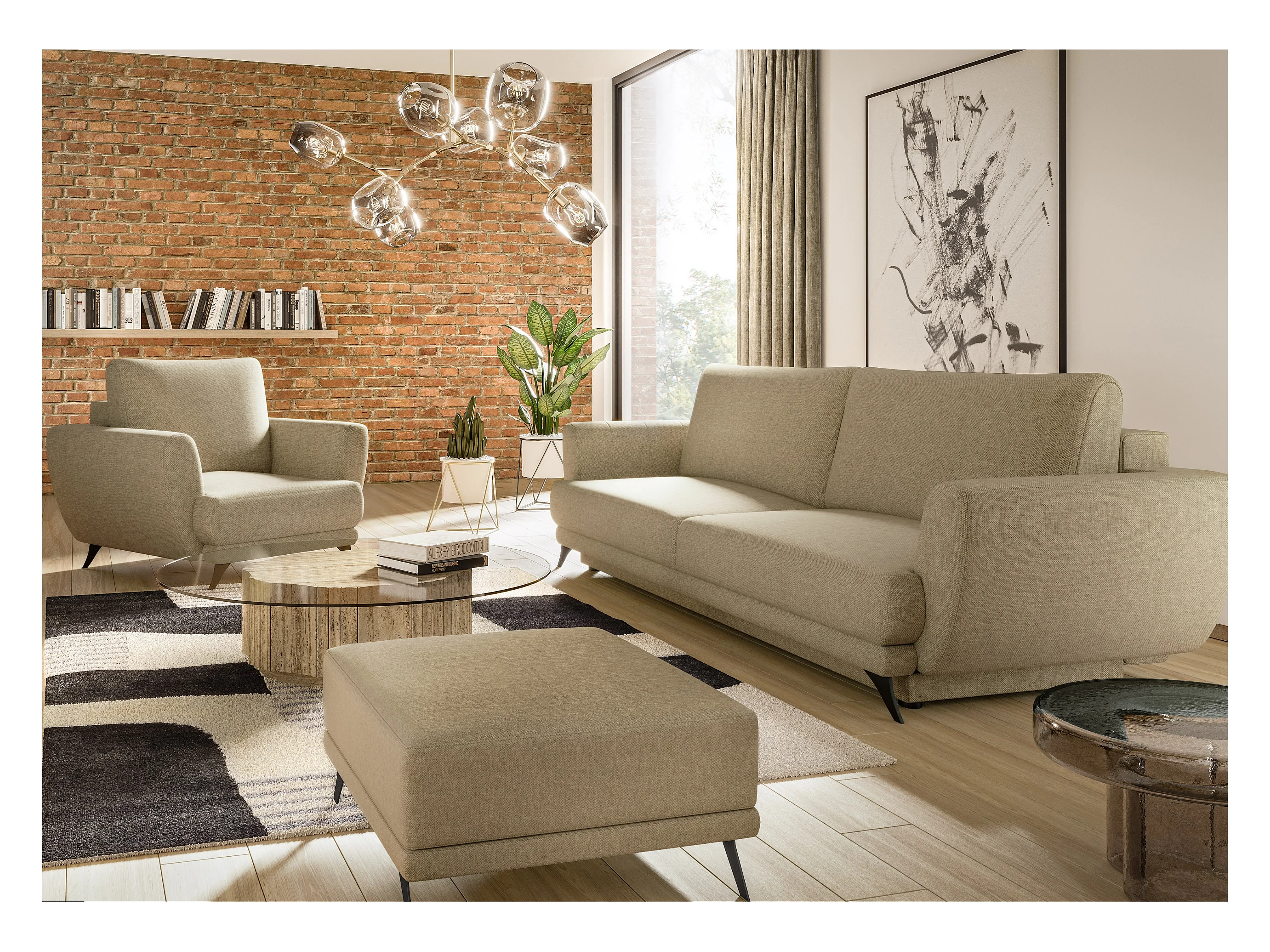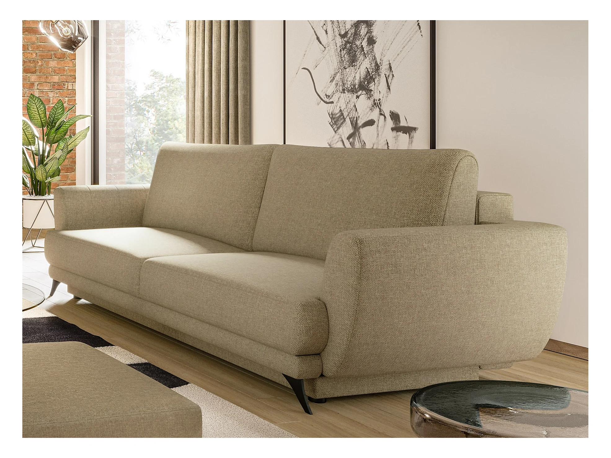 Ensemble canapé convertible tissu marron clair Zora - 1 canapé 3 places + 1 fauteuil + 1 pouf