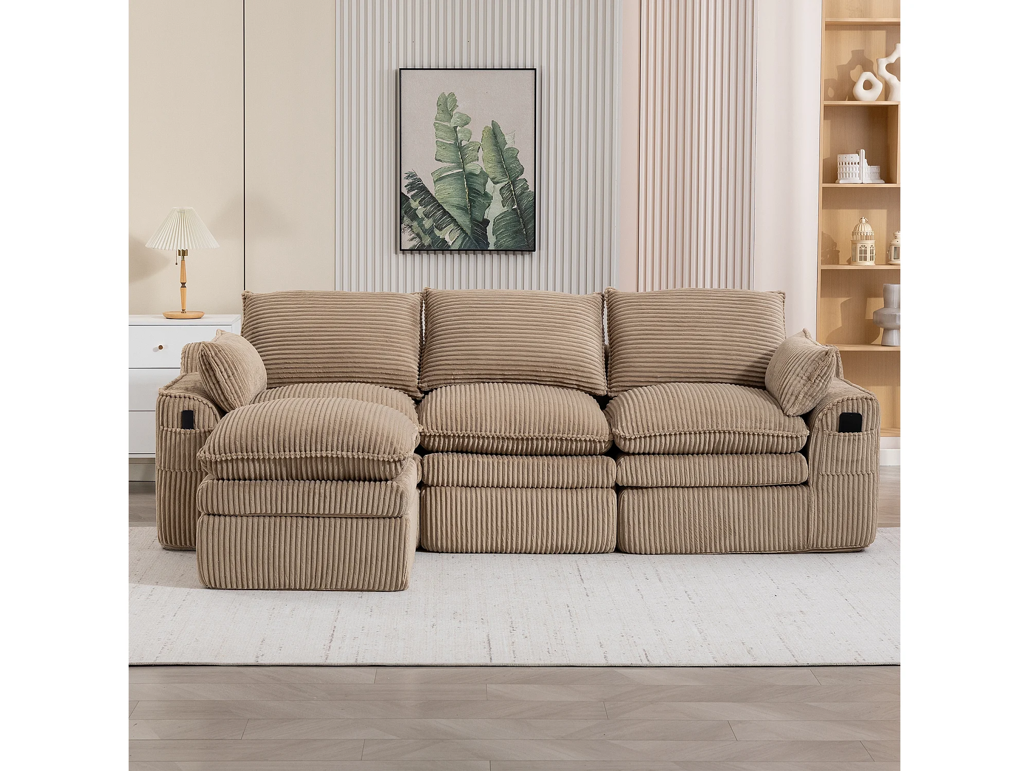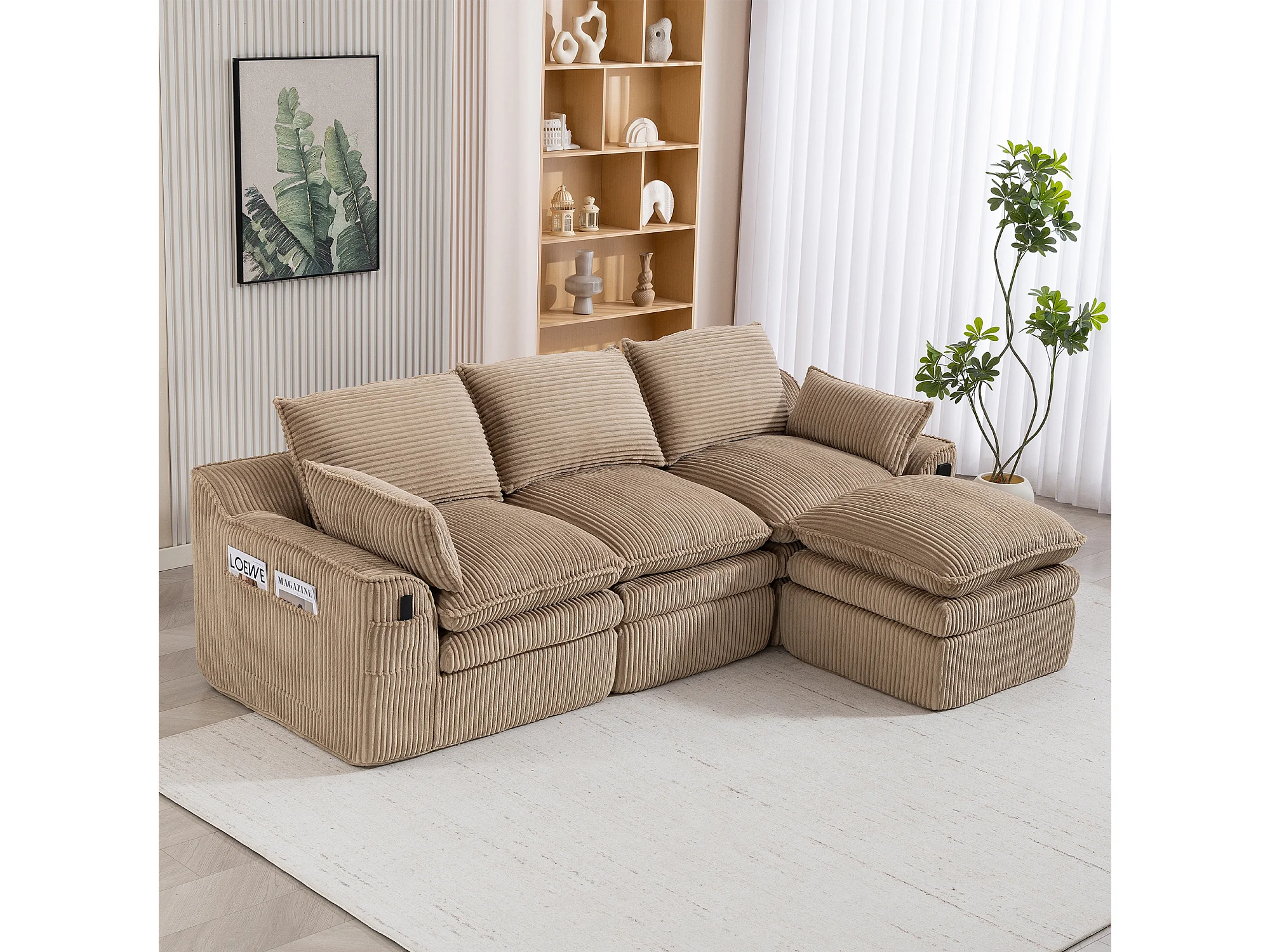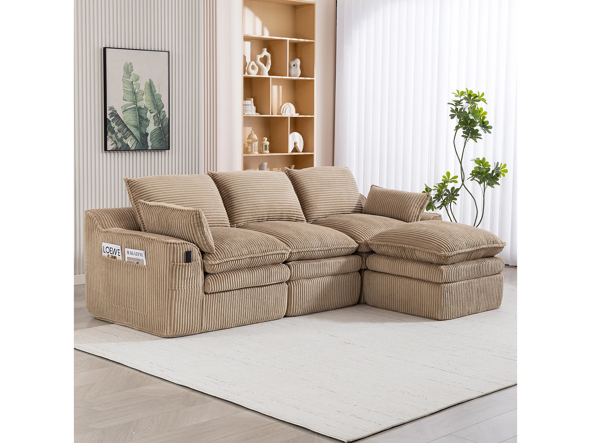 Ensemble canapé modulable 3 places en velours côtelé - 263 x 167 x 85 cm - avec 1 pouf + coussins + 2 poches - kaki