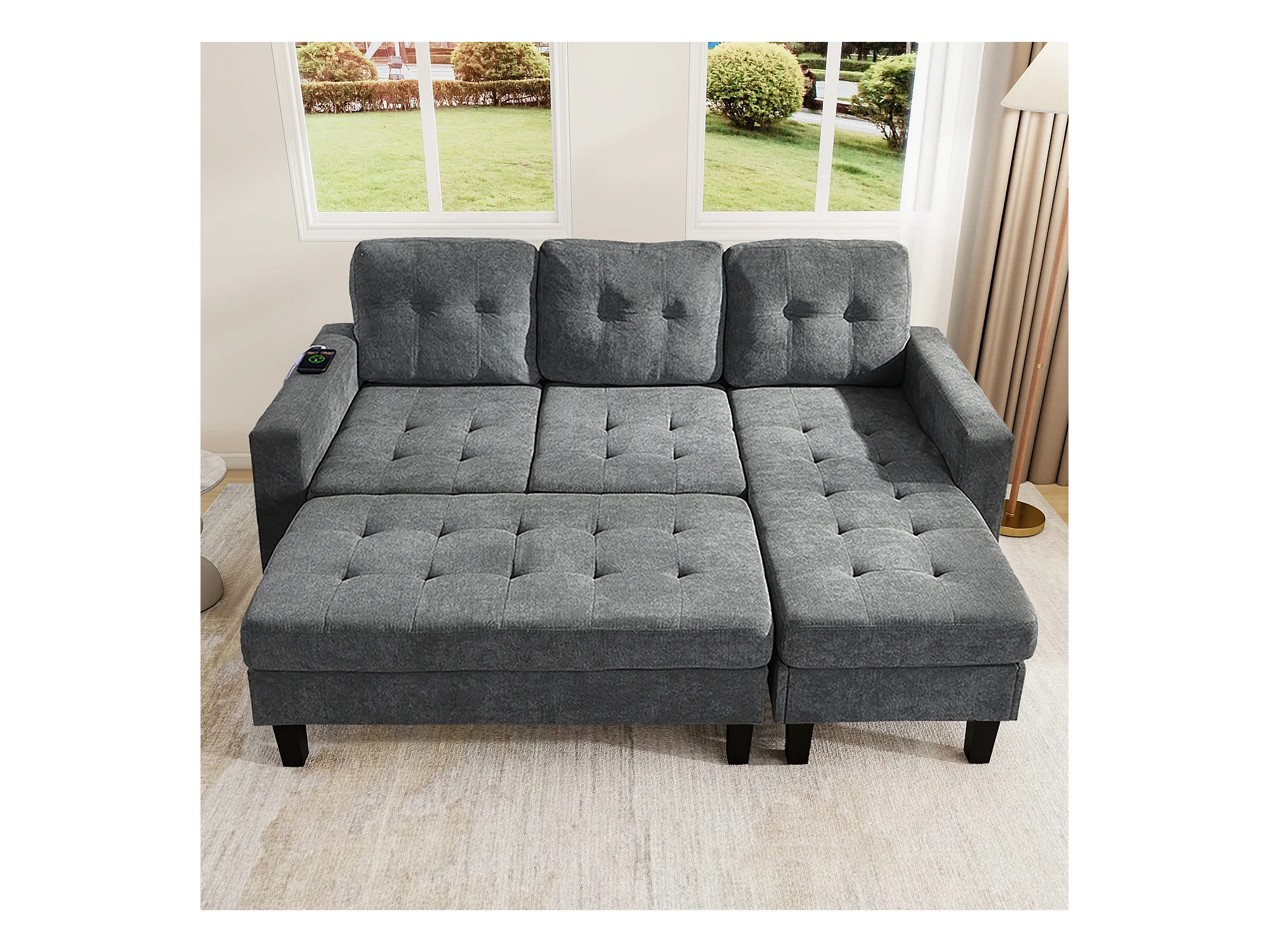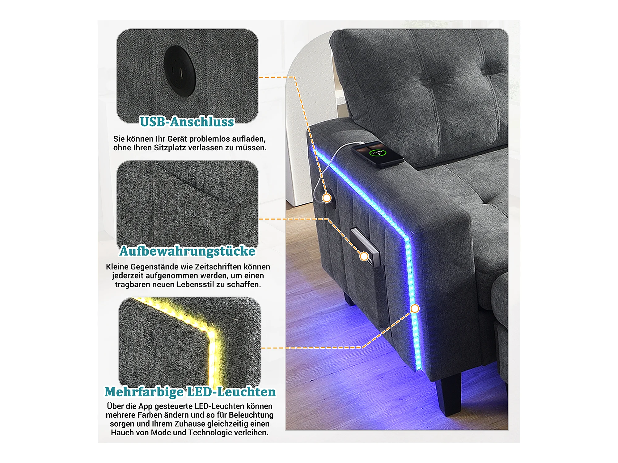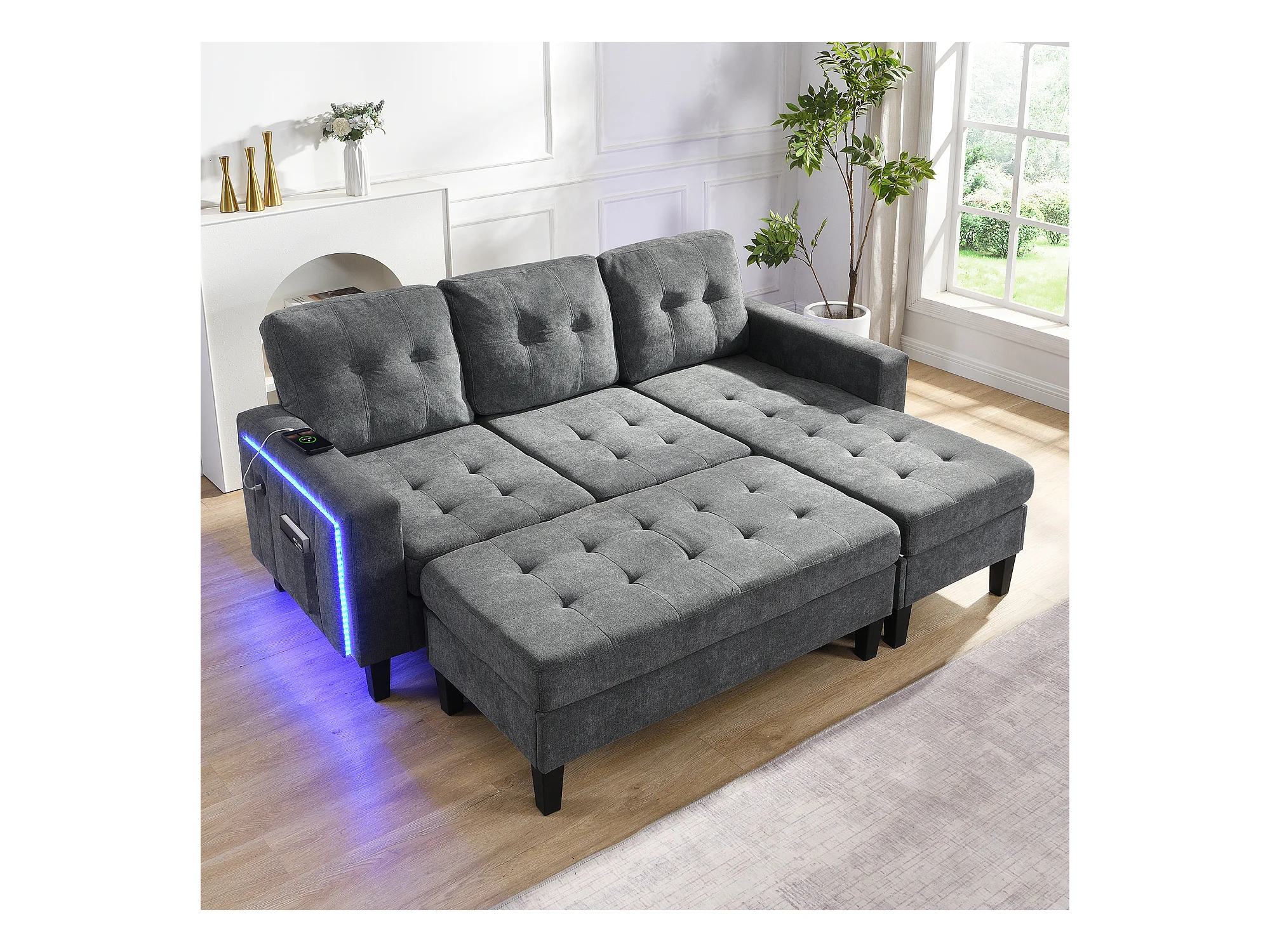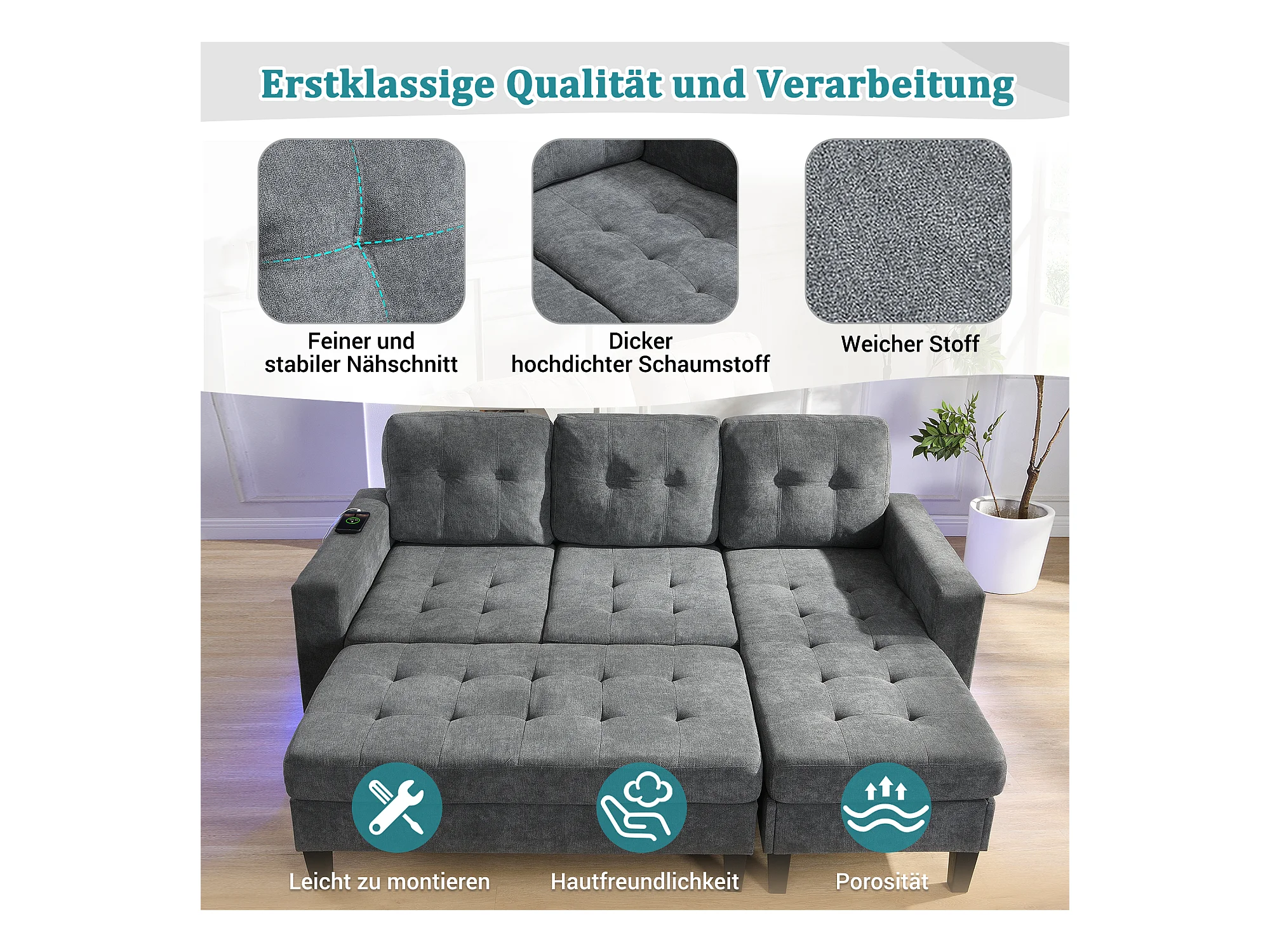 Ensemble de canapé de salon 3 places - 185 x 135 x 85 cm - avec repose-pieds mobile + Leds - velours - gris