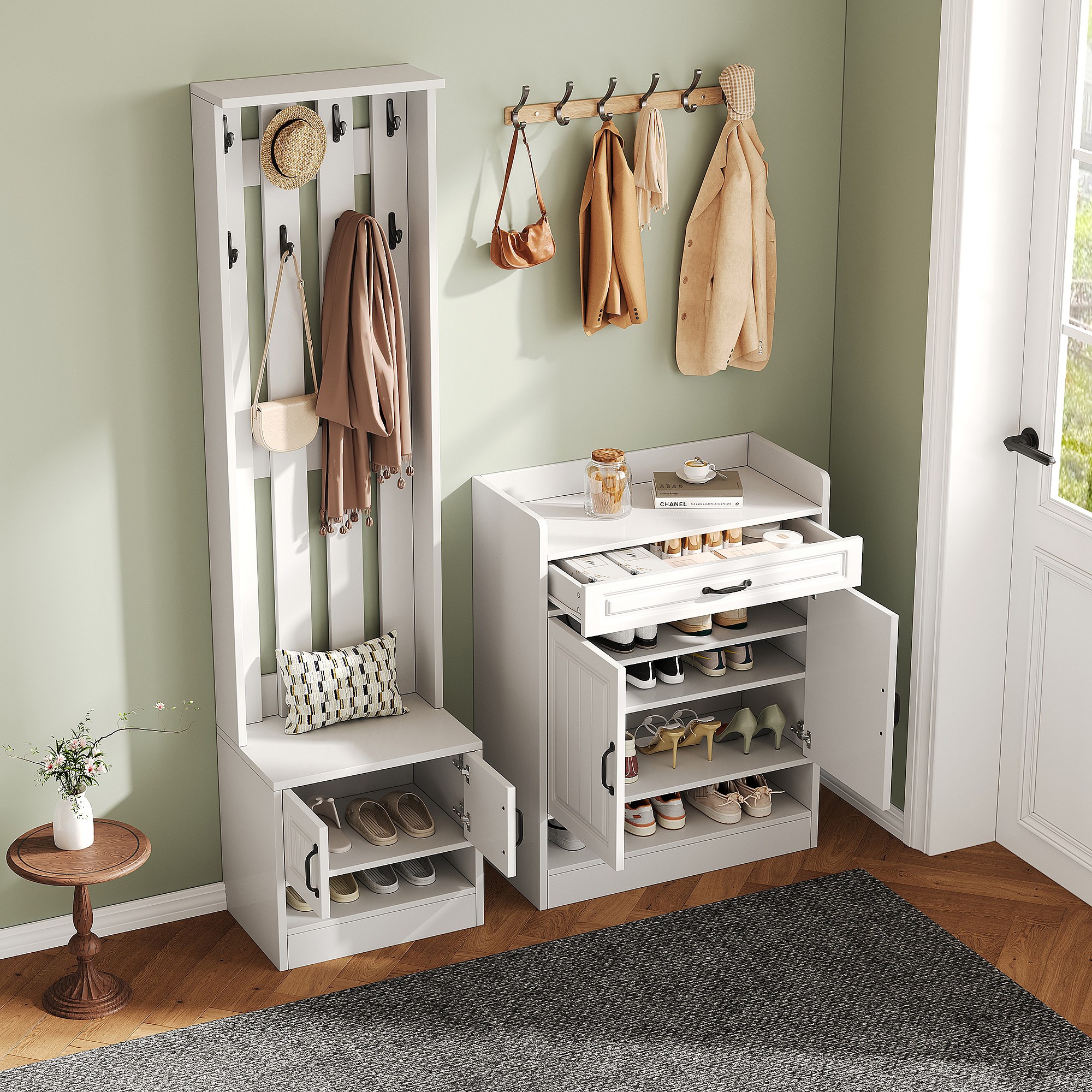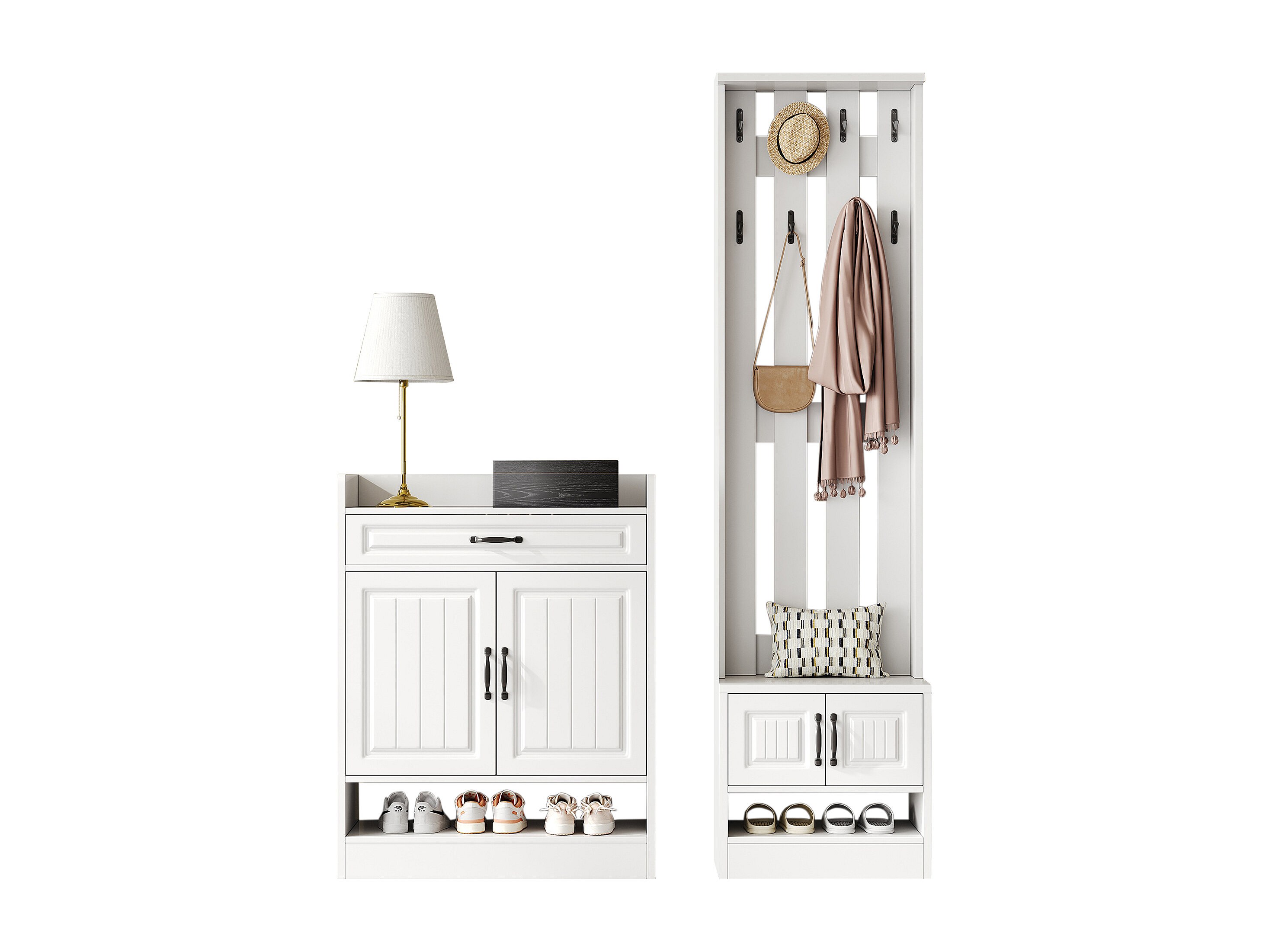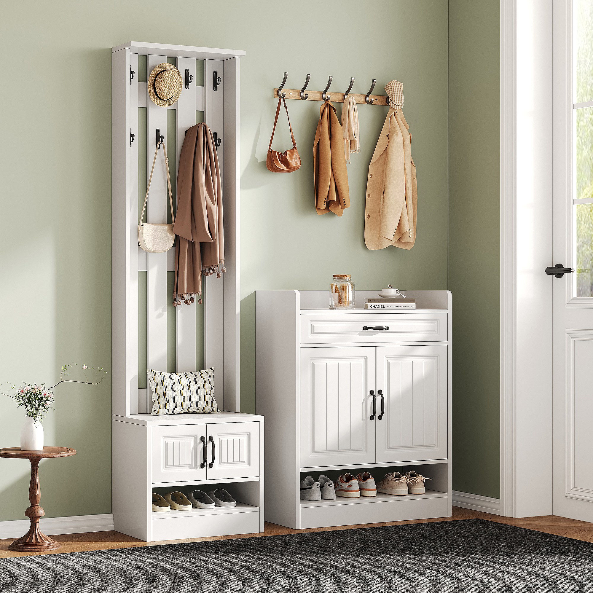 Ensemble de garde-robe avec banc à chaussures et meuble à chaussures + 8 crochets + 4 portes + 1 tiroir - aggloméré - blanc