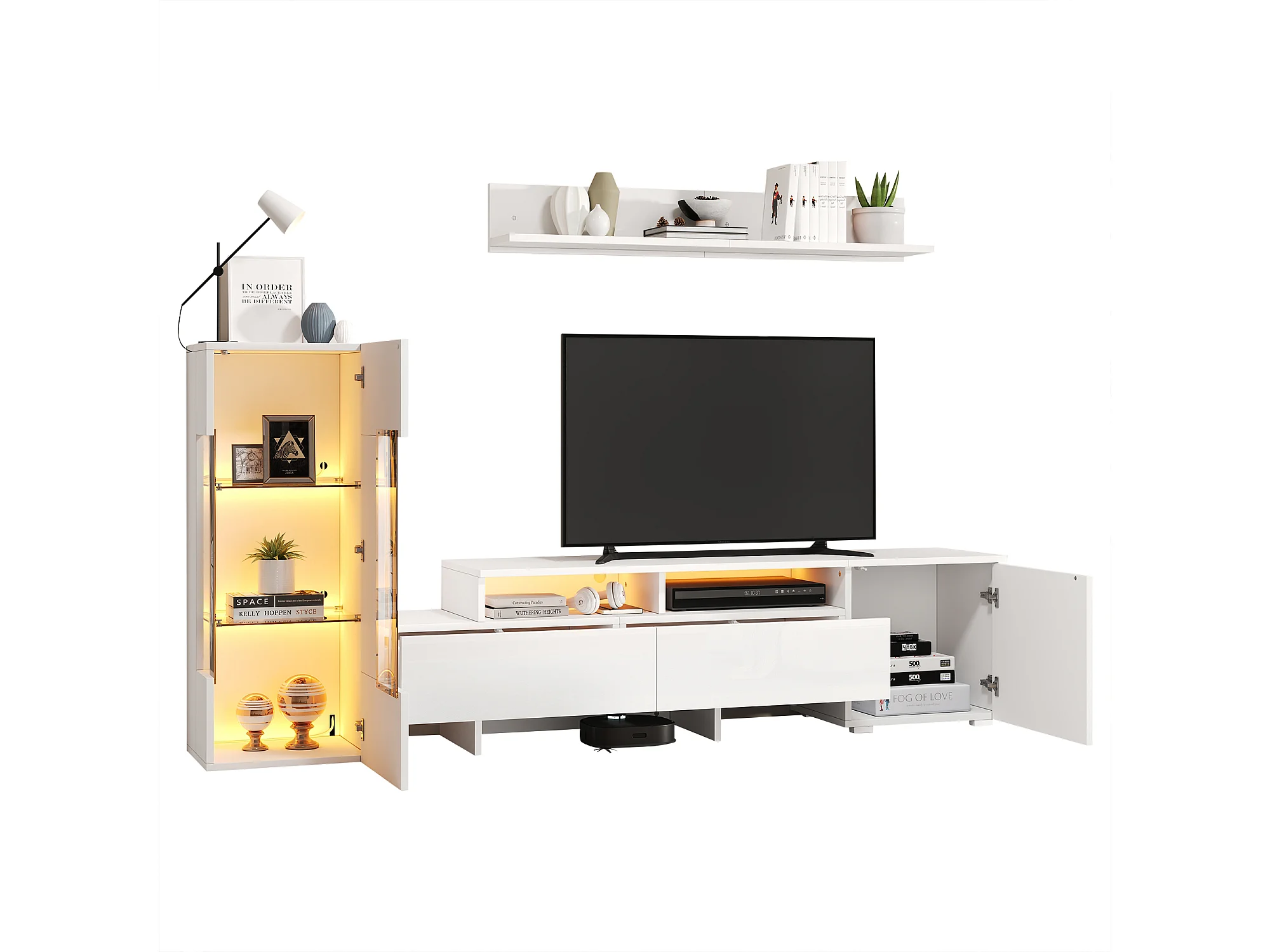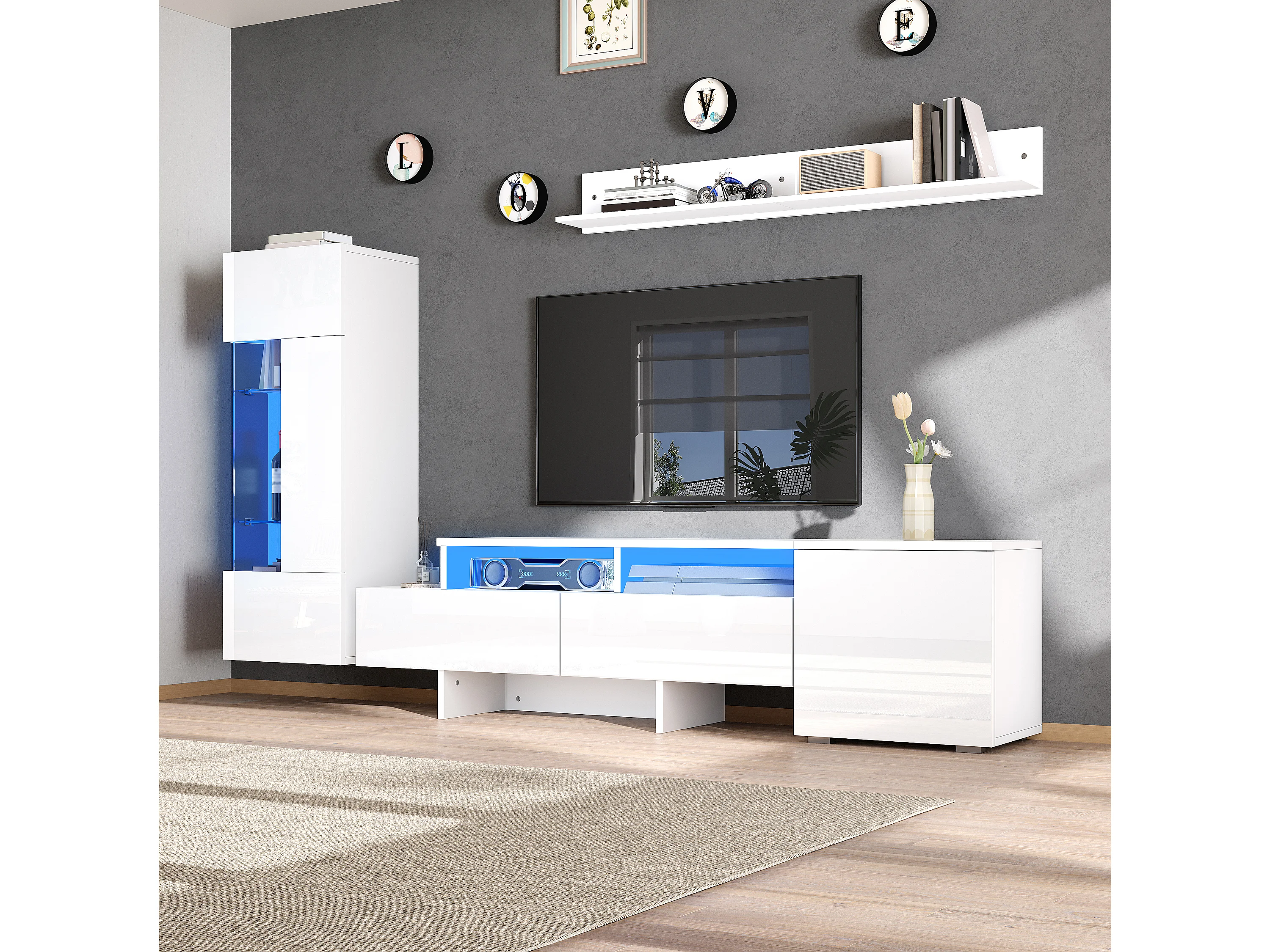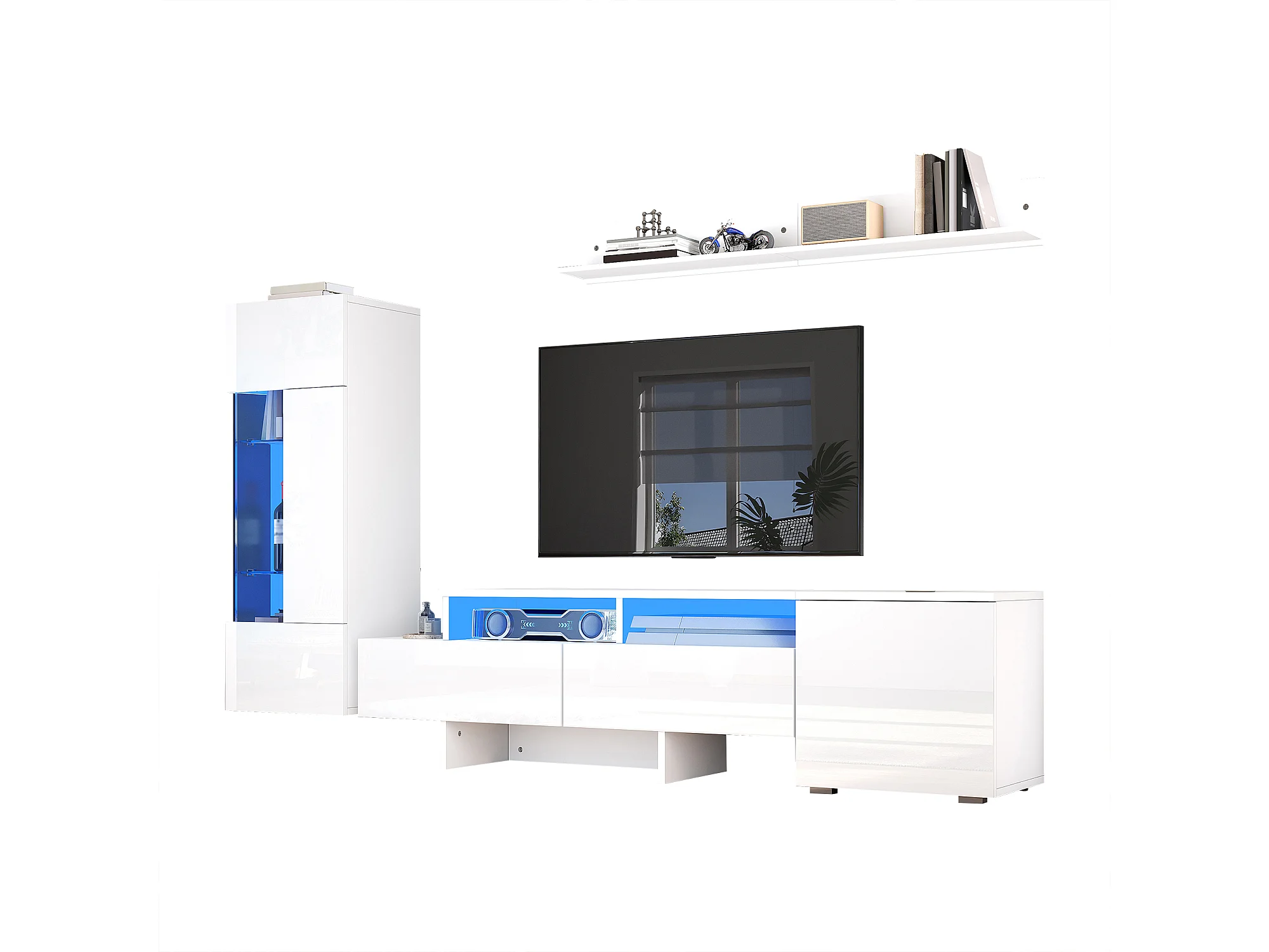 Ensemble de meuble TV haute brillance mural 3 pièces - meuble TV + meuble mural + étagère mural - avec Leds - aggloméré - blanc