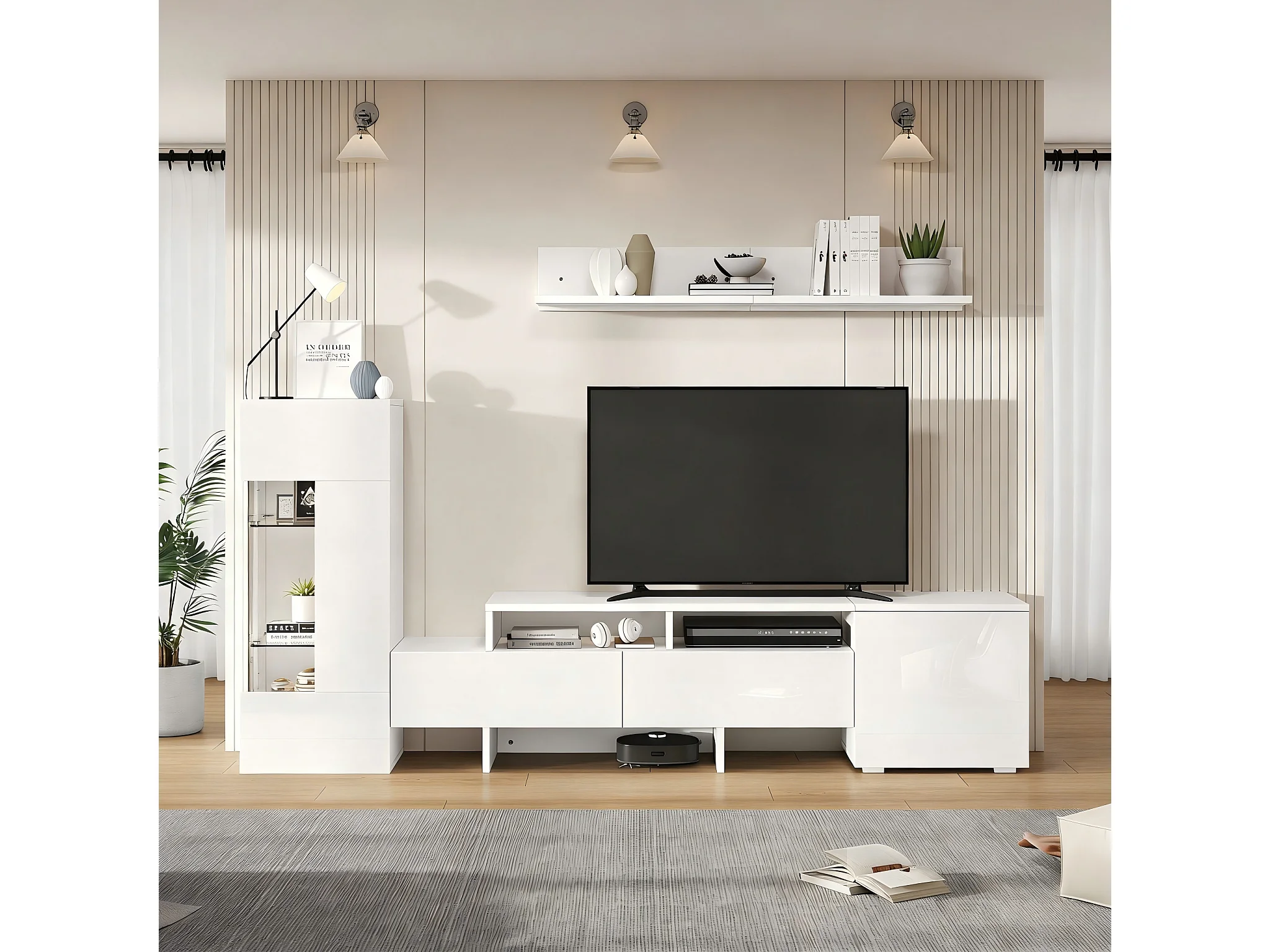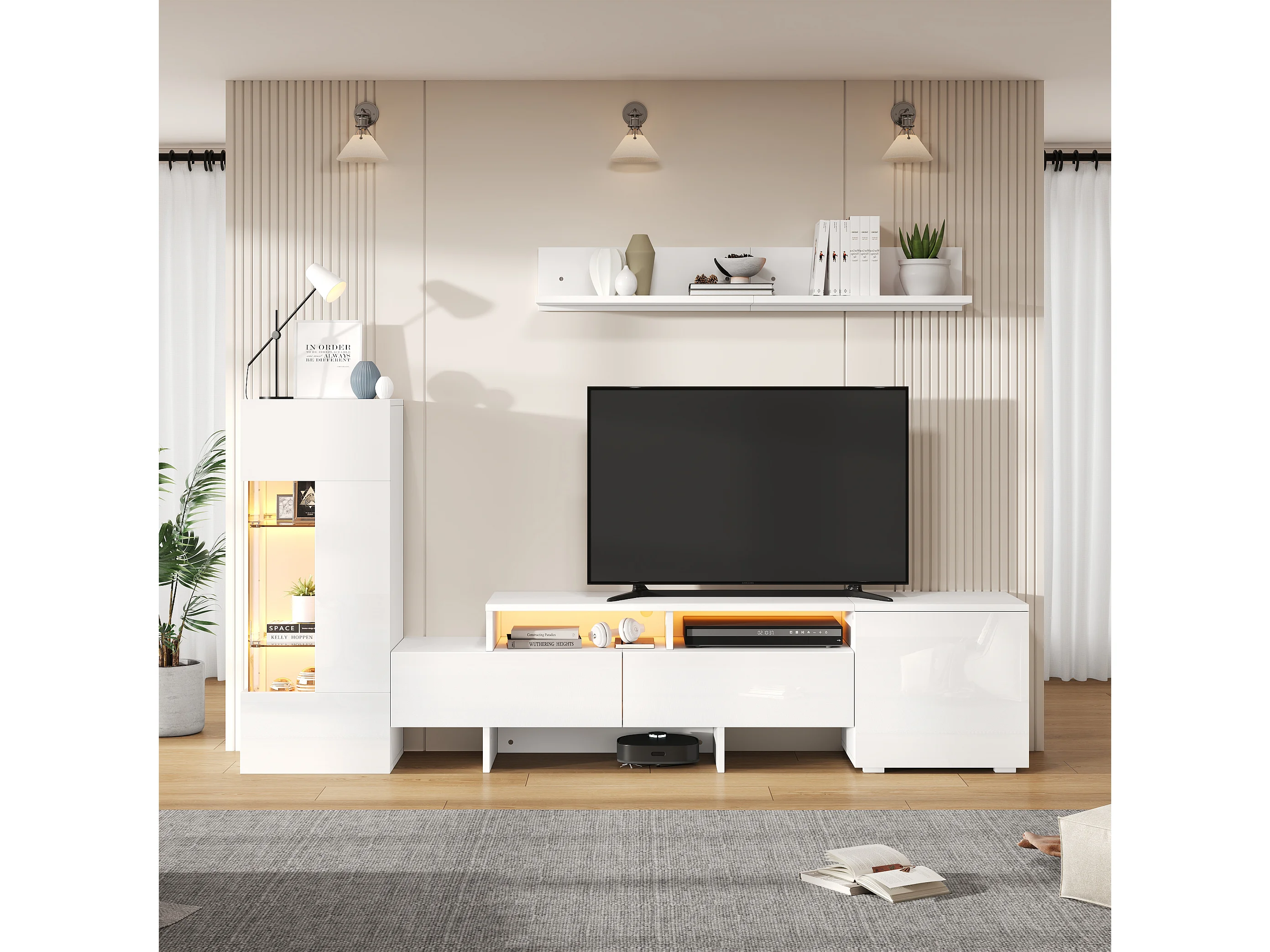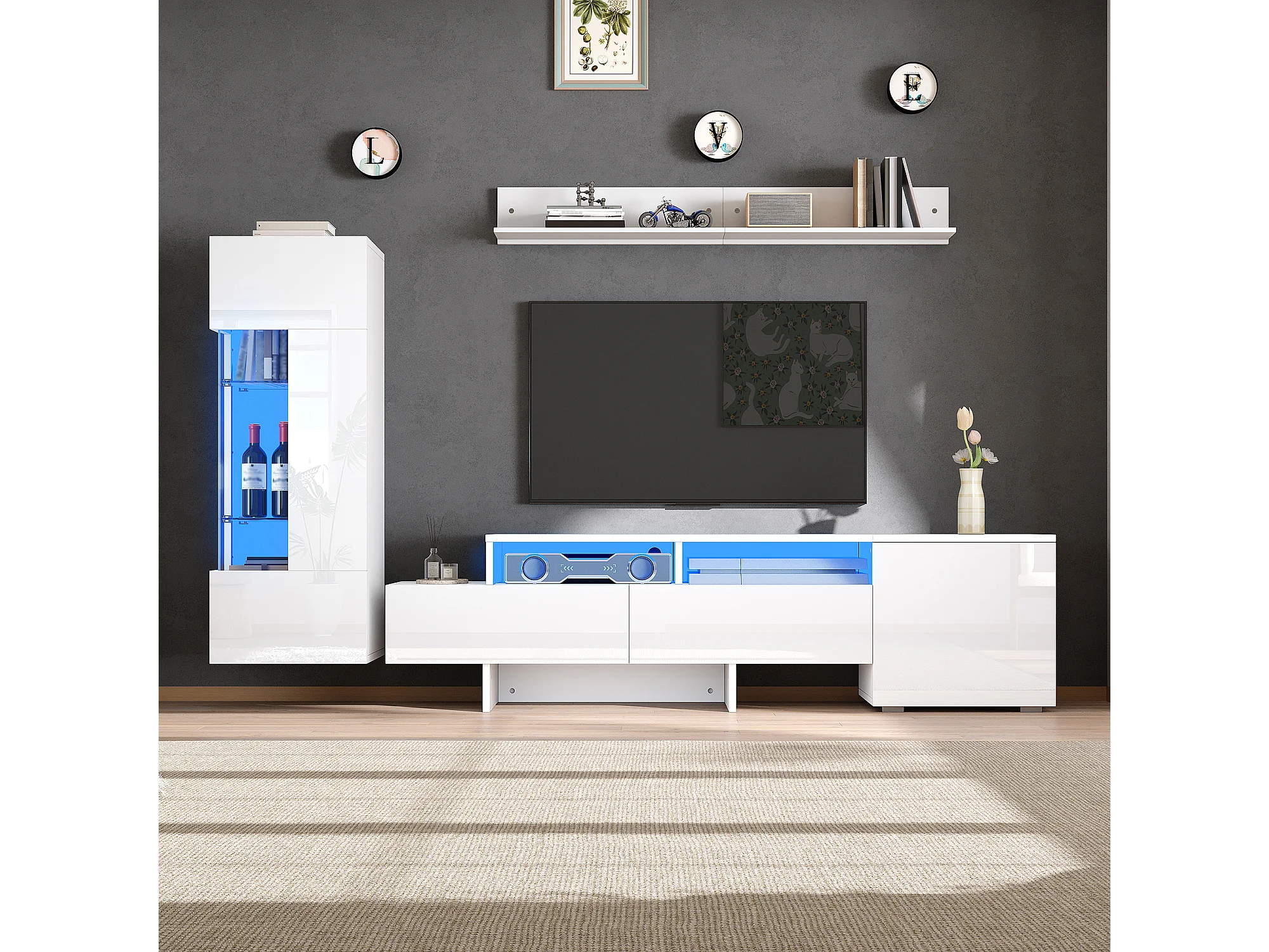 Ensemble de meuble TV haute brillance mural 3 pièces - meuble TV + meuble mural + étagère mural - avec Leds - aggloméré - blanc