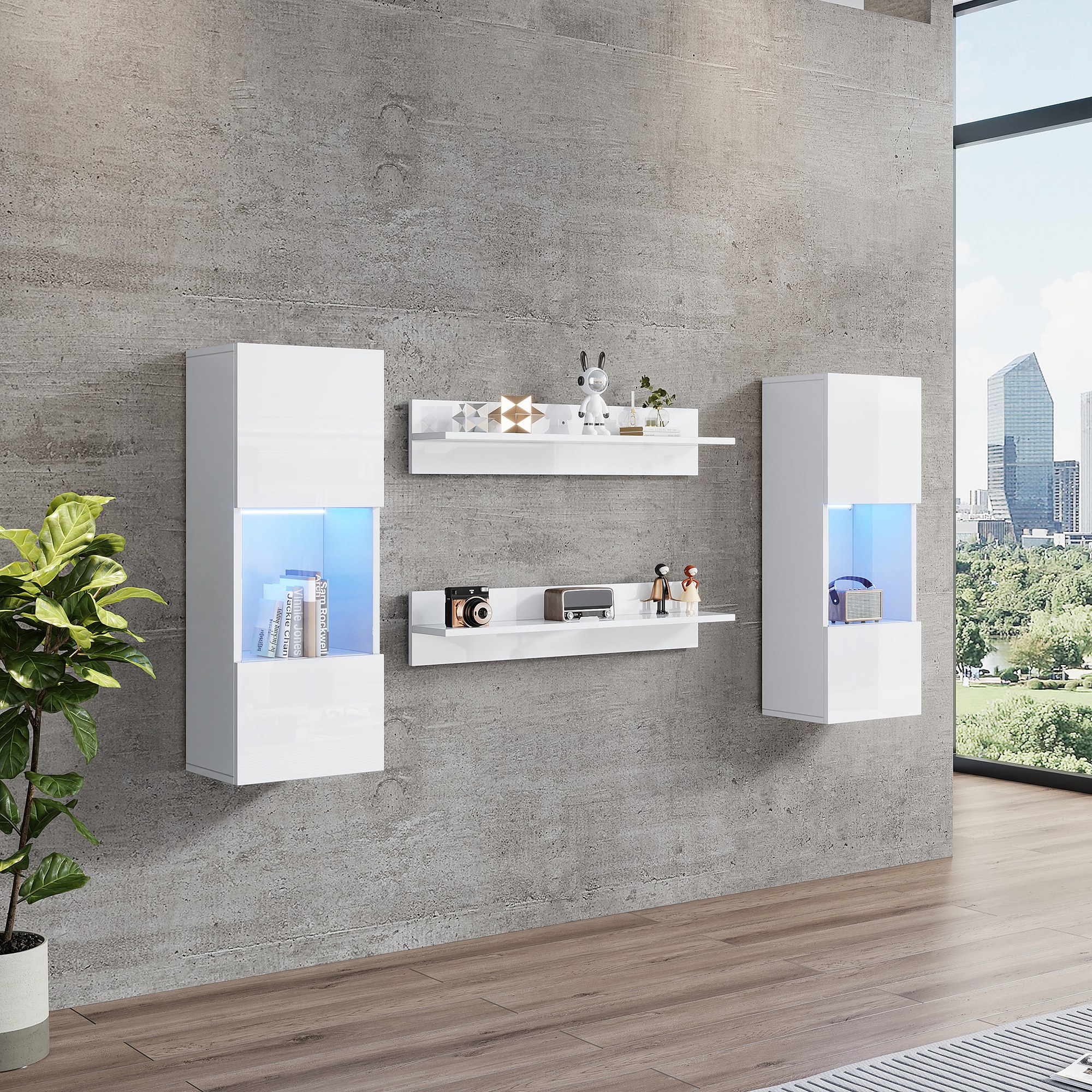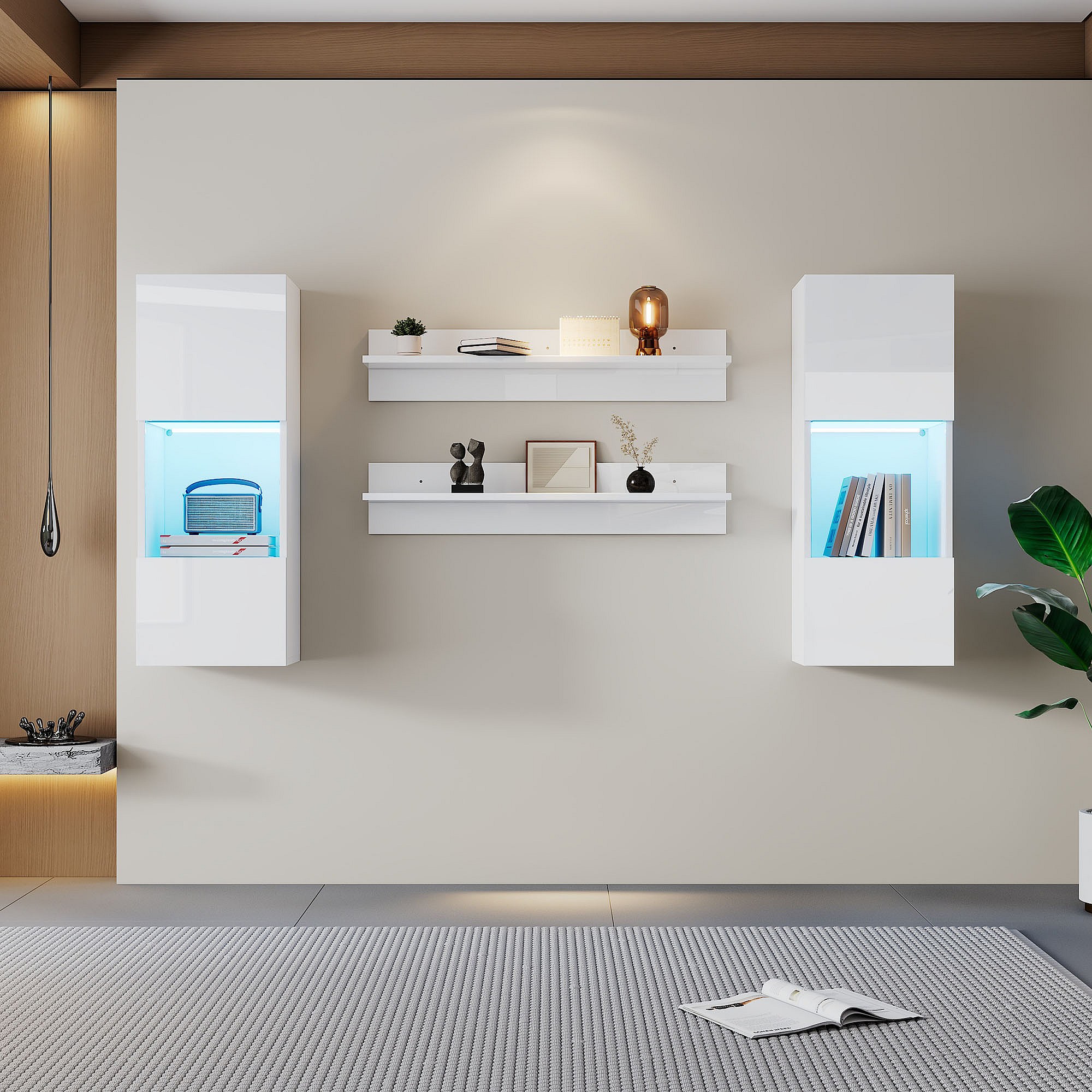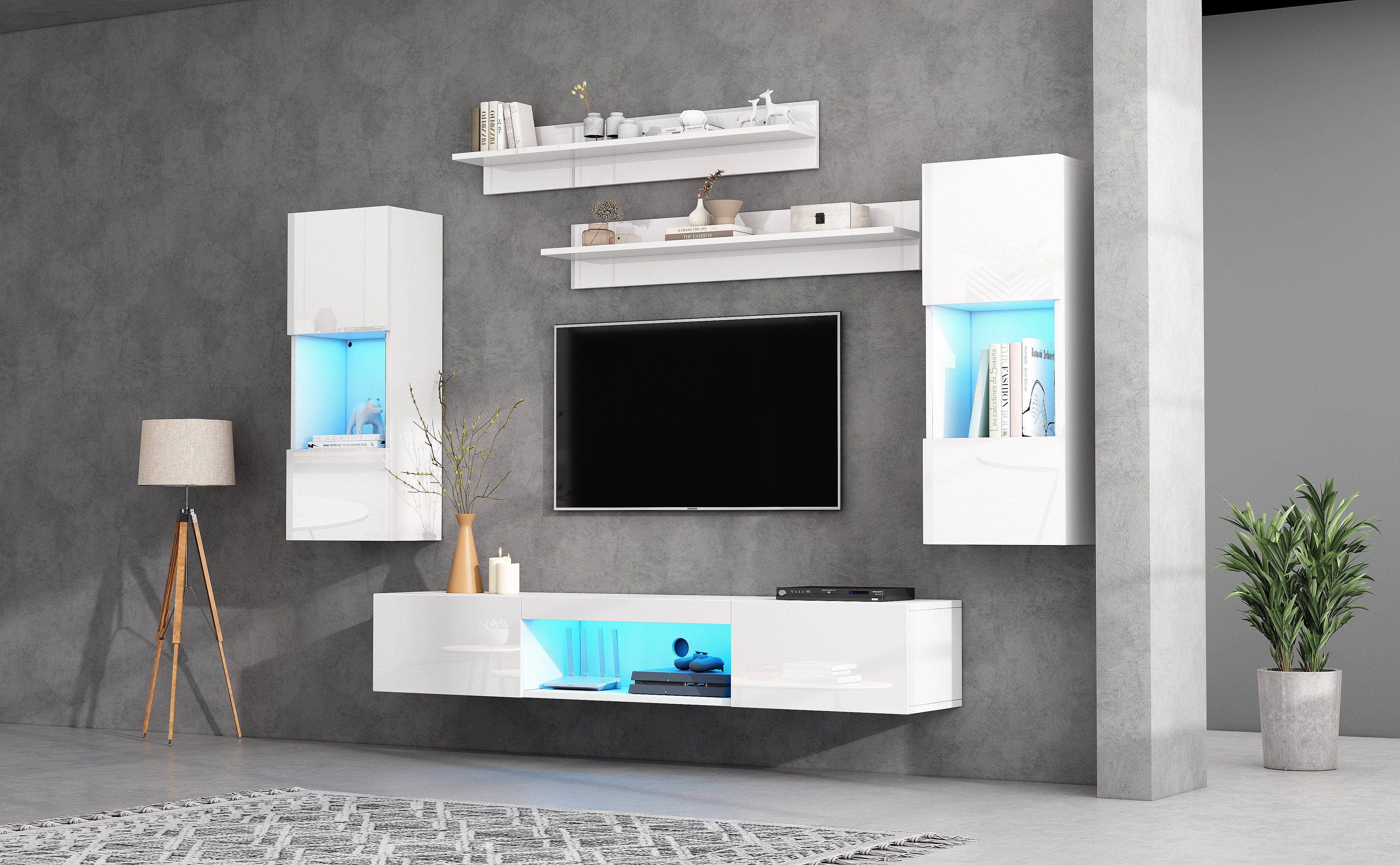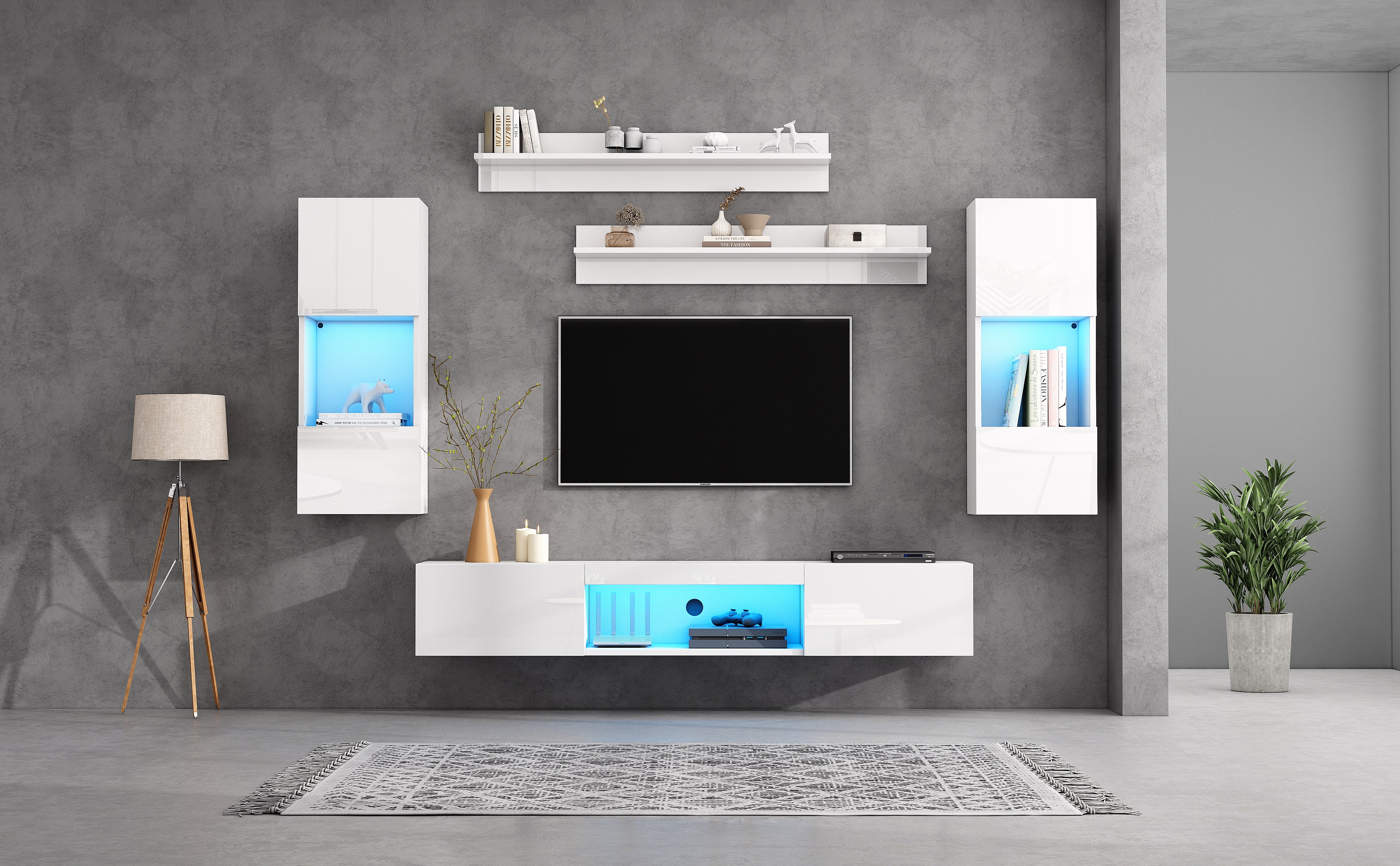 Ensemble de meubles muraux TV 5 pièces avec Leds - meuble TV + 2 armoires murales + 2 étagères suspendues - aggloméré - blanc