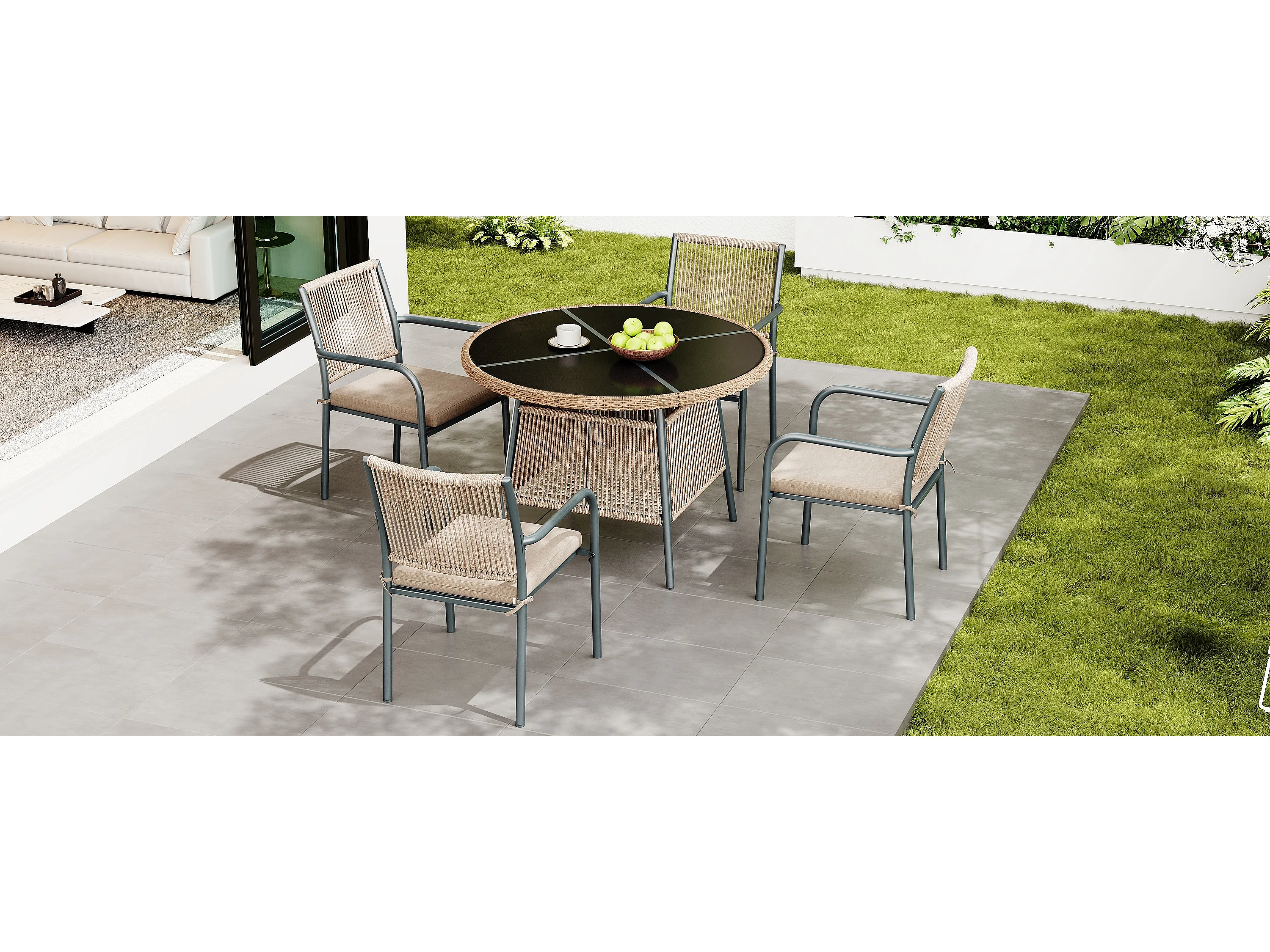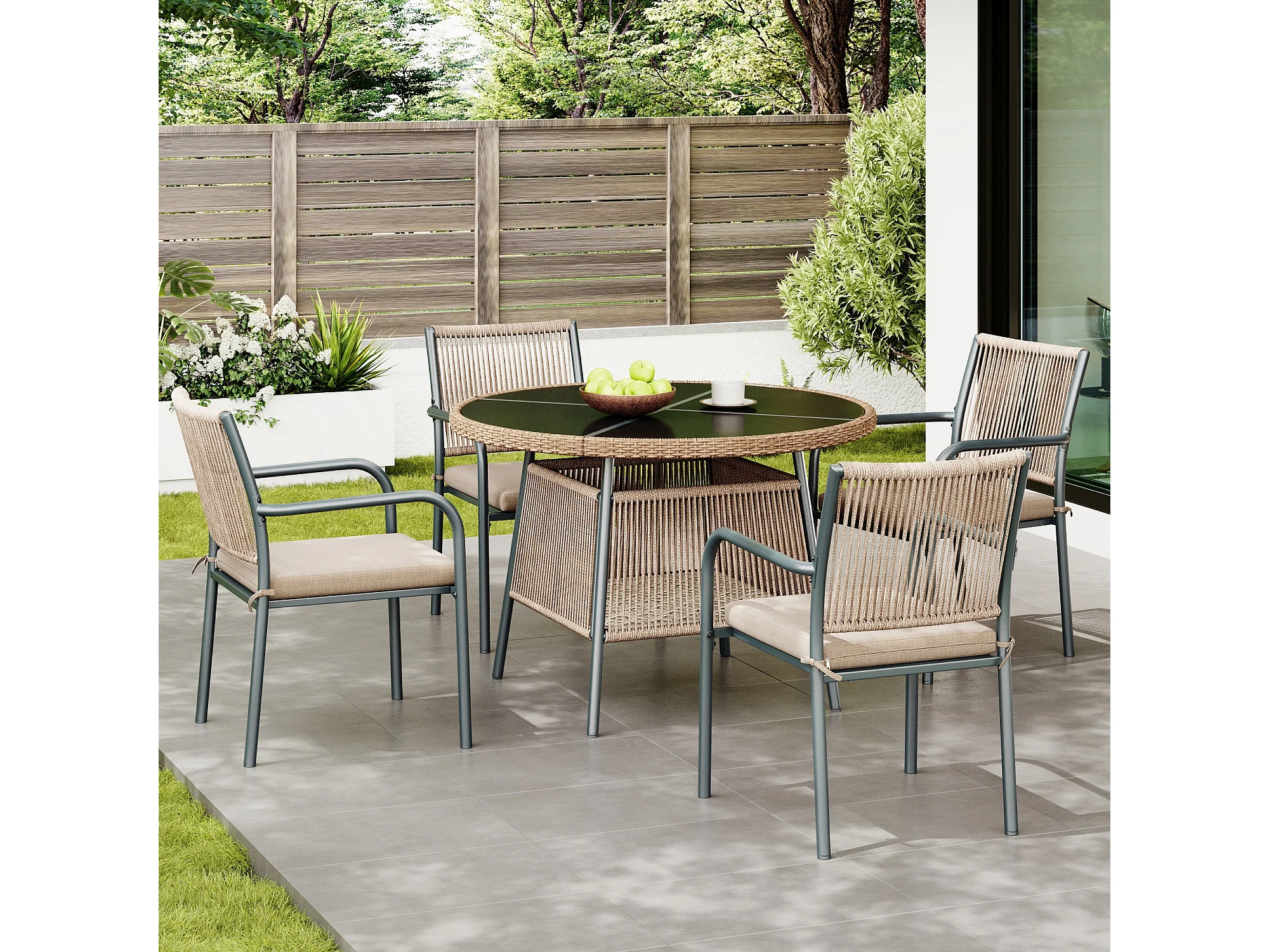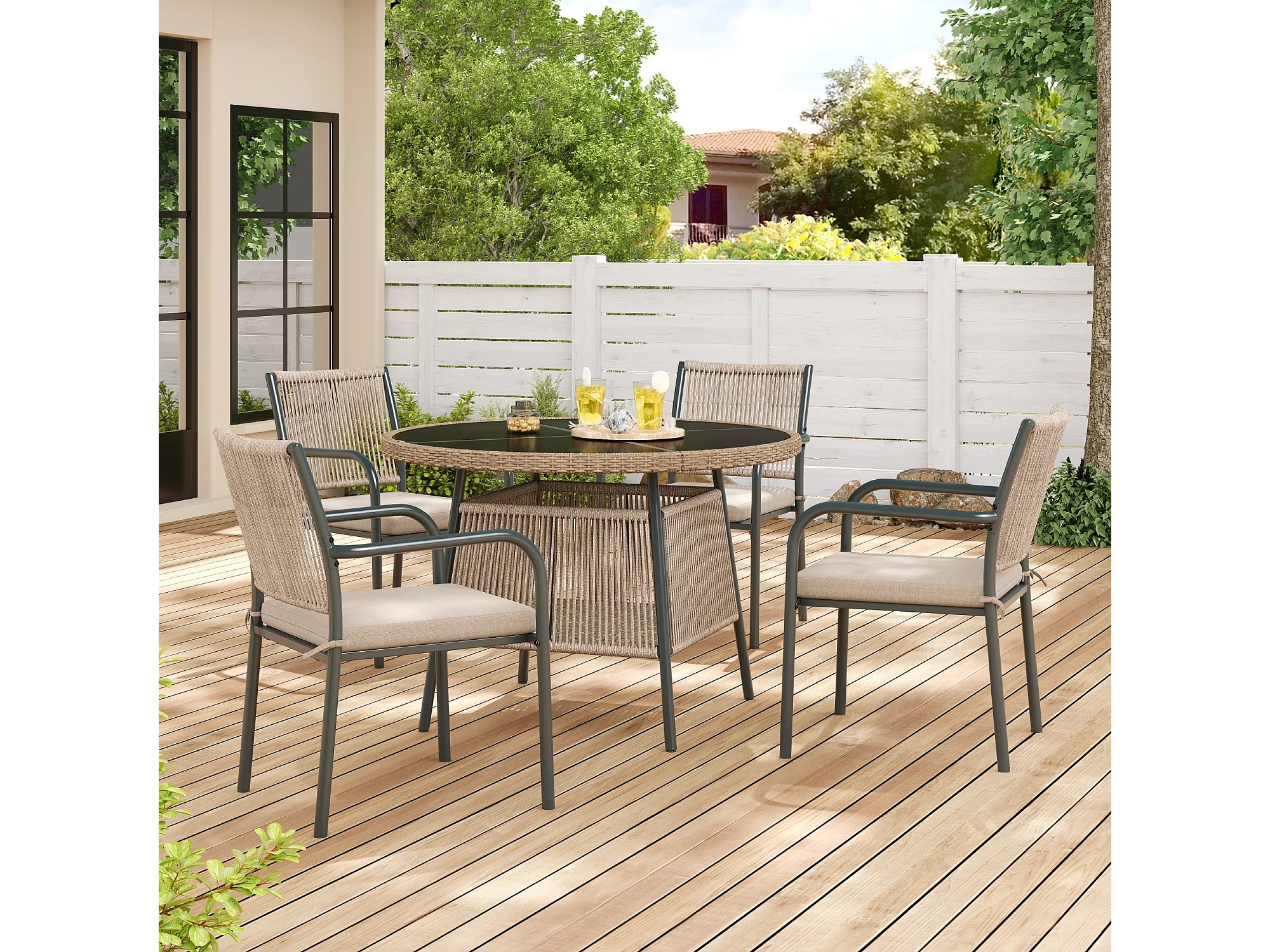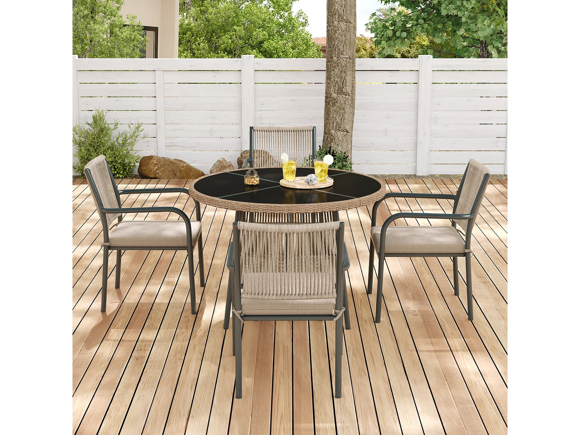 Ensemble de mobilier de jardin moderne en rotin - avec 1 table en verre + 4 fauteuils - métal - gris